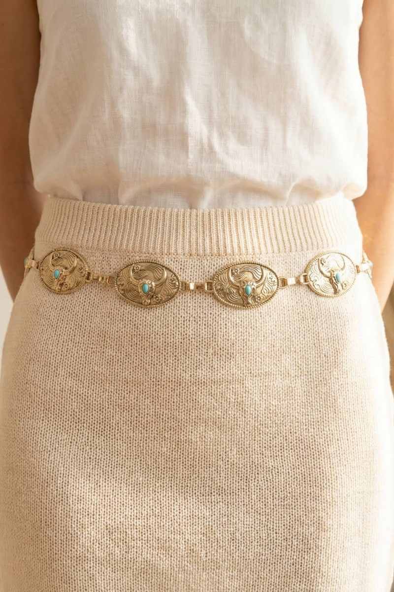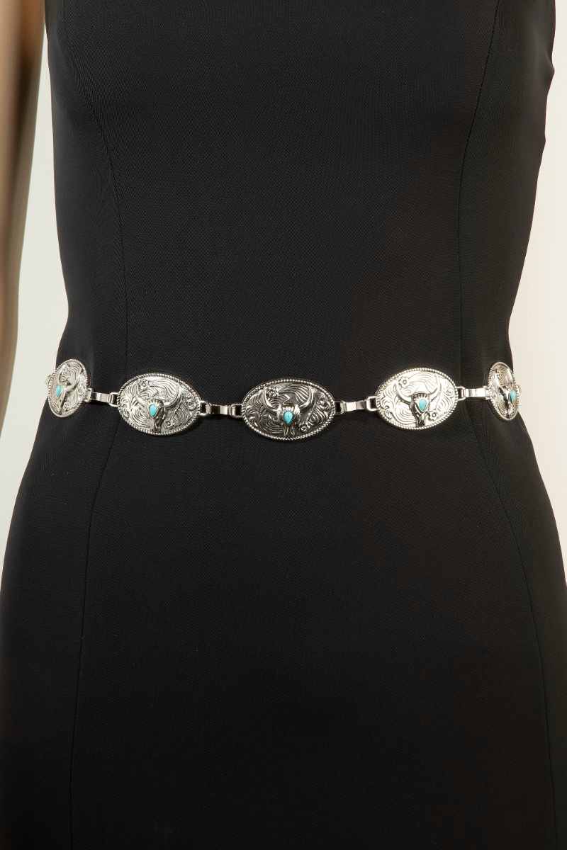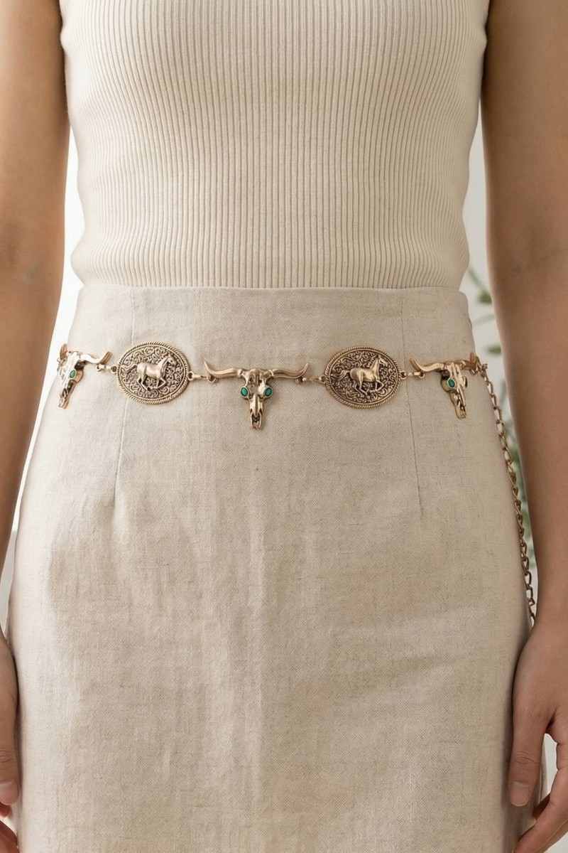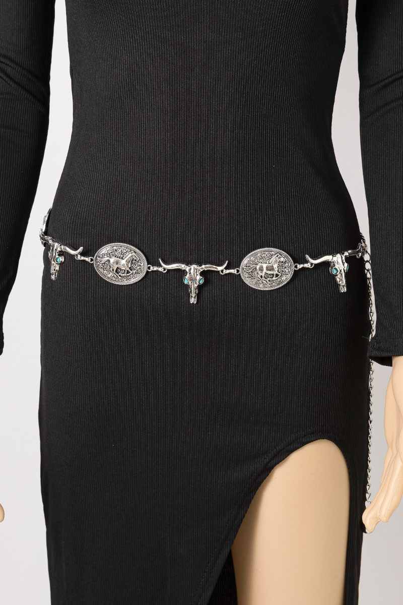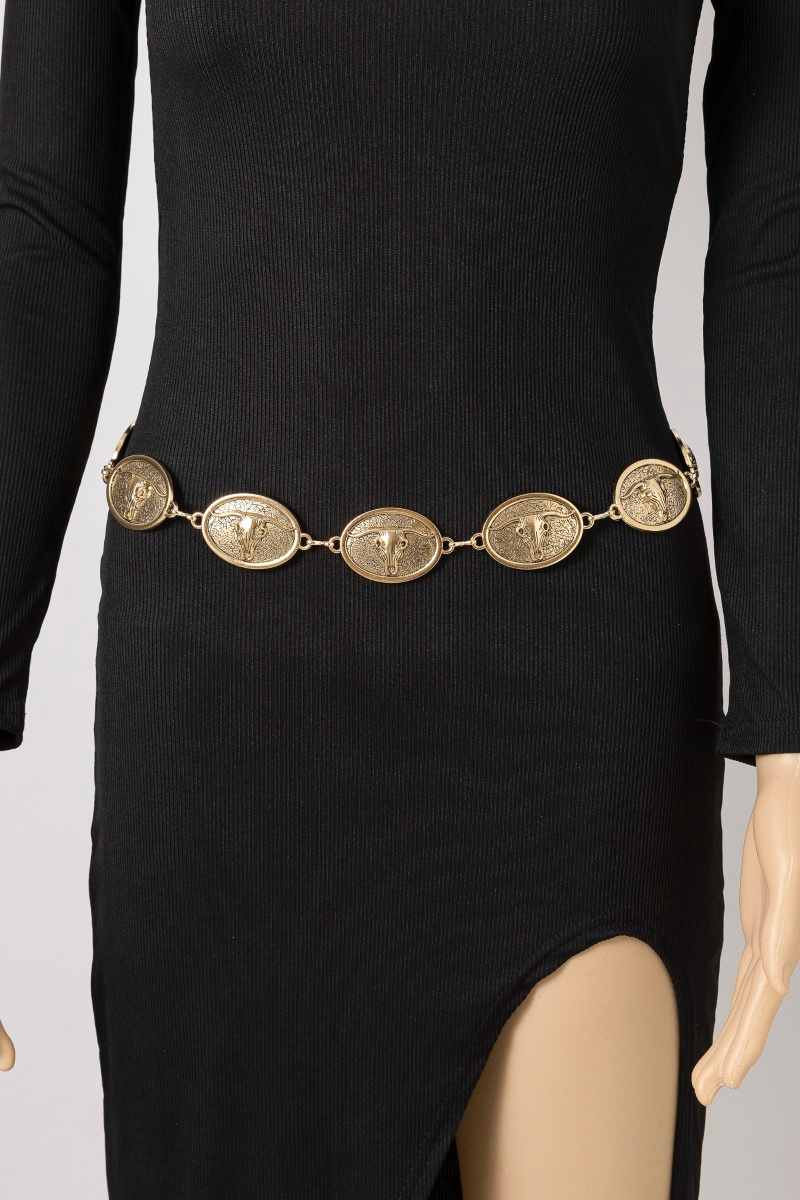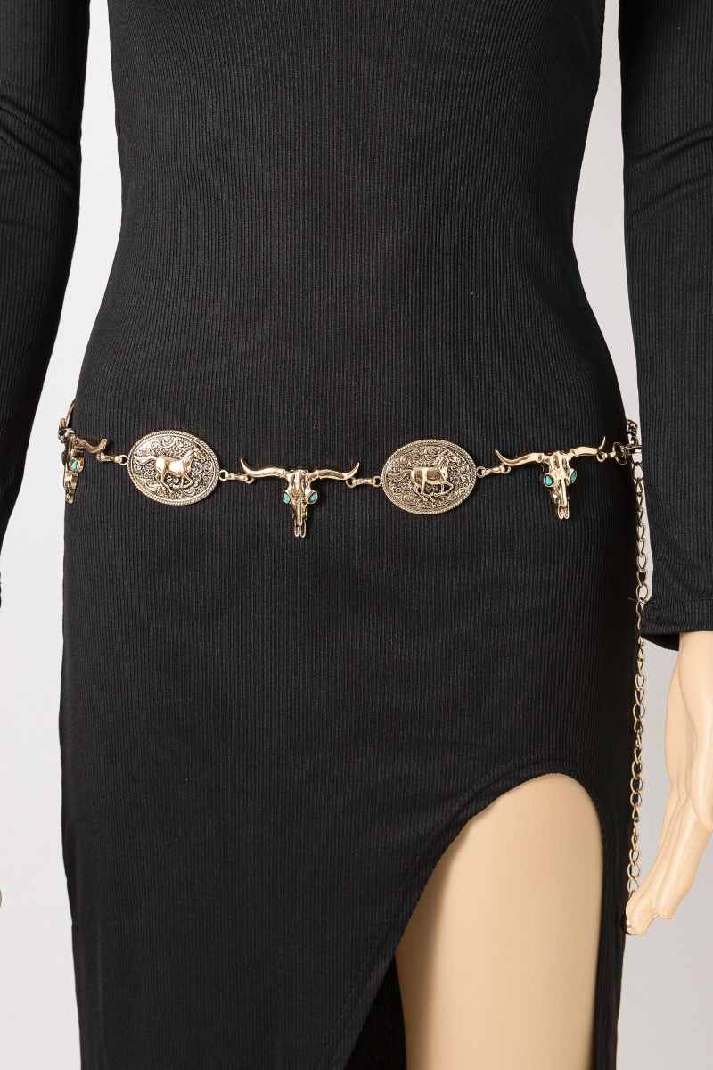 | Antique gold alloy chain belt with Western longhorn steer skulls. | |||