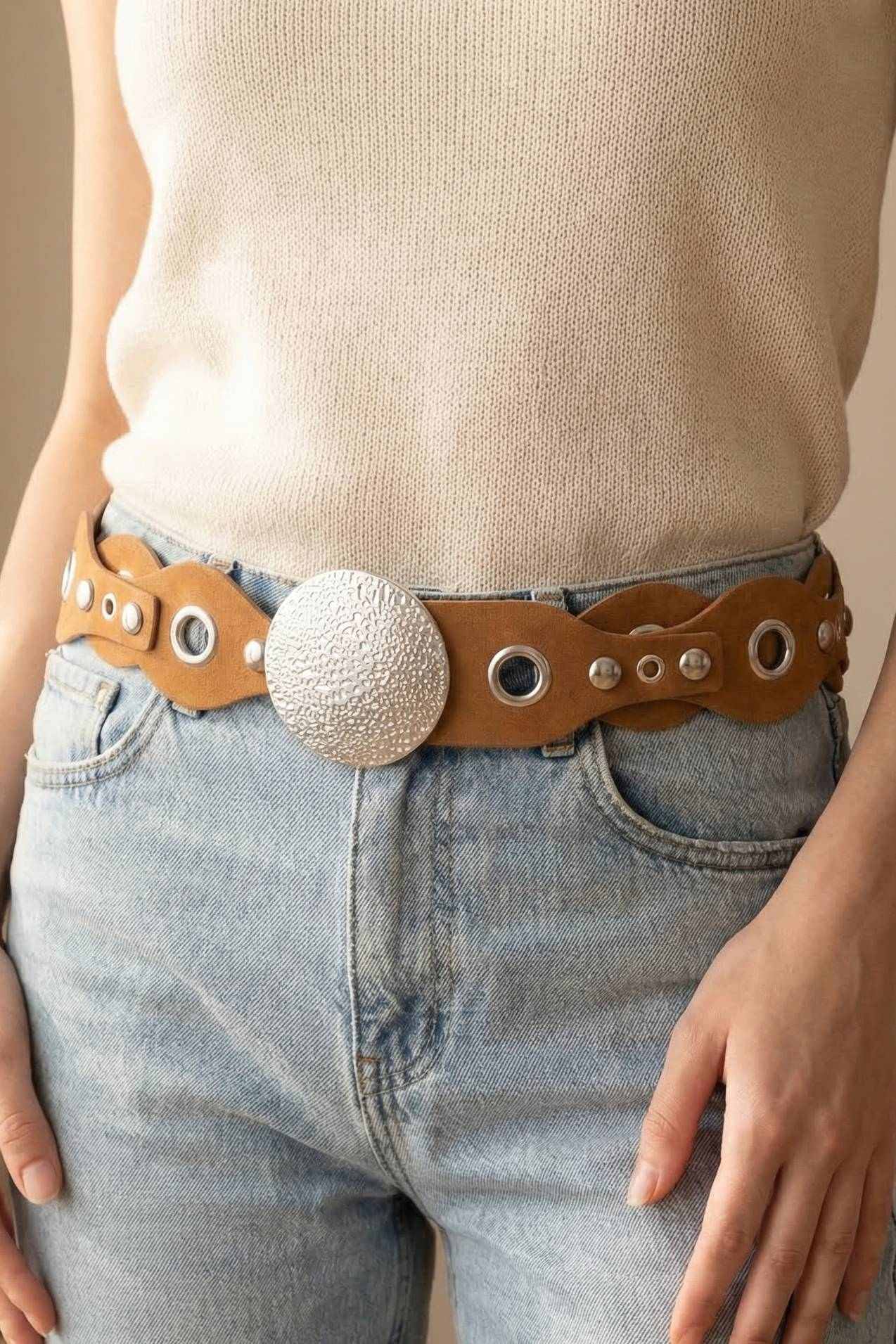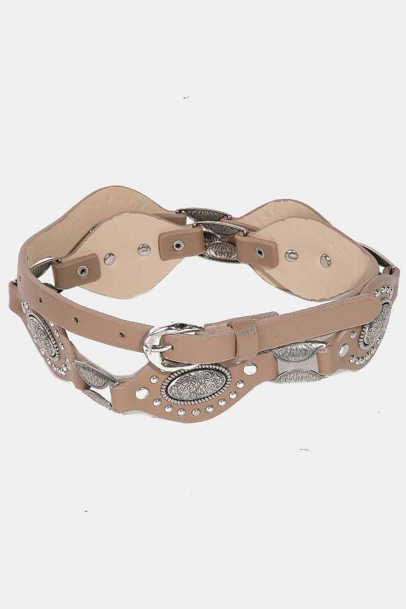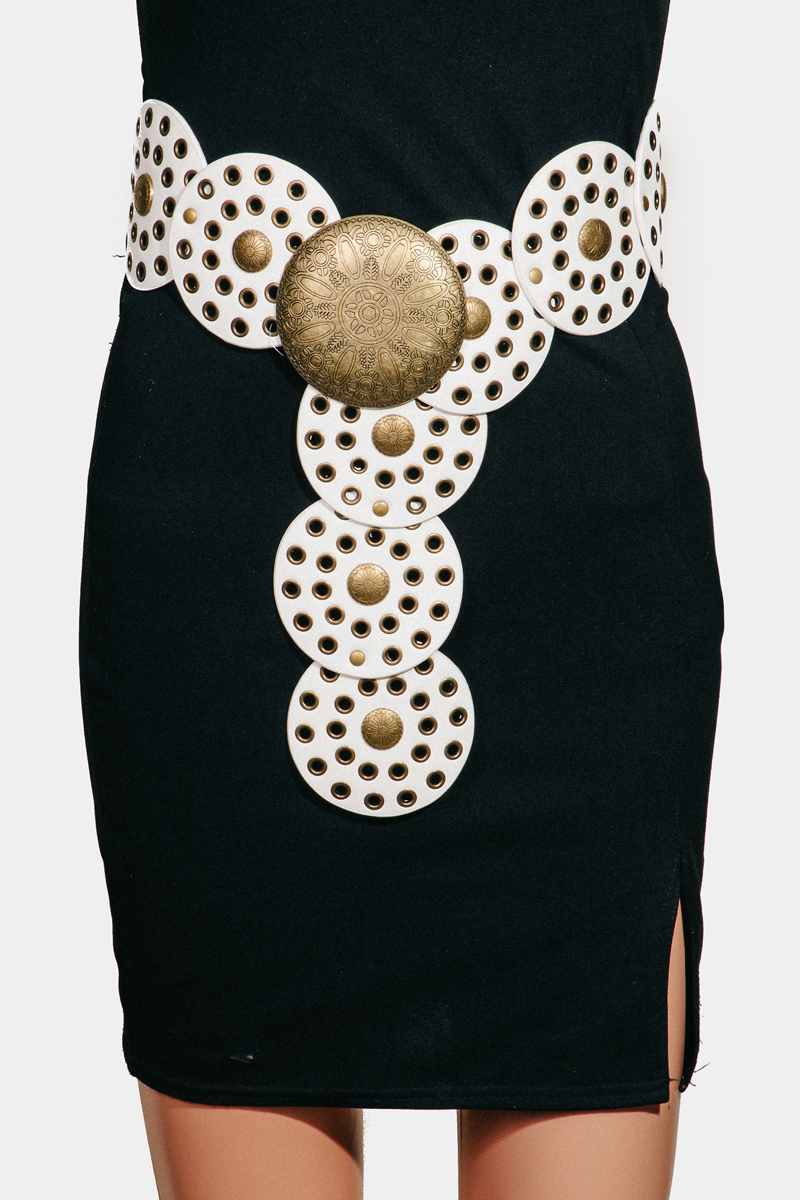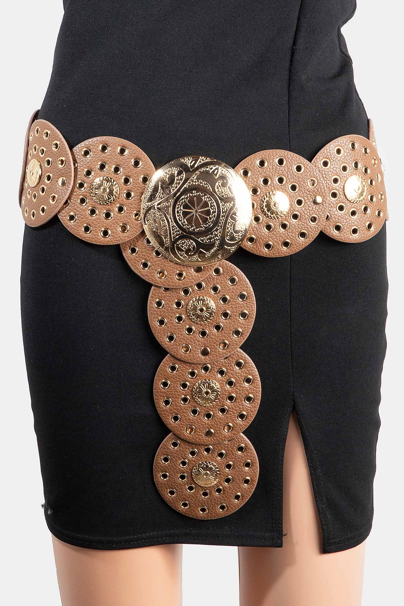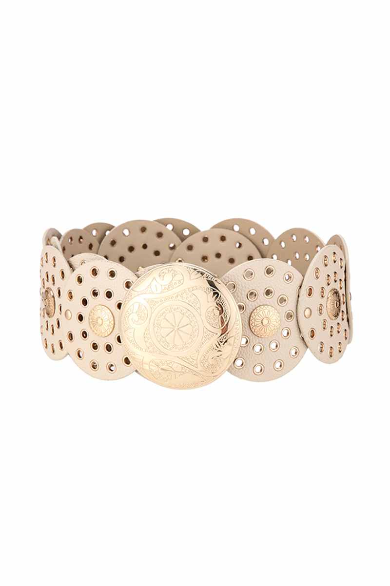 | Beige faux leather wide western belt with ornate gold disc and eyelet details. | |||||||||||