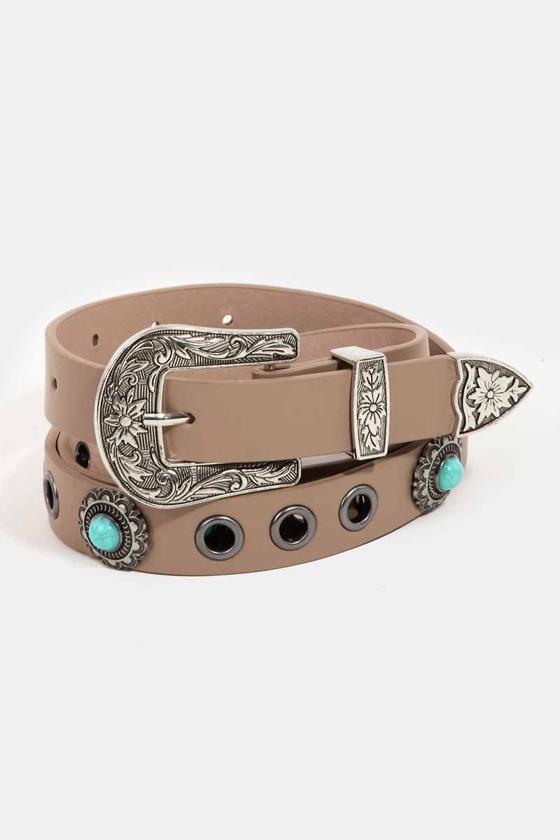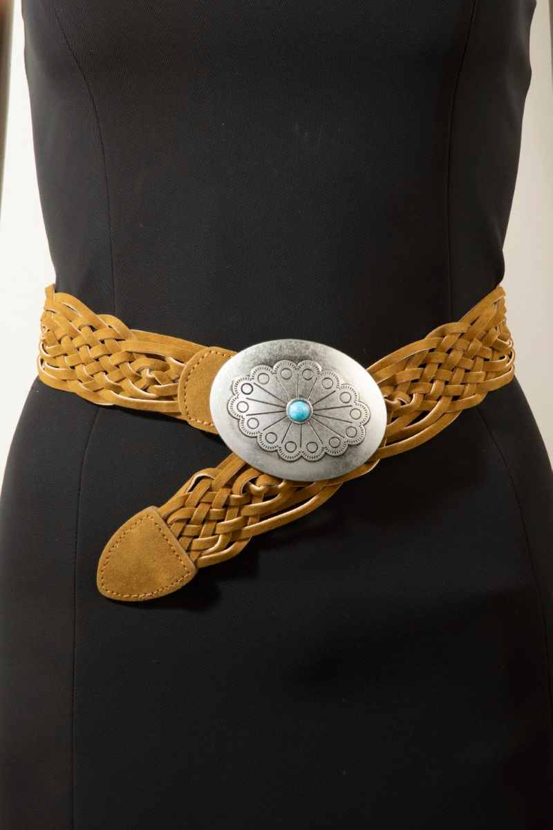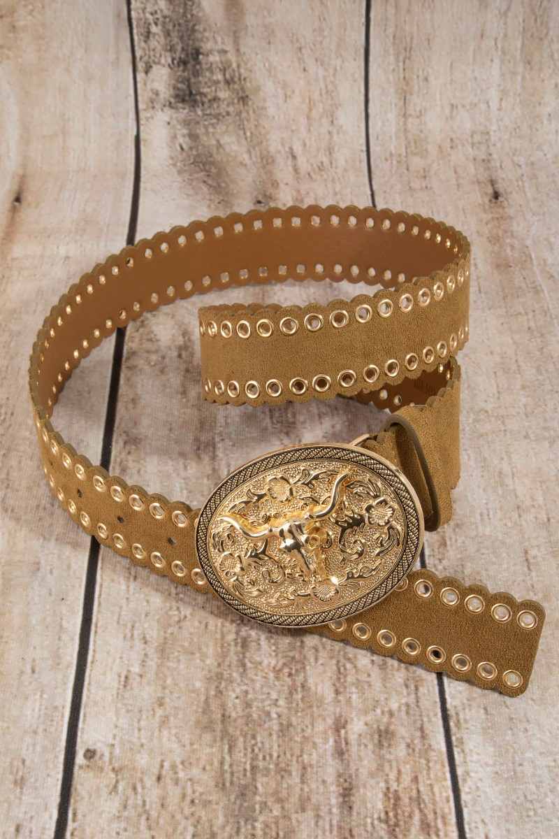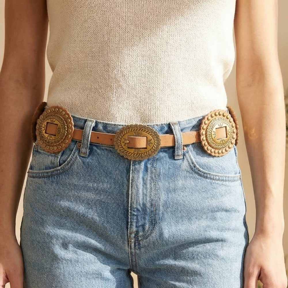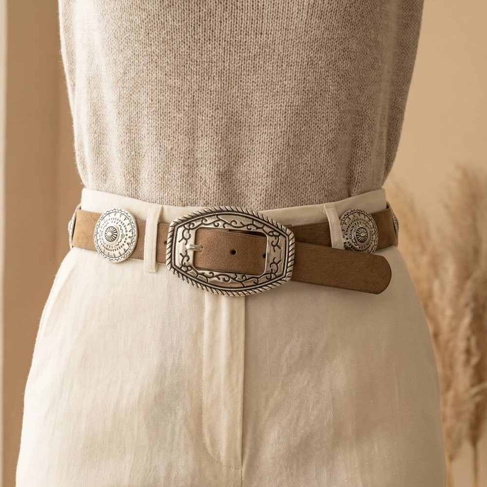 | Beige faux leather wide western belt with ornate gold disc and eyelet details. | |||||||||||