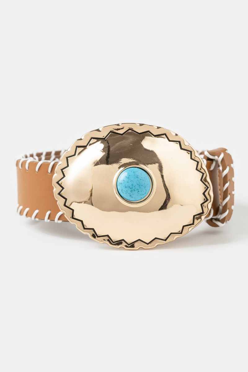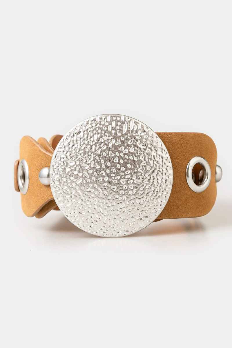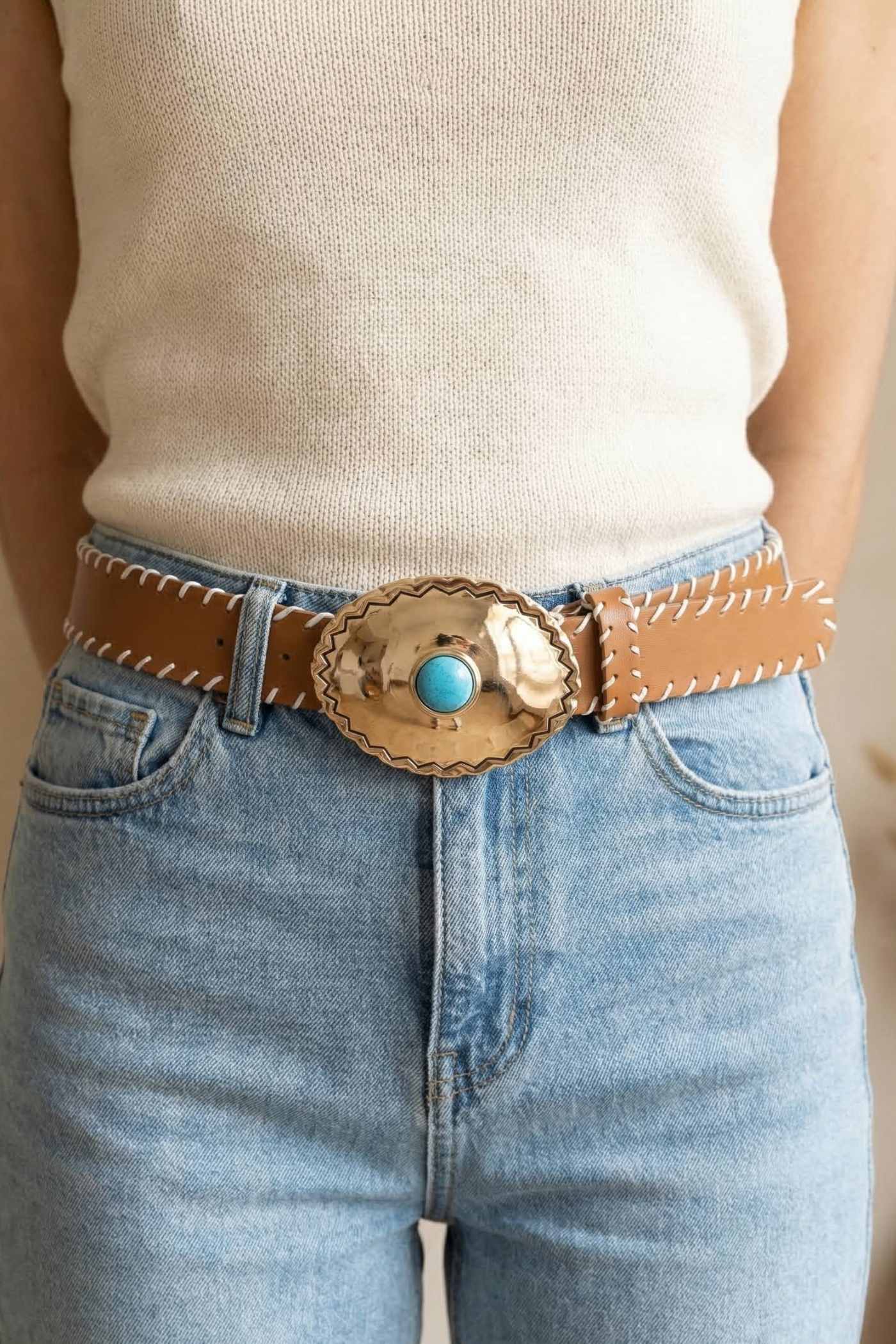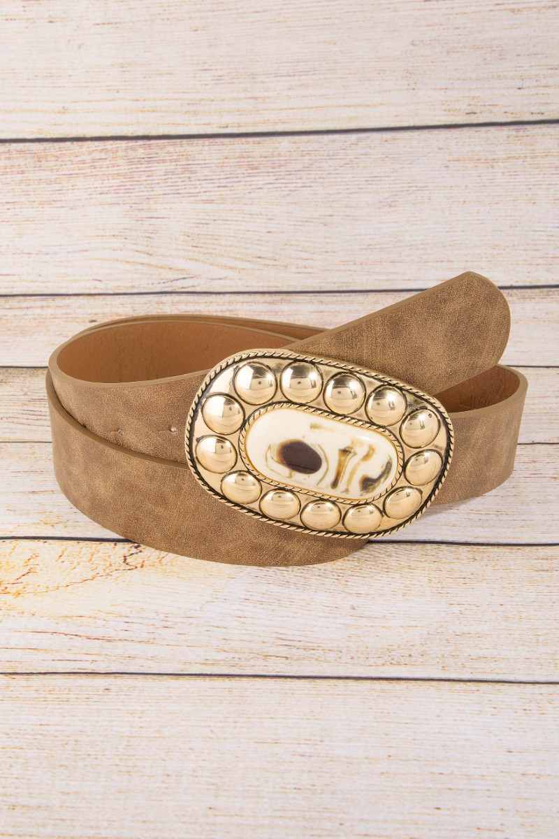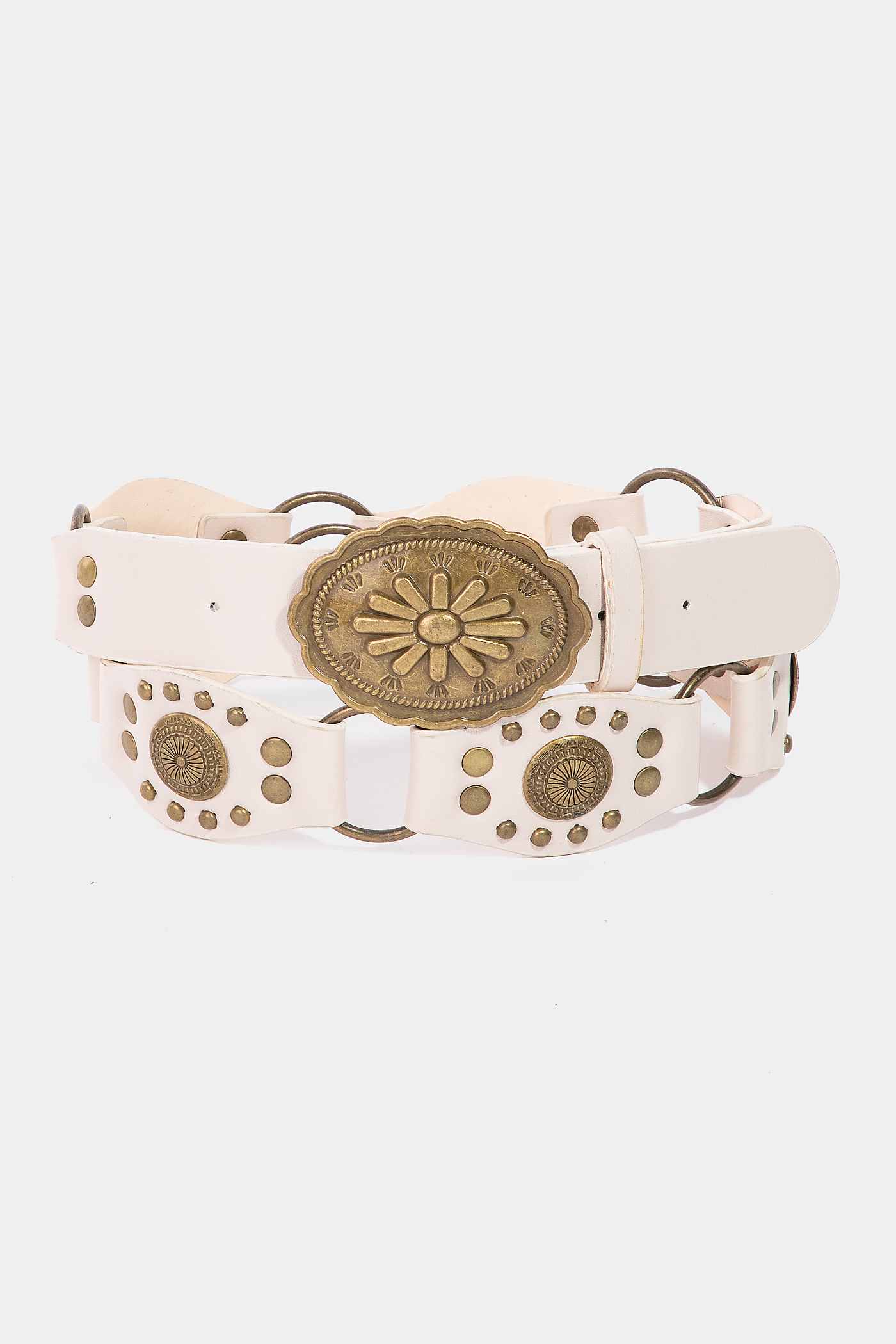 | Beige faux leather wide western belt with ornate gold disc and eyelet details. | |||||||||||