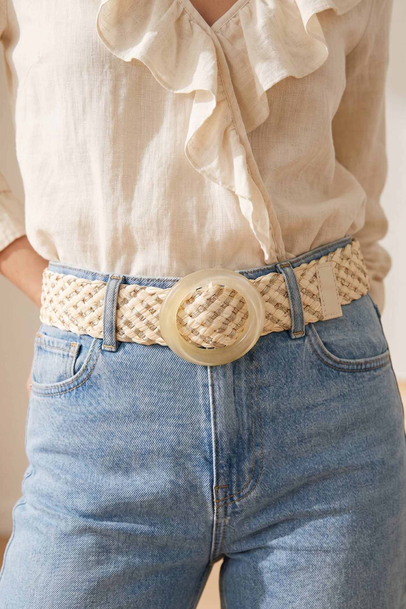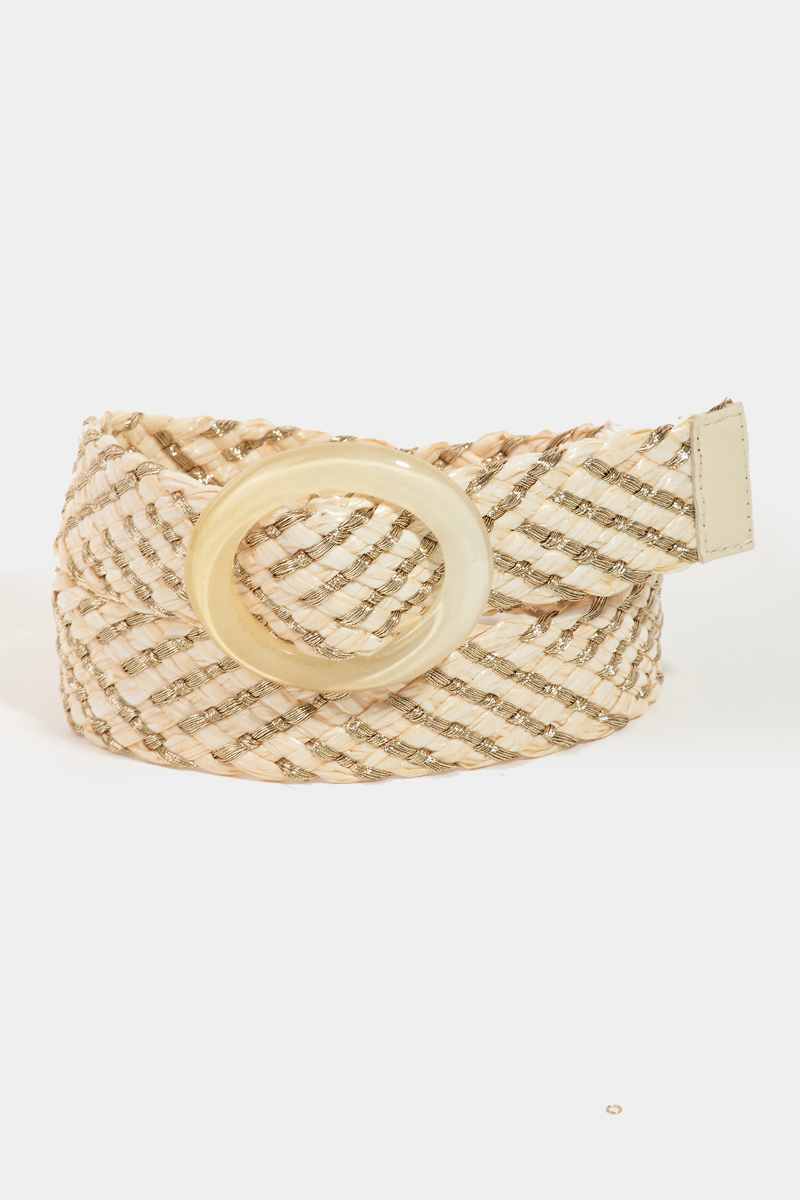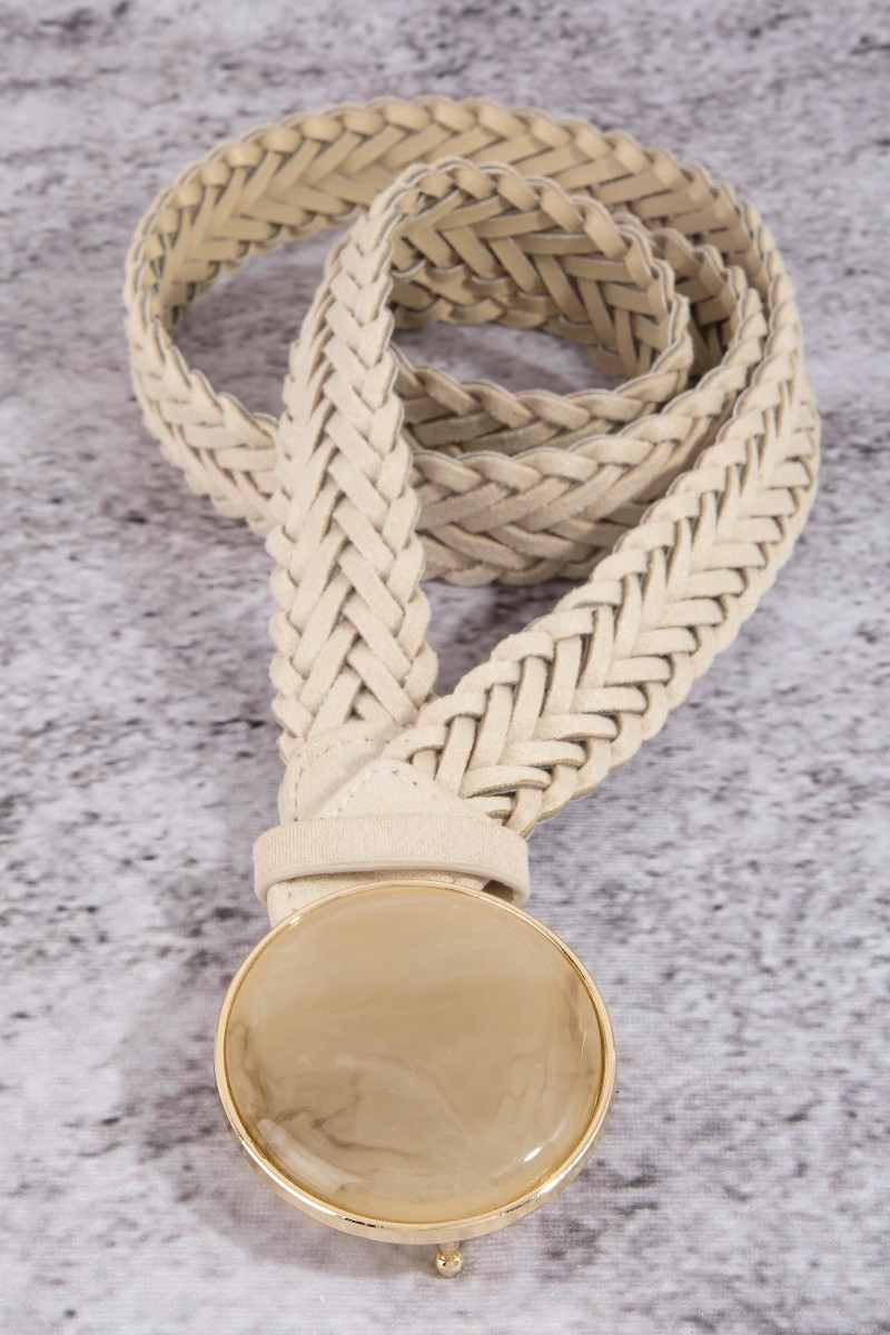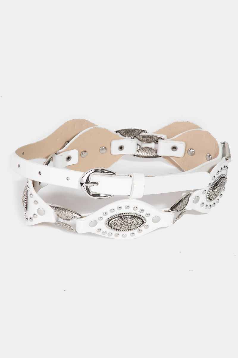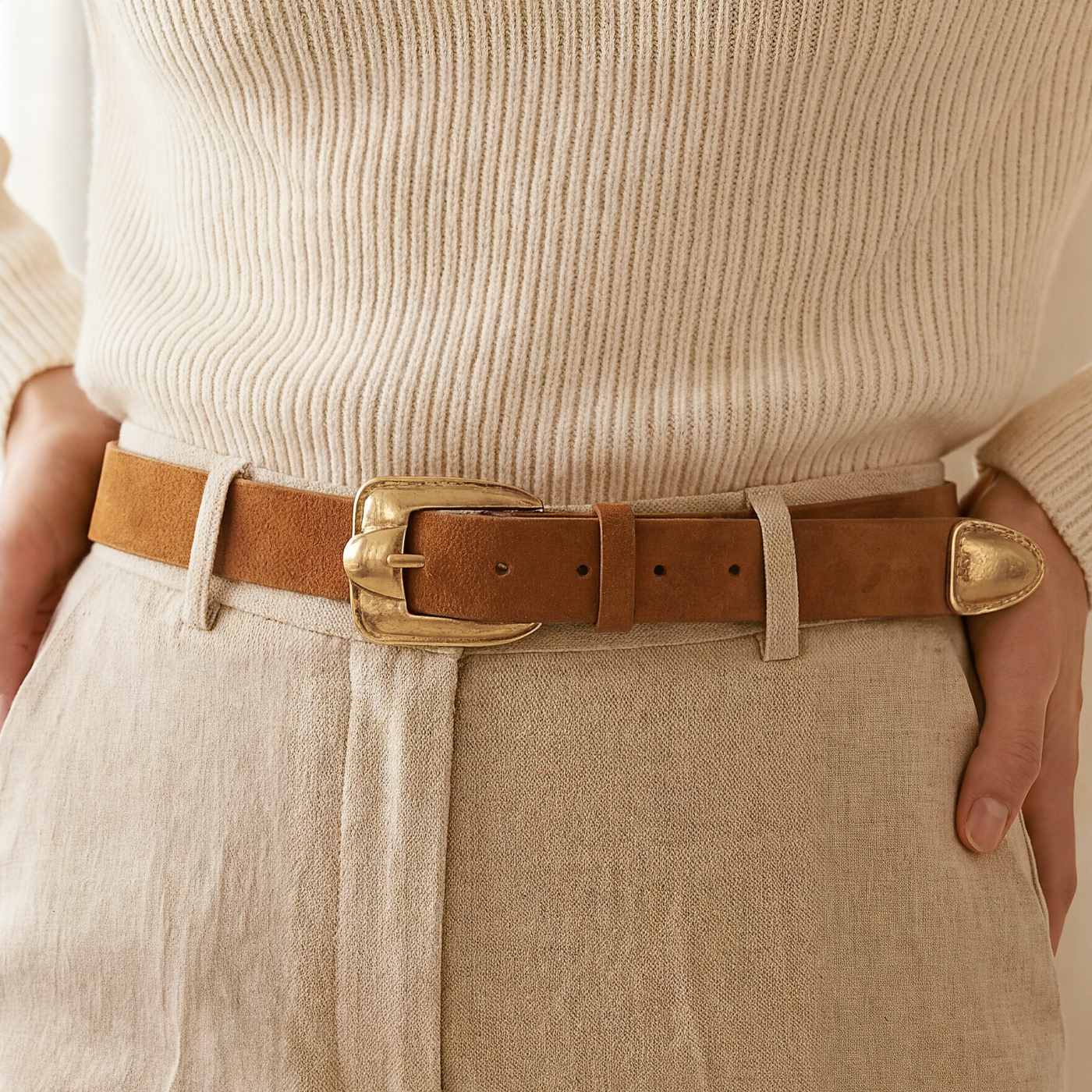 | Beige faux leather wide western belt with ornate gold disc and eyelet details. | |||||||||||
