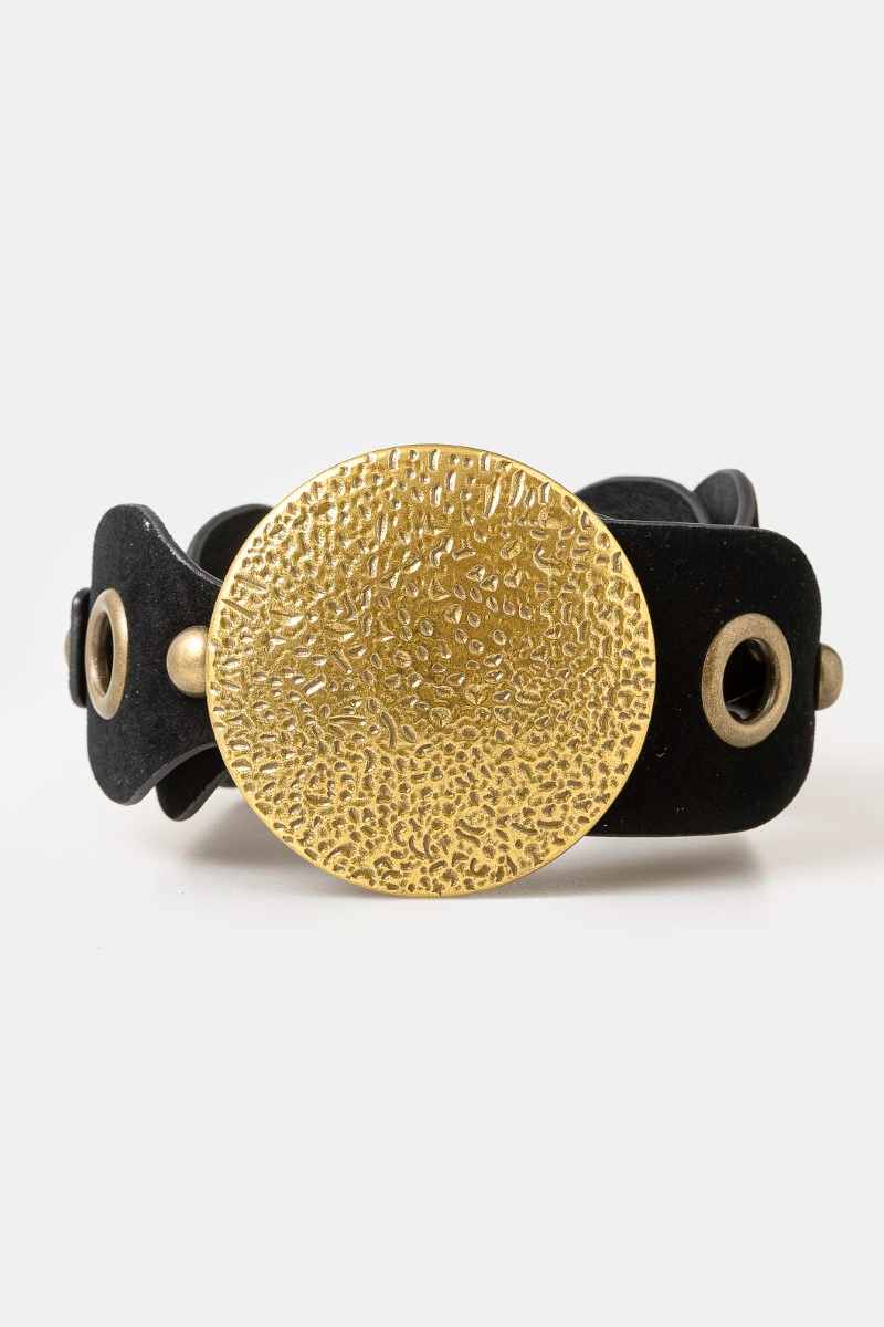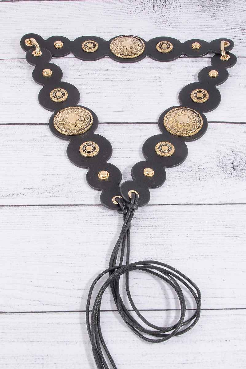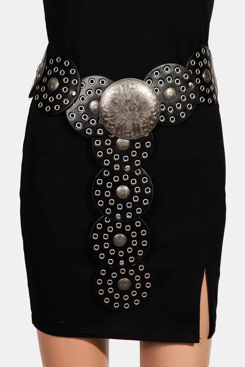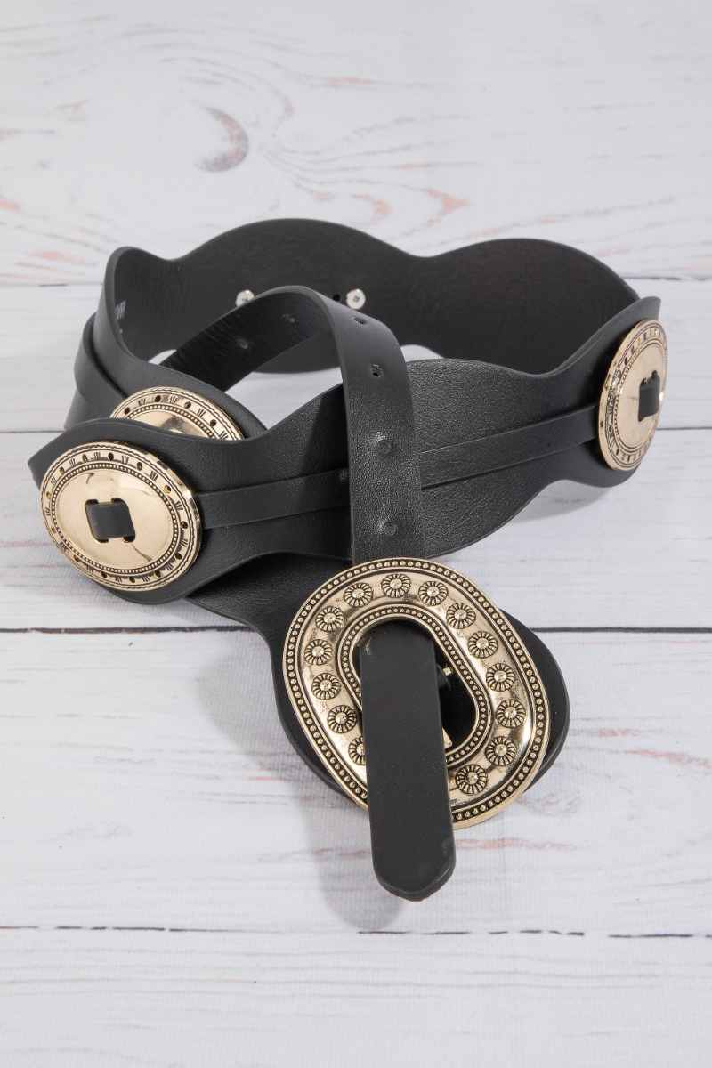 | Black PU wide western belt with oversized ornate antique gold disc. | |||||