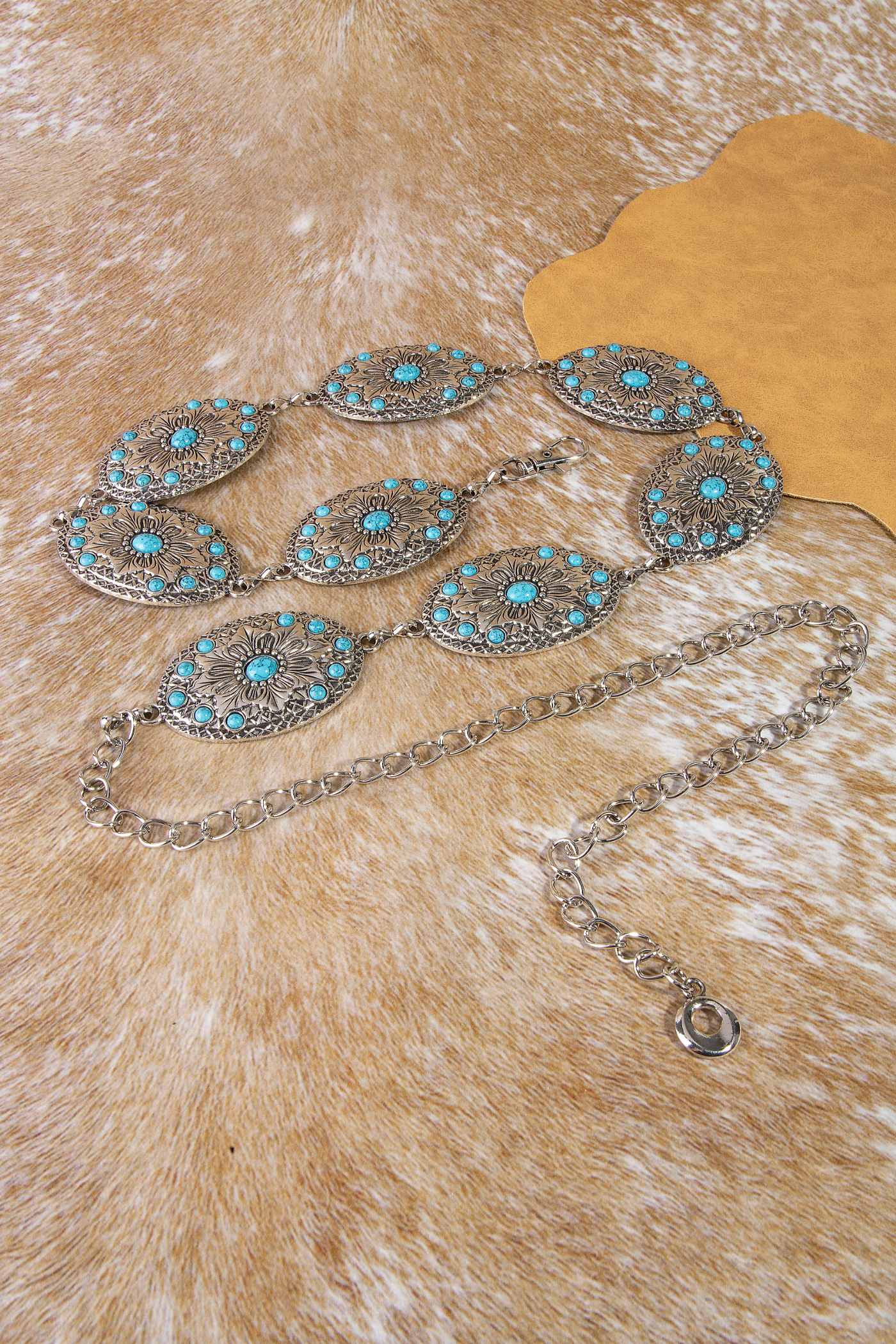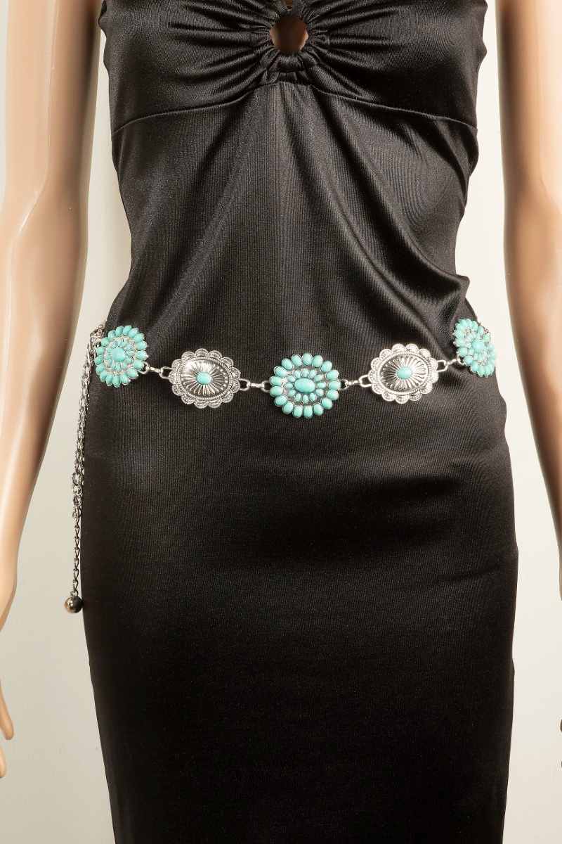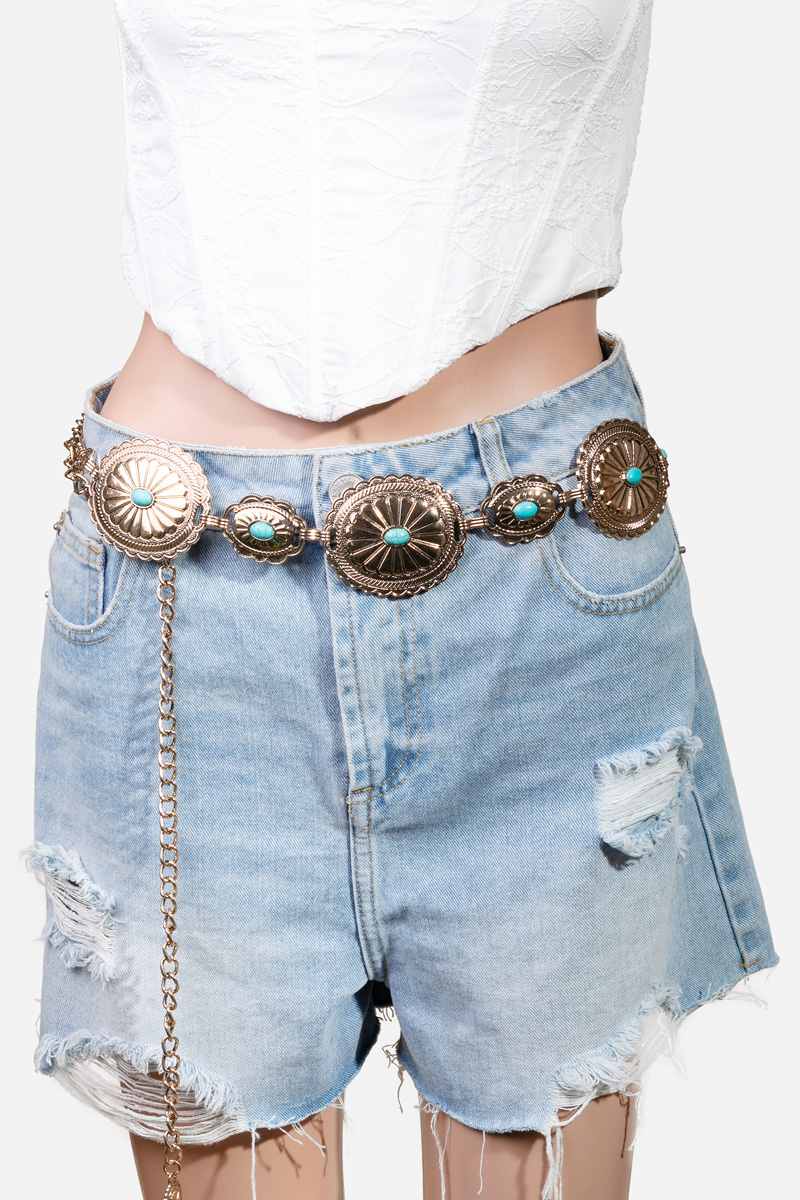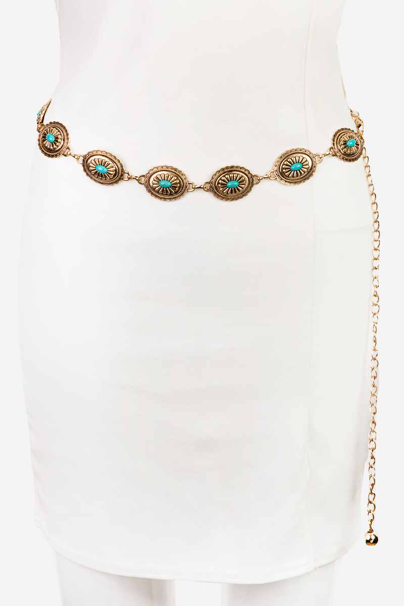 | Antique gold alloy Western concho chain belt with turquoise accents. | |||