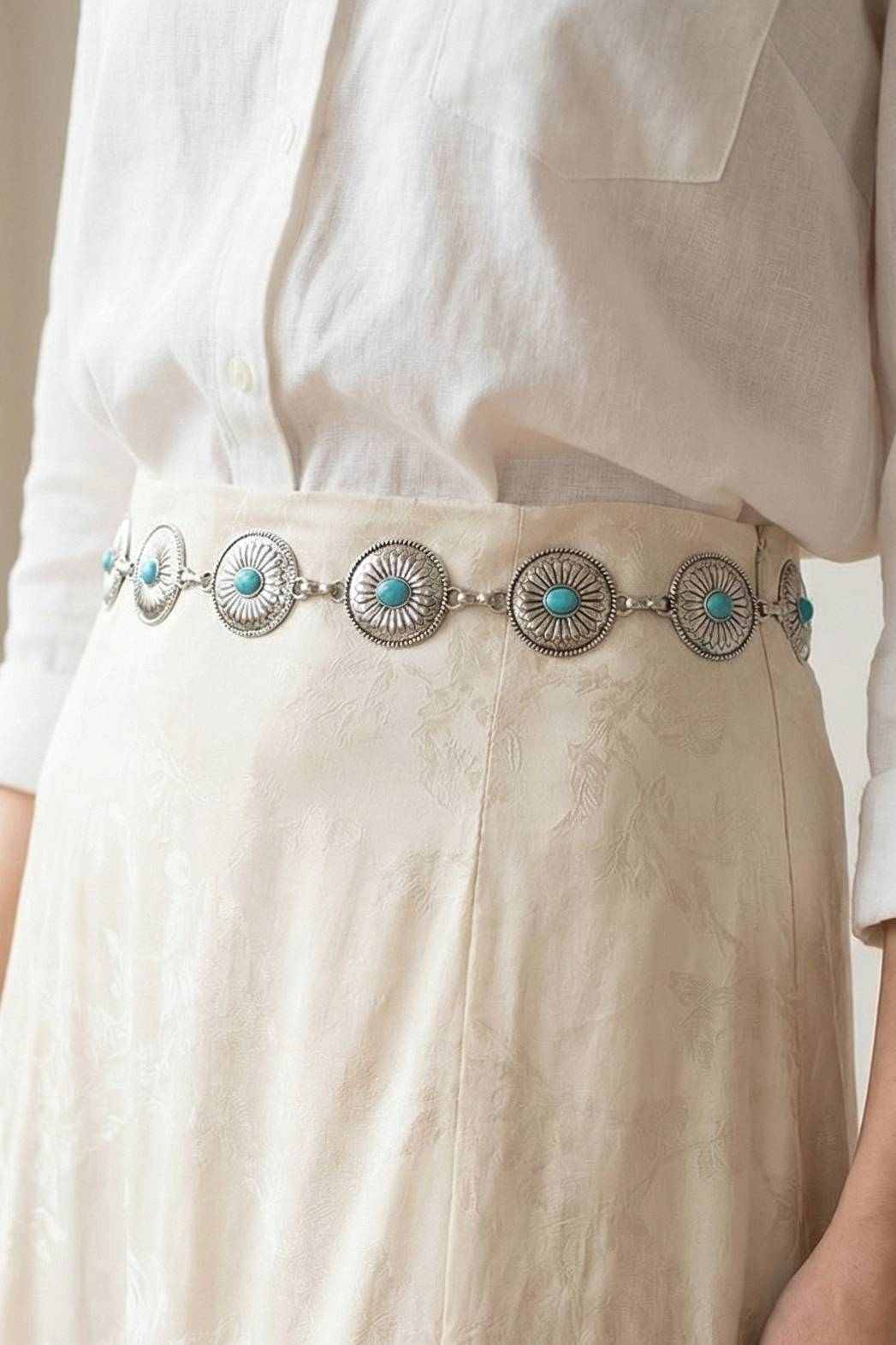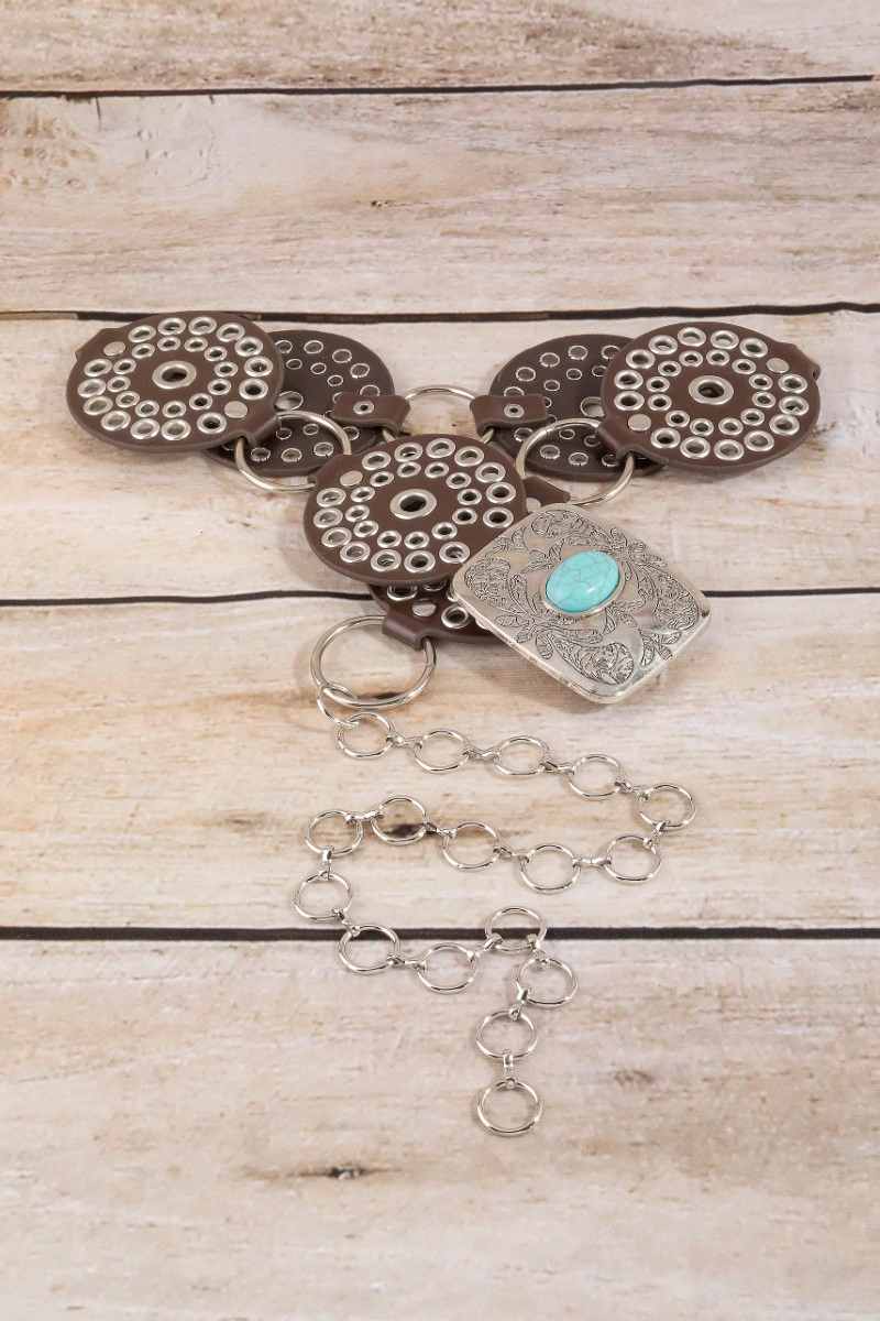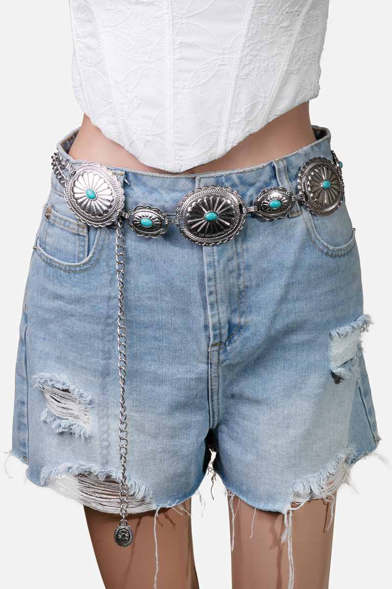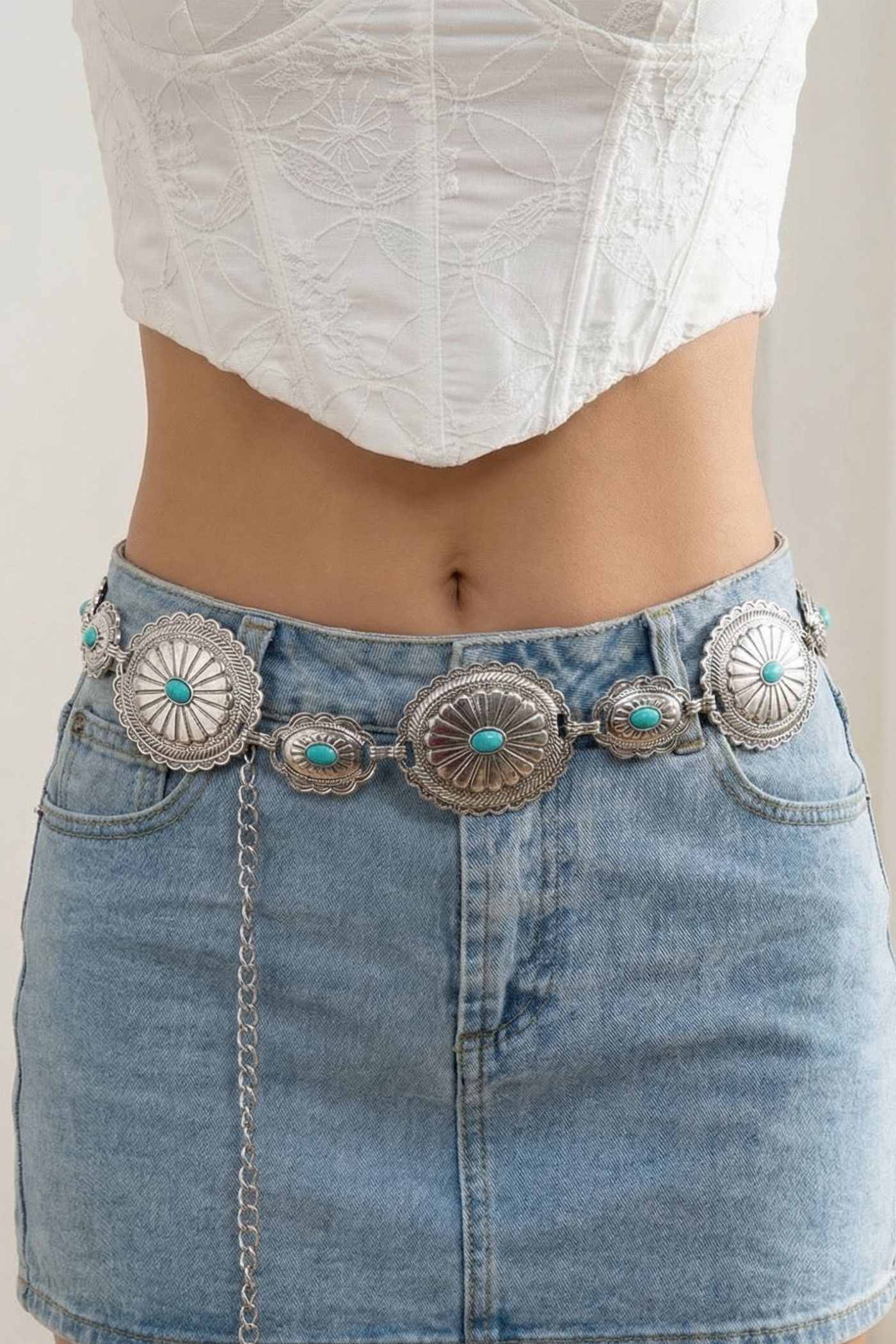 | Antique gold alloy Western concho chain belt with turquoise accents. | |||