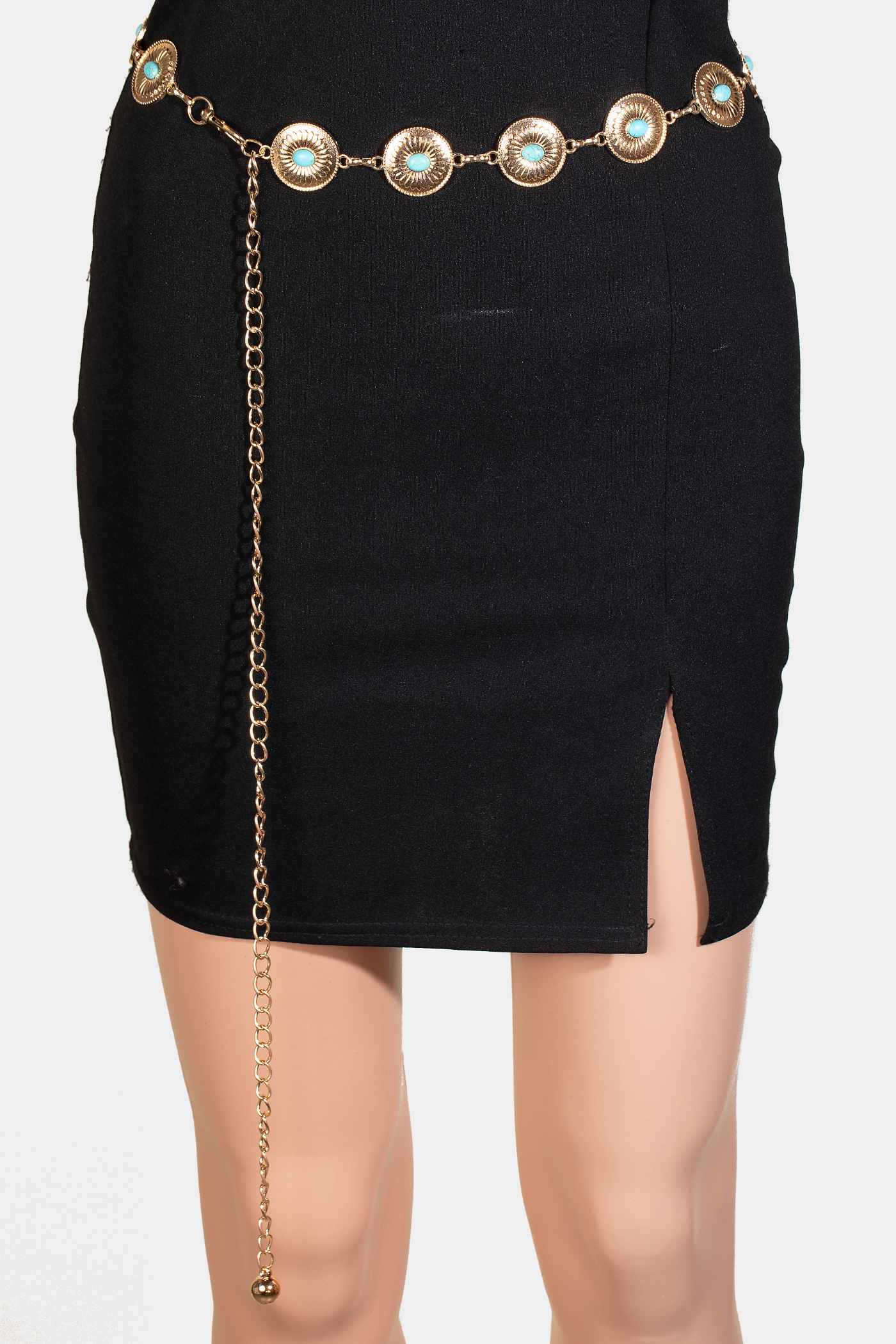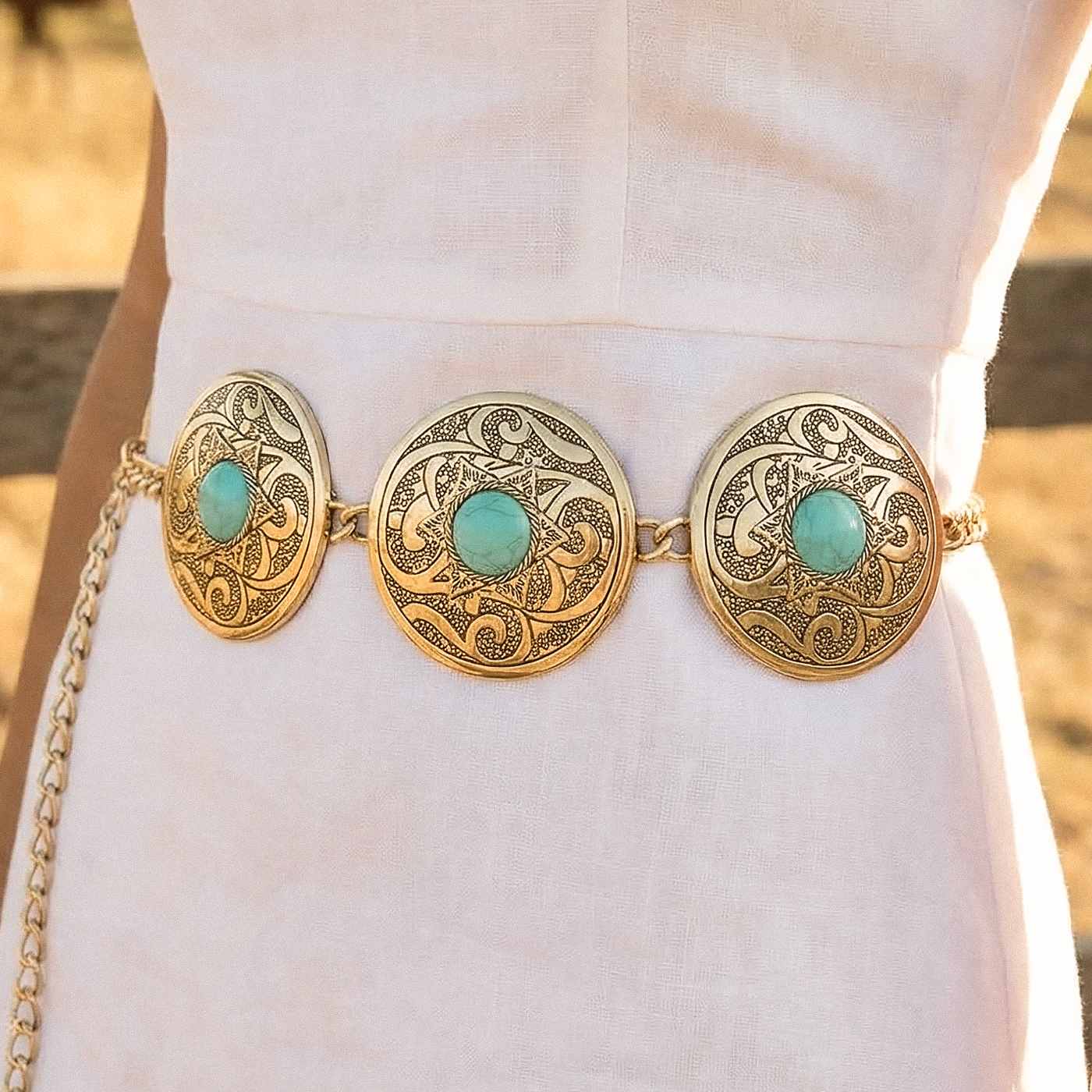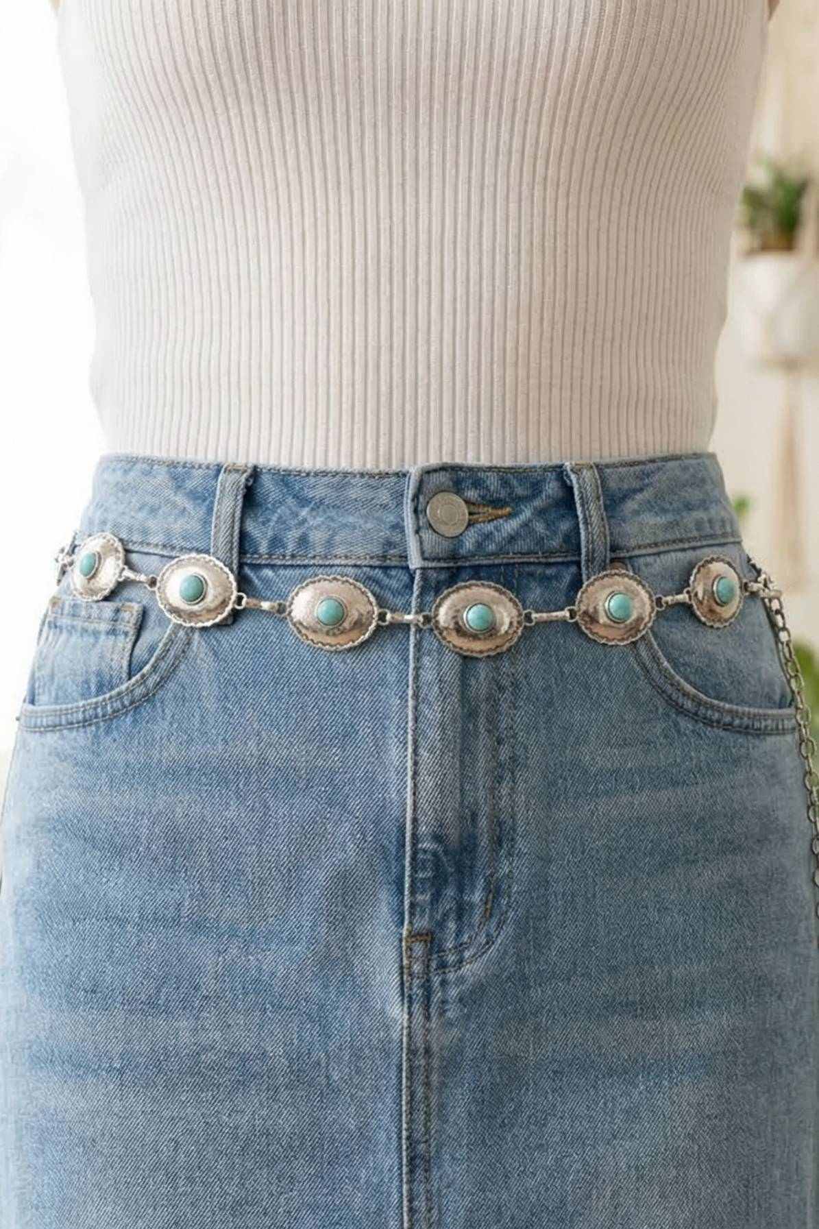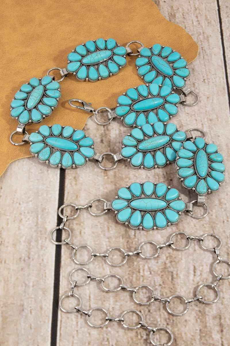 | Antique gold alloy Western concho chain belt with turquoise accents. | |||