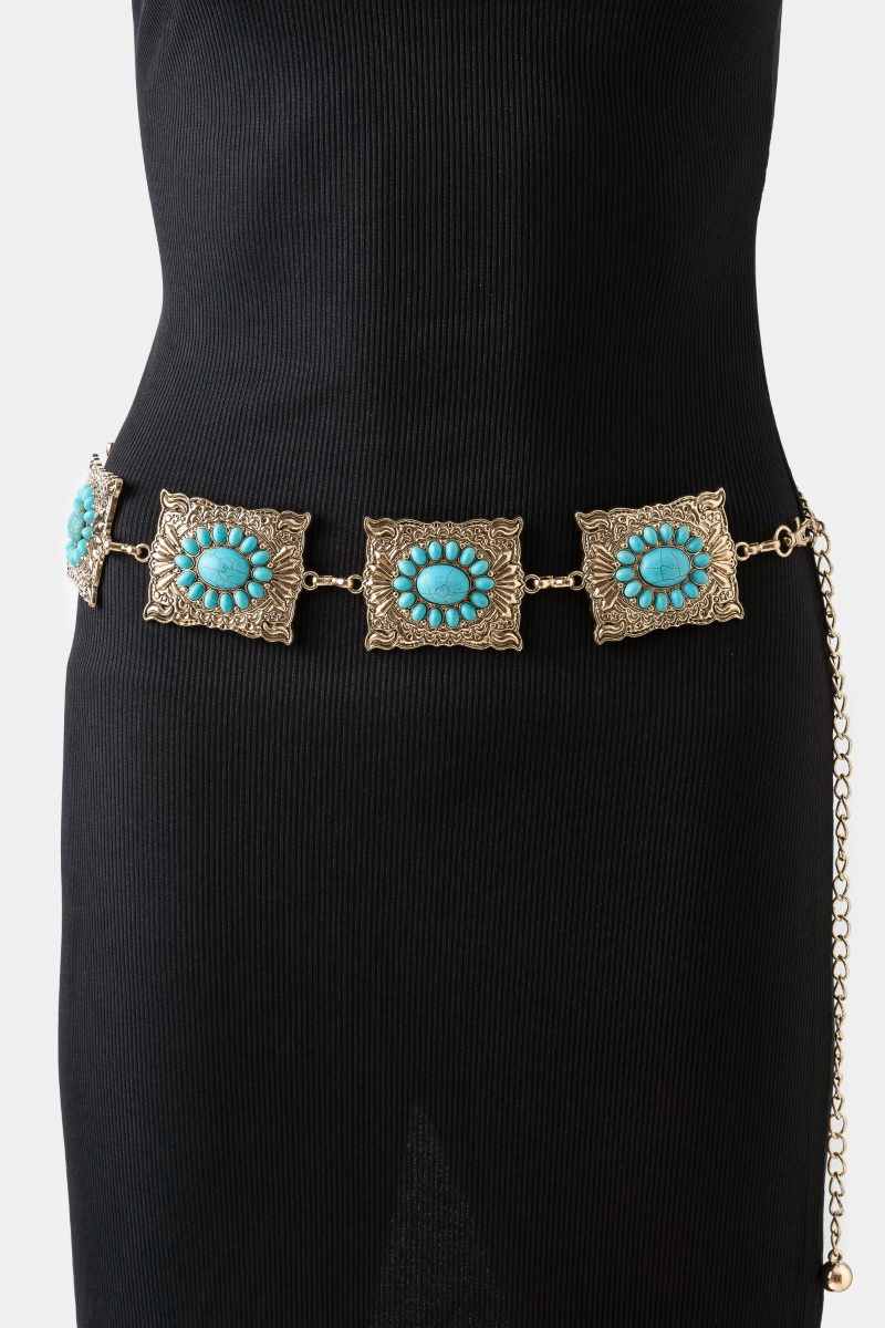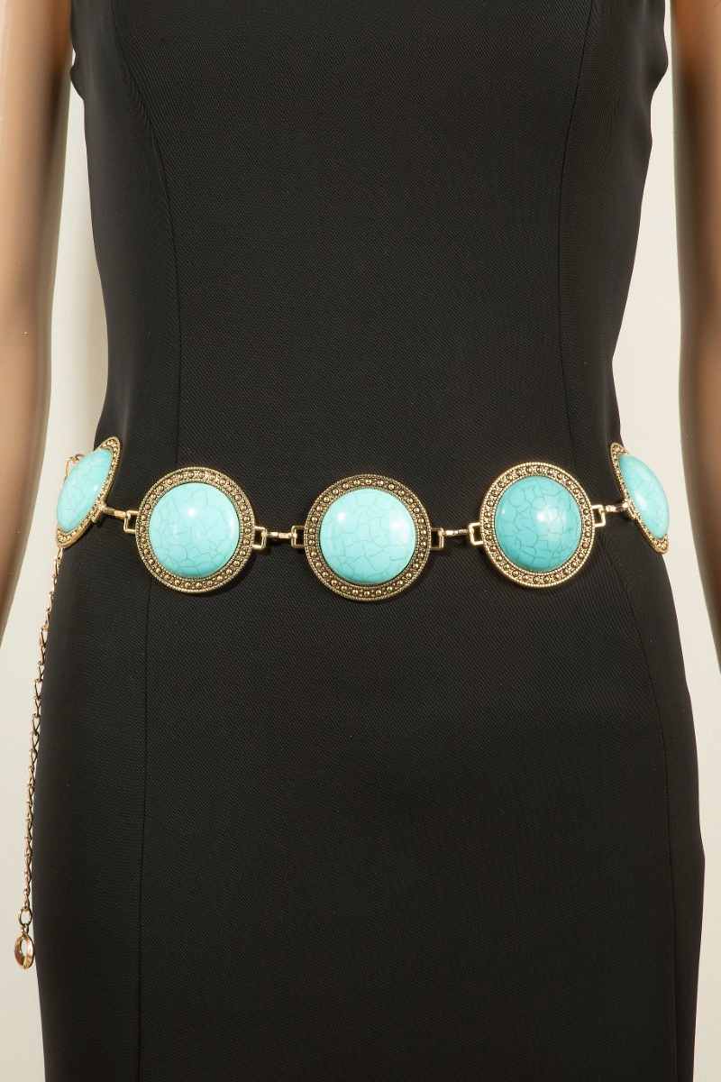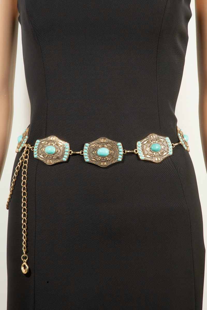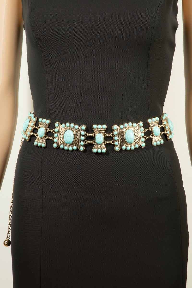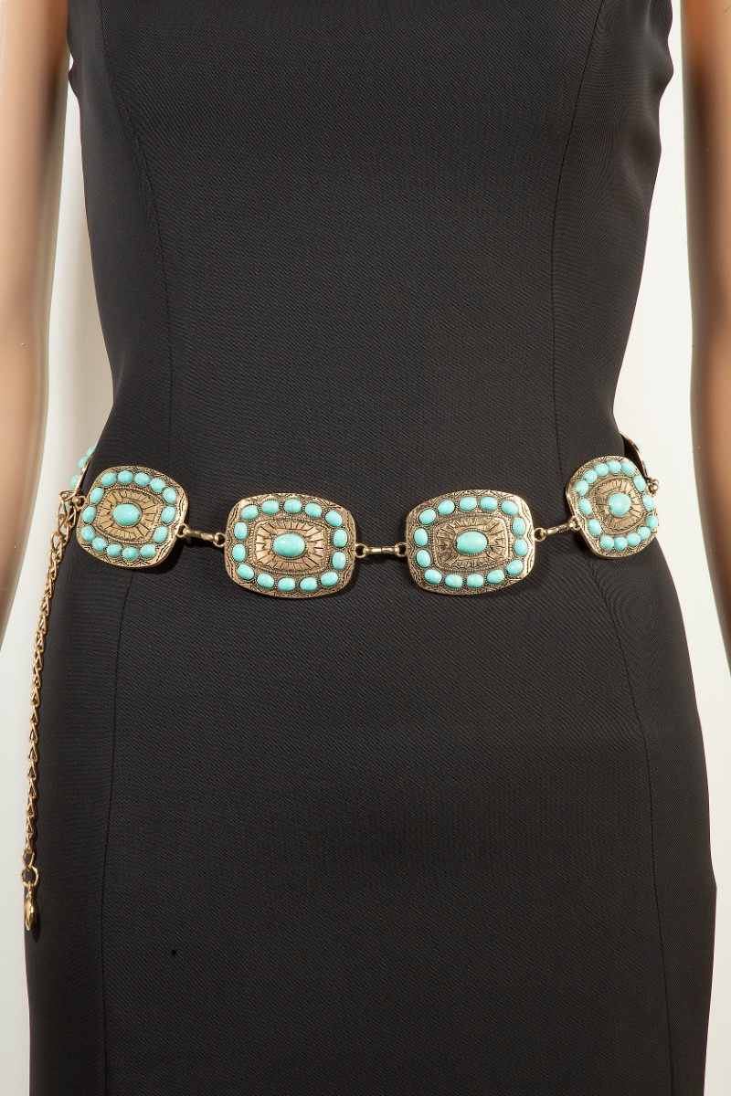 | Gold-tone alloy chain belt with rectangular turquoise-look stone. | |||