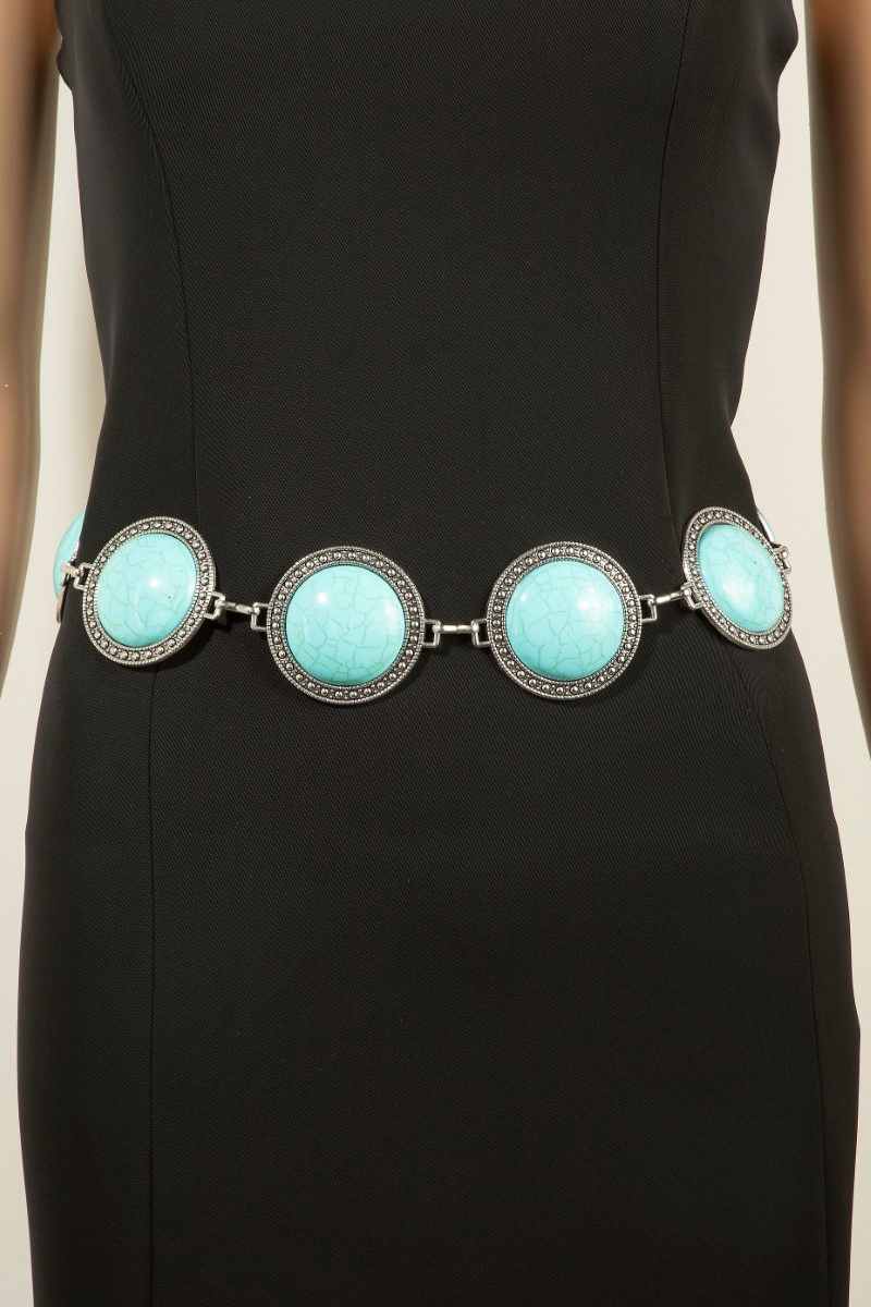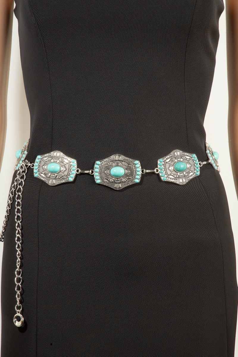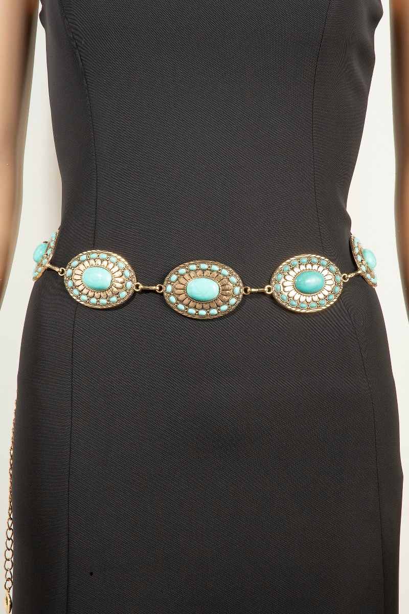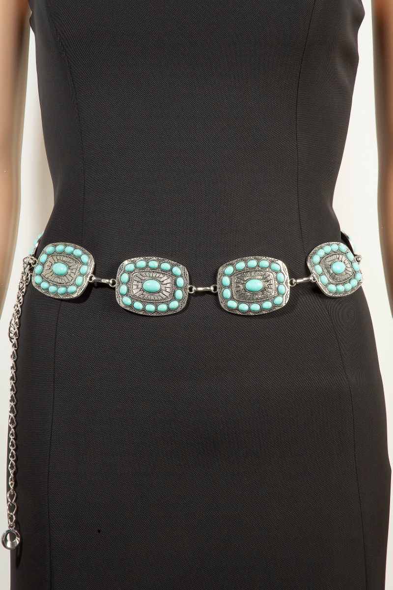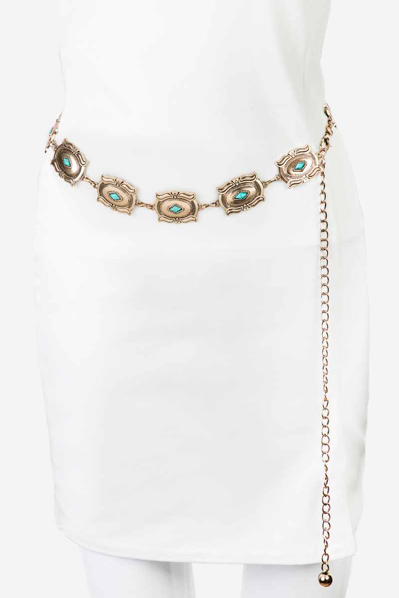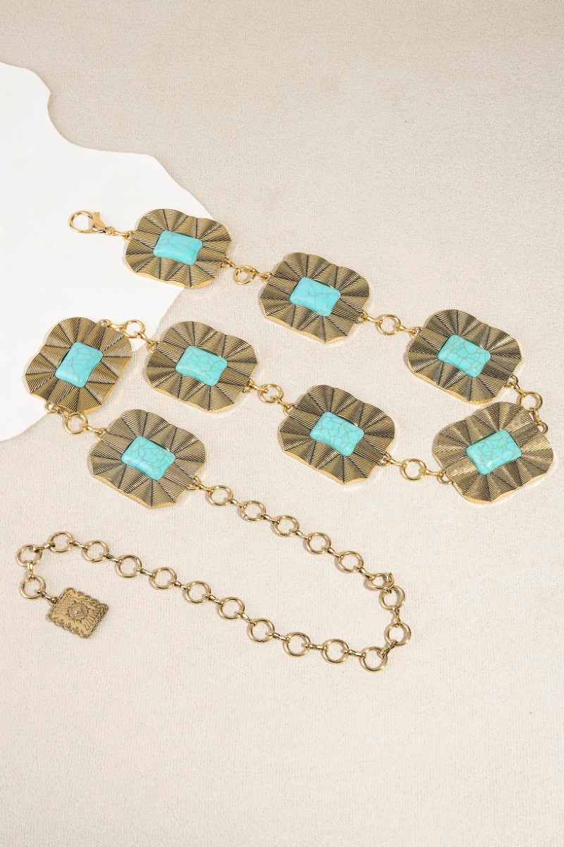 | Gold-tone alloy chain belt with rectangular turquoise-look stone. | |||