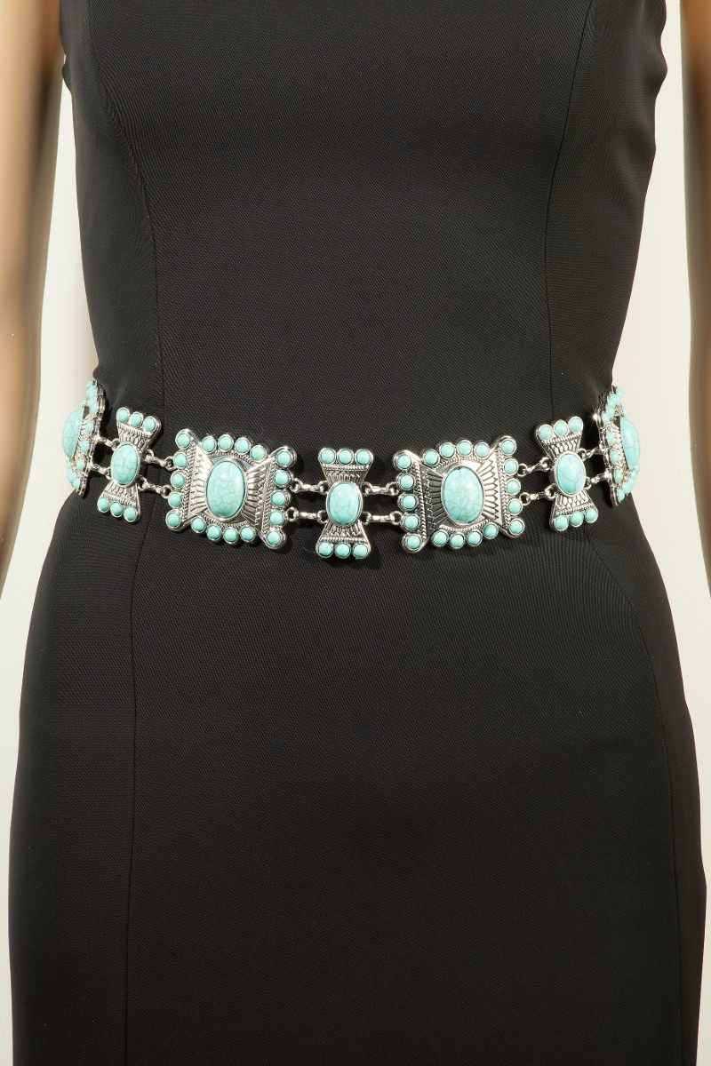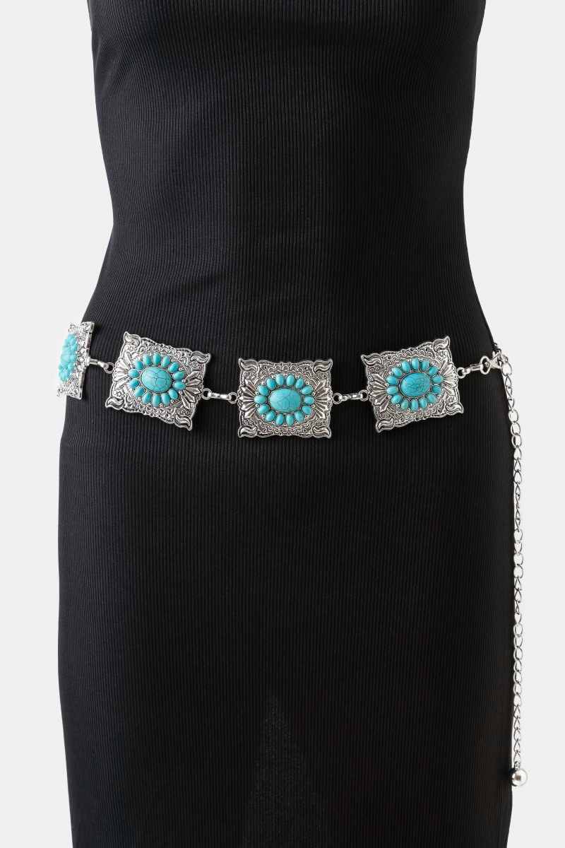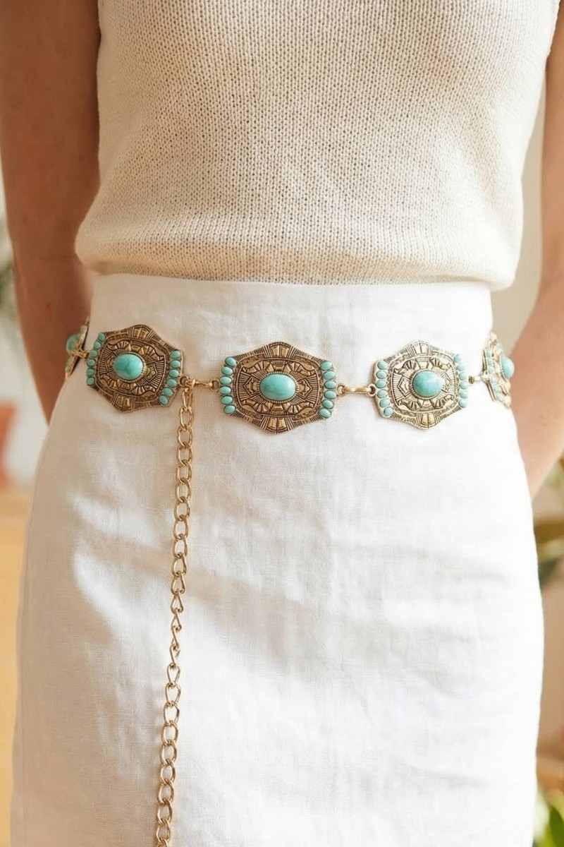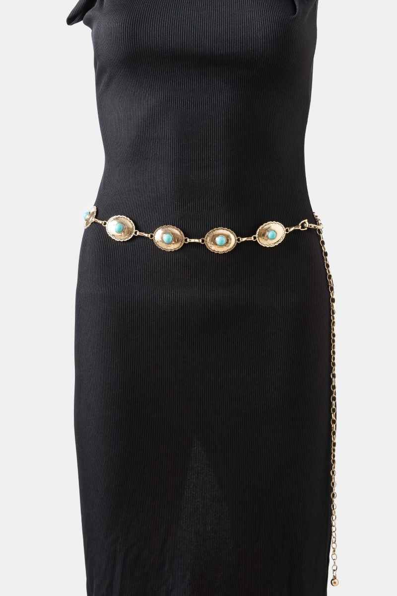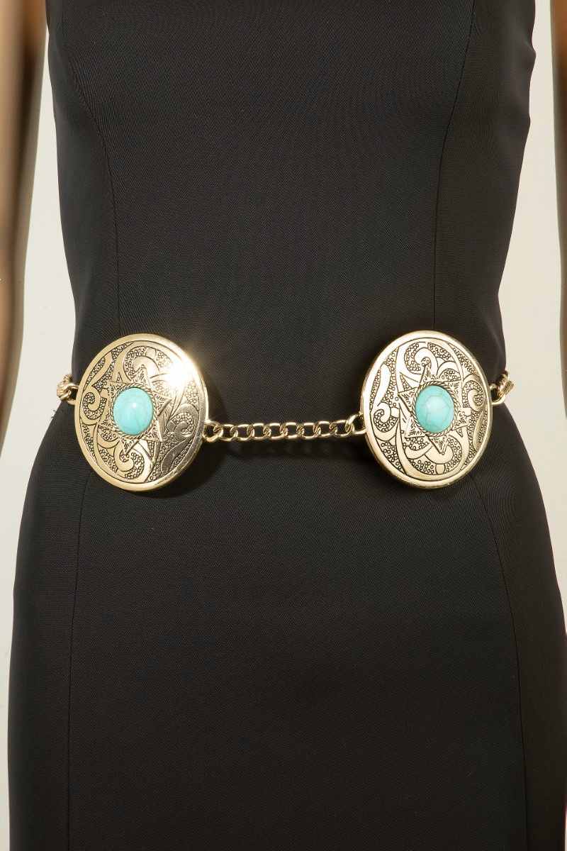 | Gold-tone alloy chain belt with rectangular turquoise-look stone. | |||