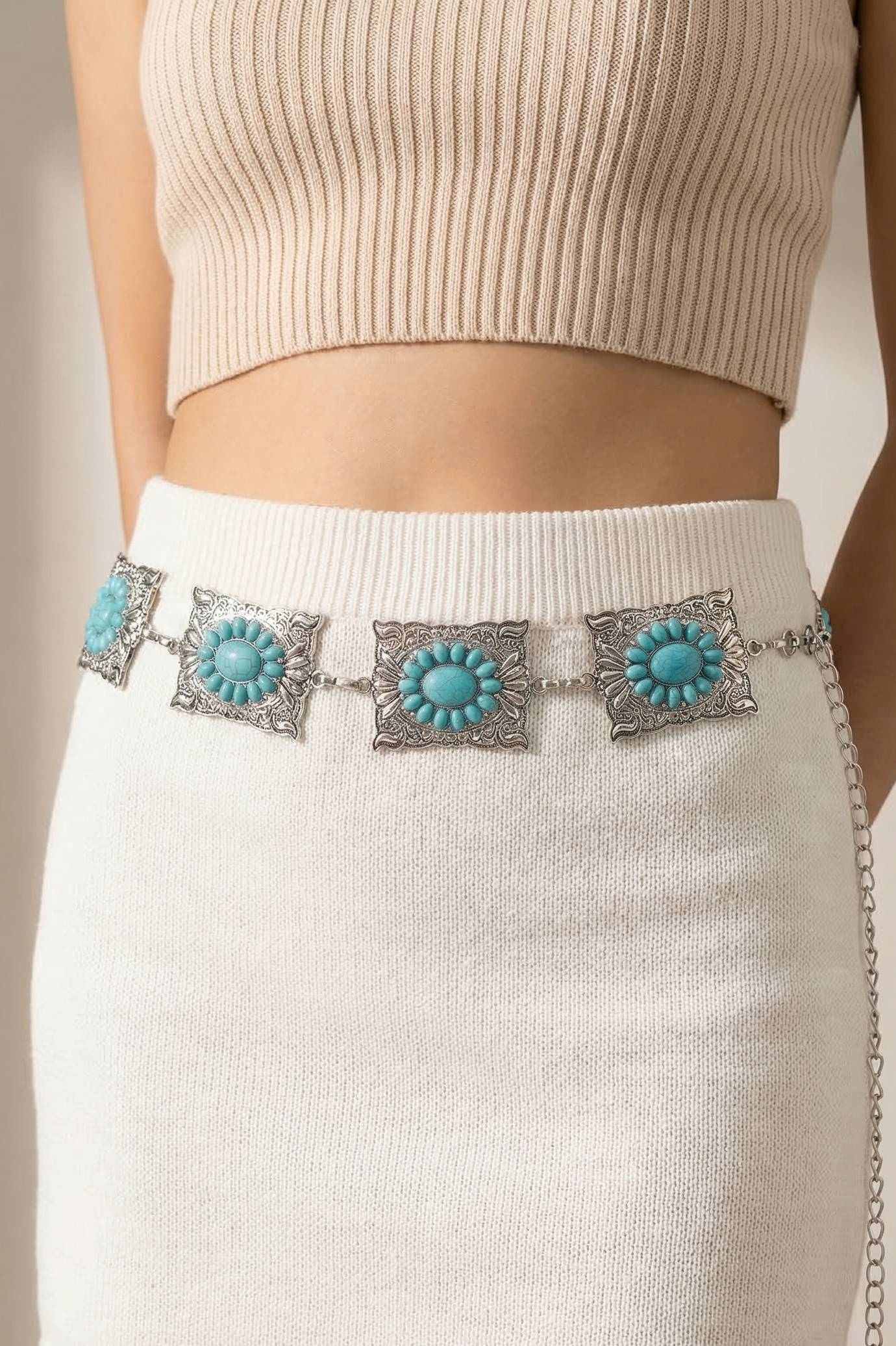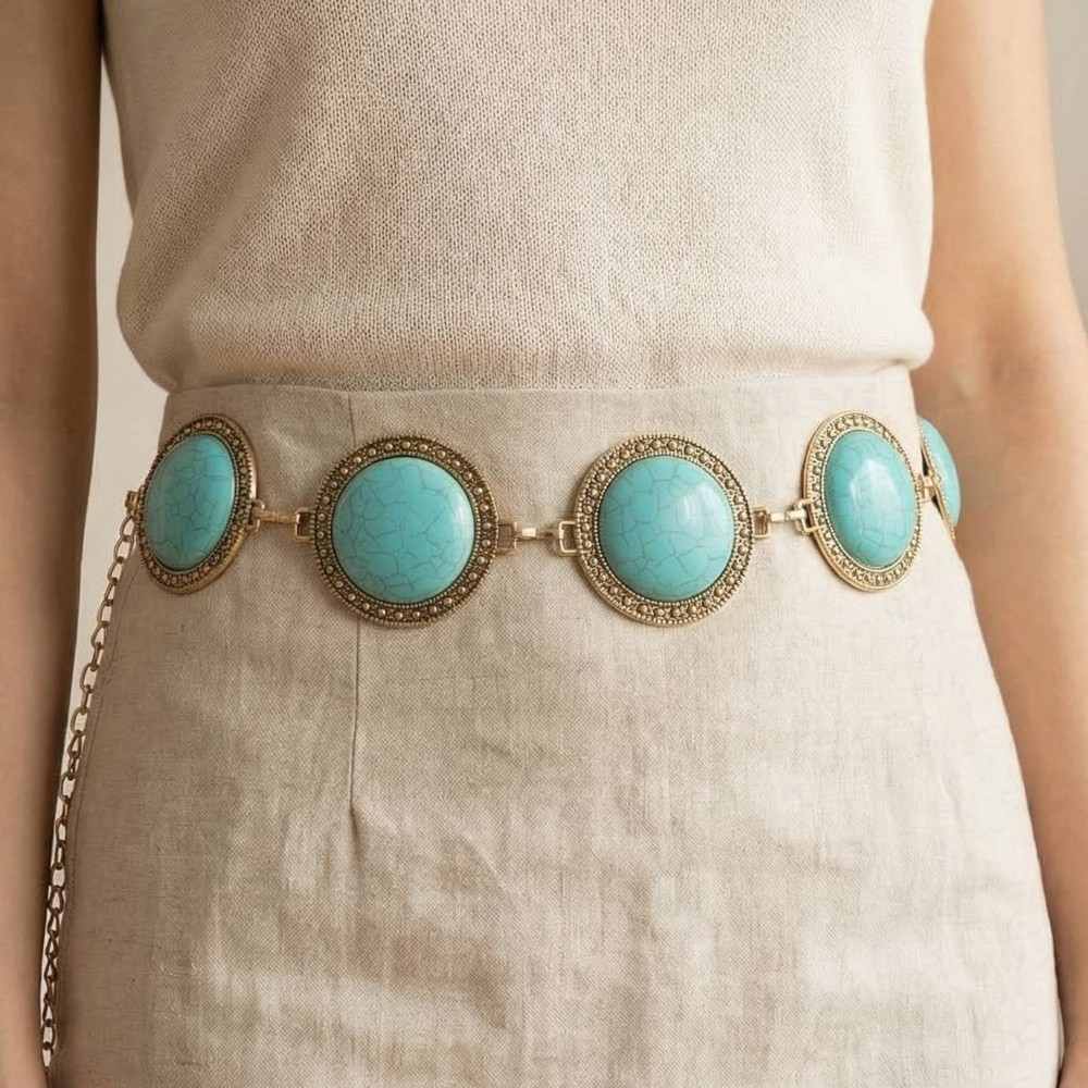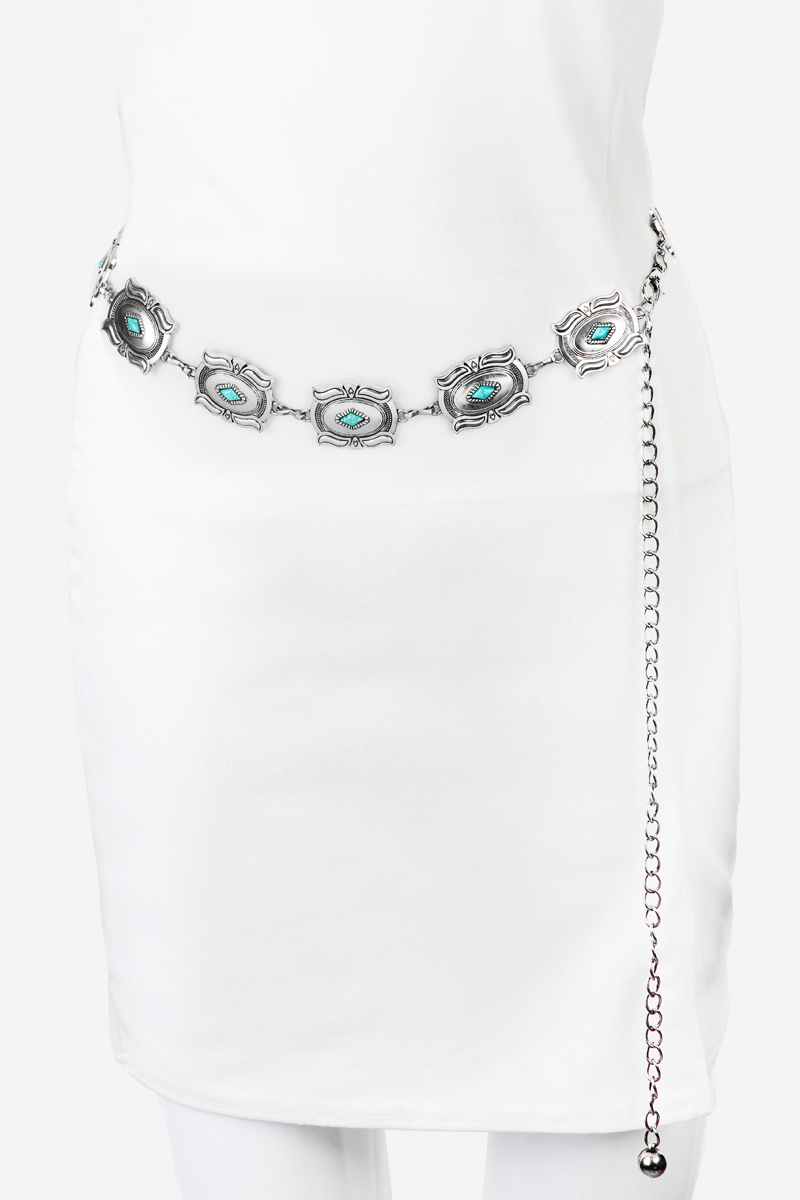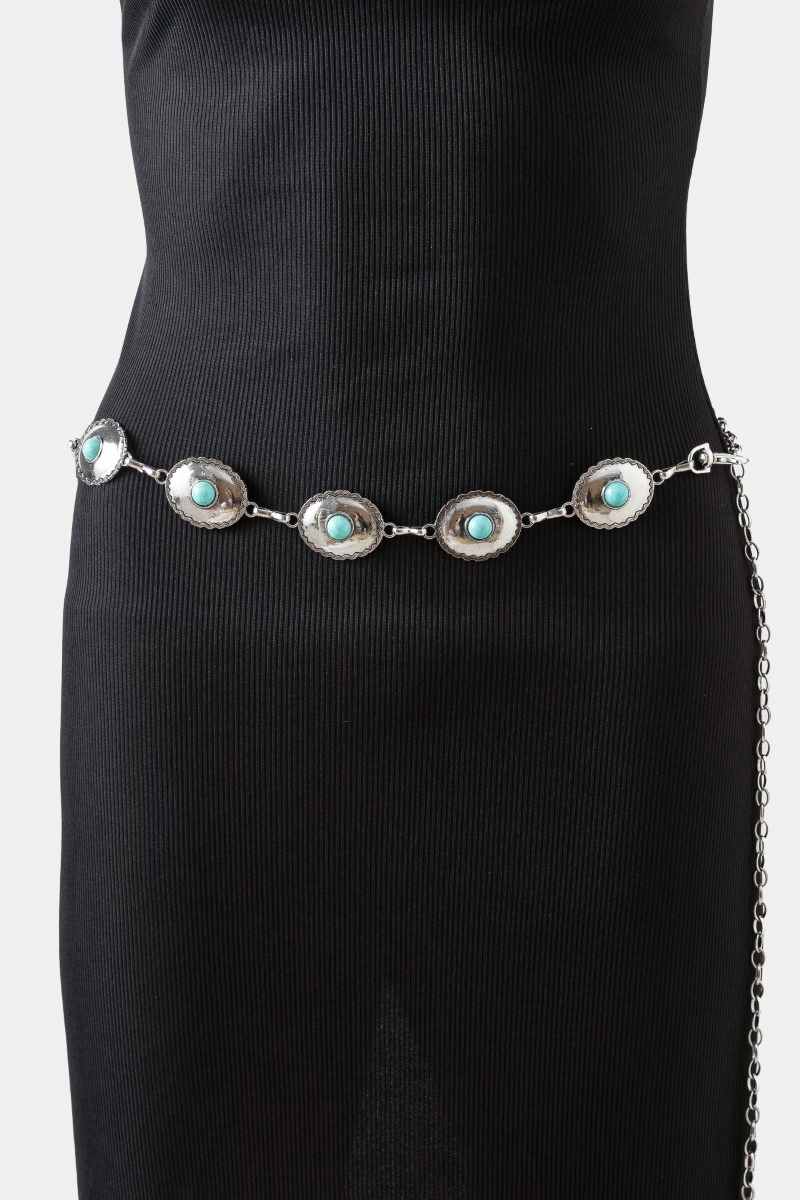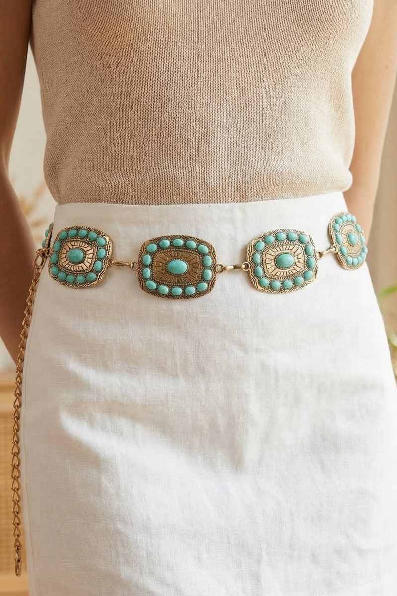 | Gold-tone alloy chain belt with rectangular turquoise-look stone. | |||