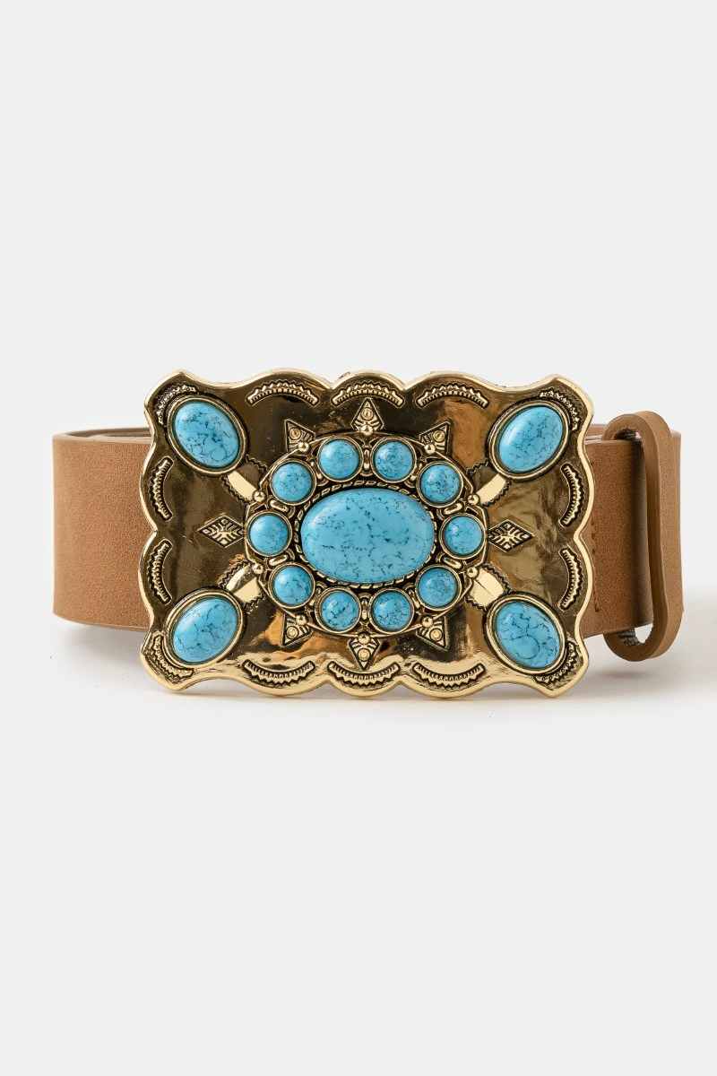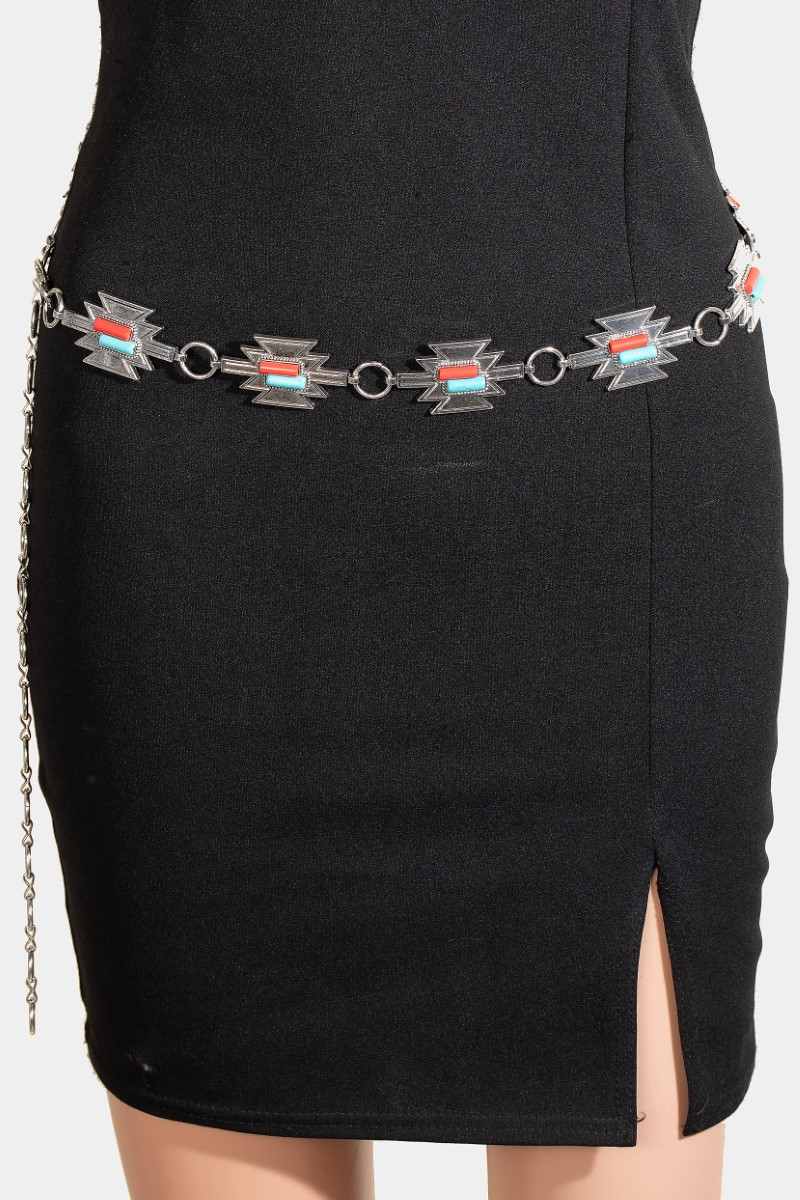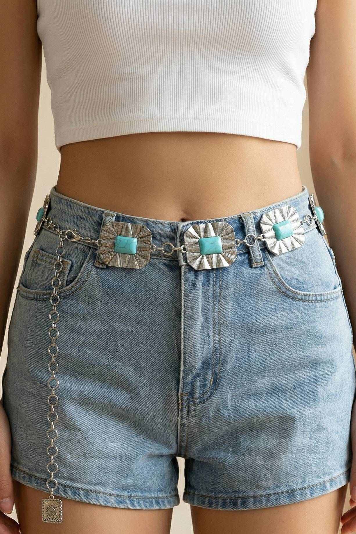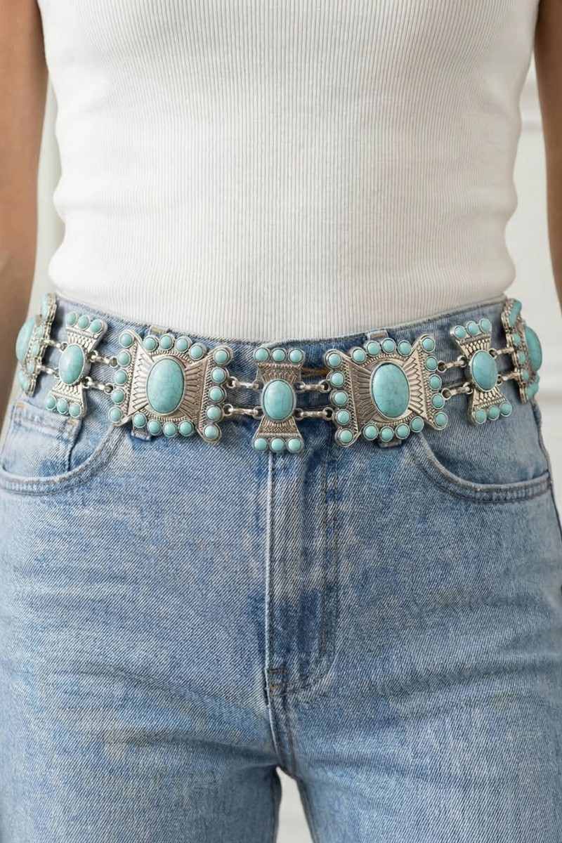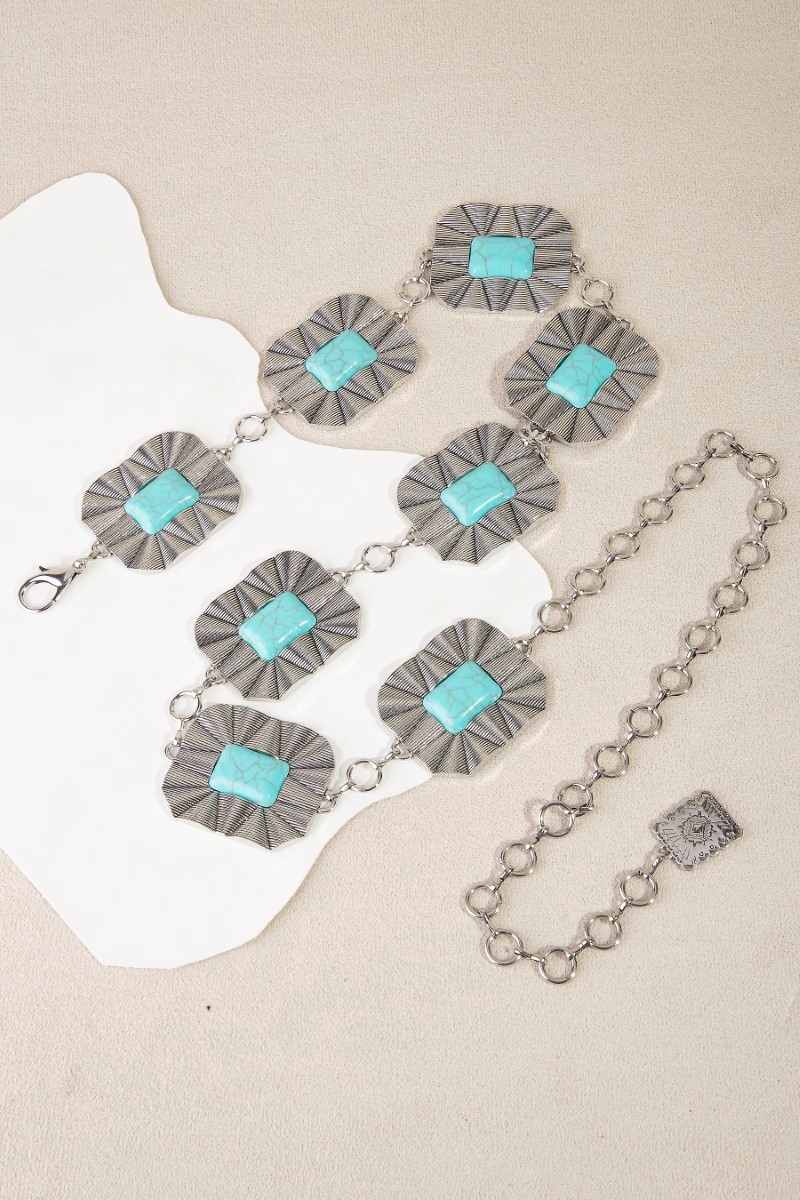 | Gold-tone alloy chain belt with rectangular turquoise-look stone. | |||