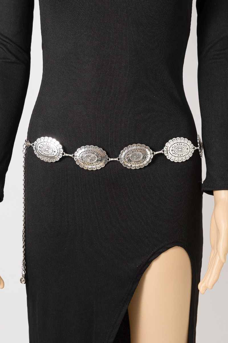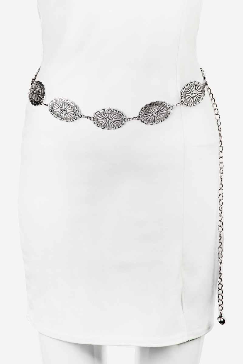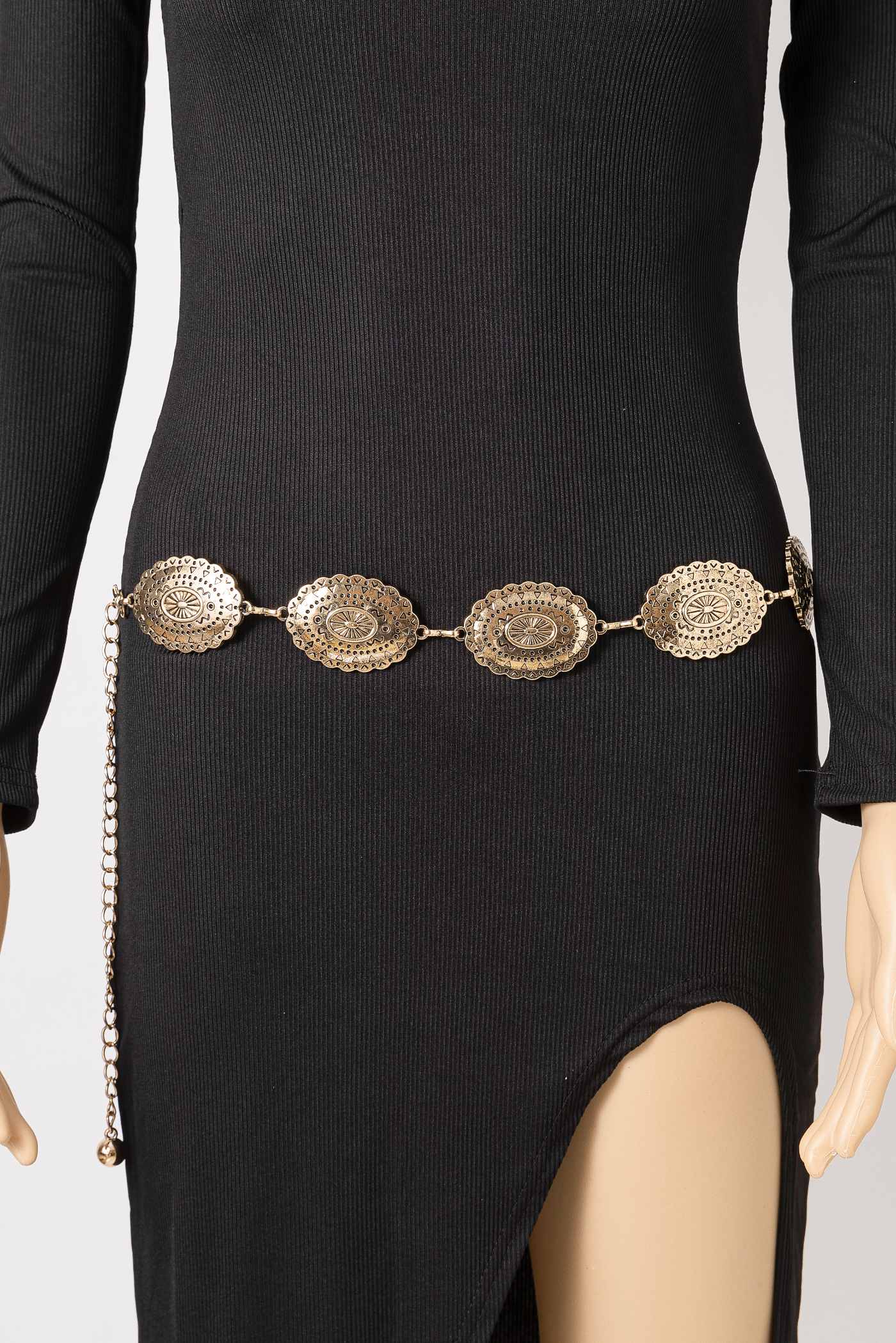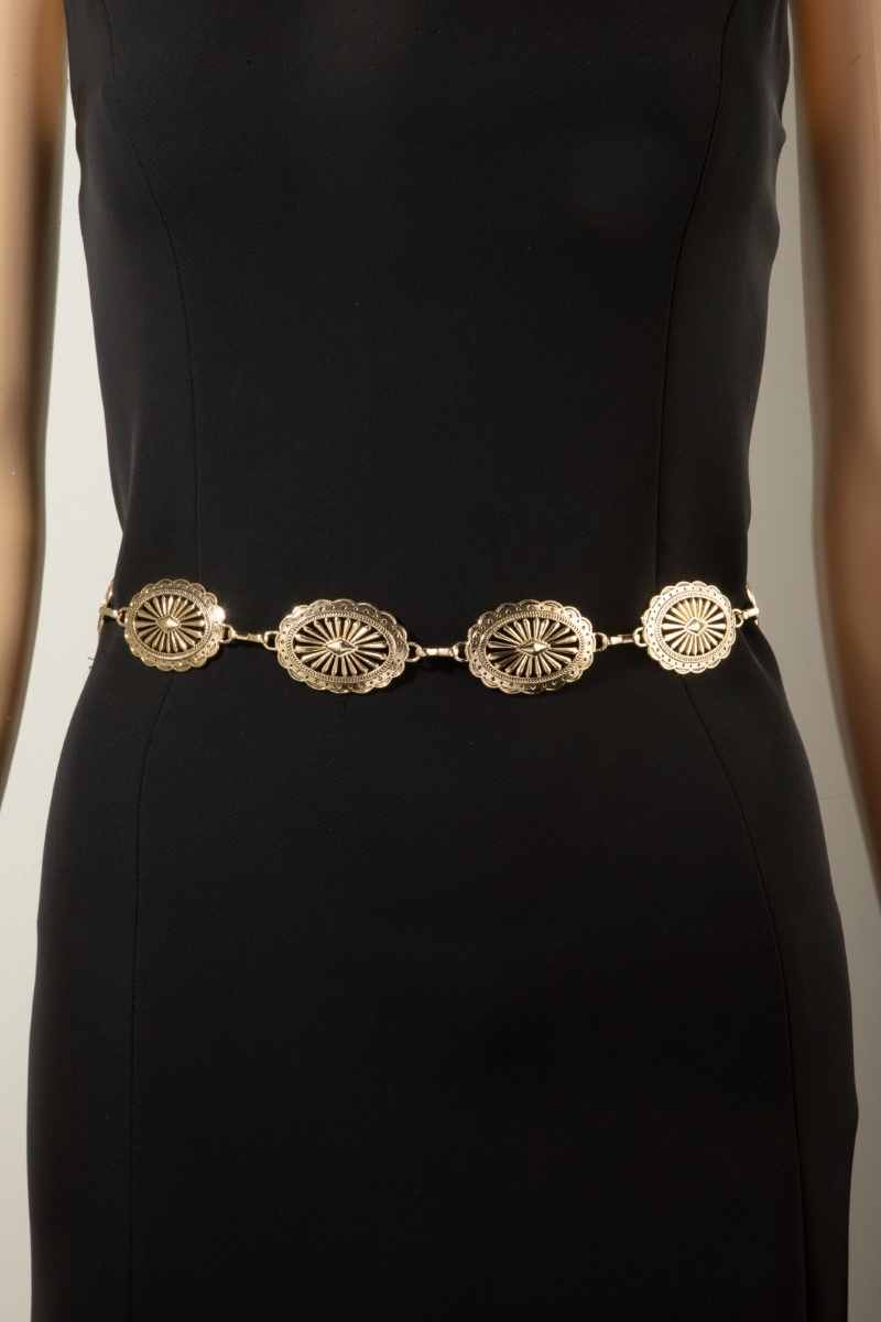 | Gold-tone alloy chain belt featuring oval conchos. | |||