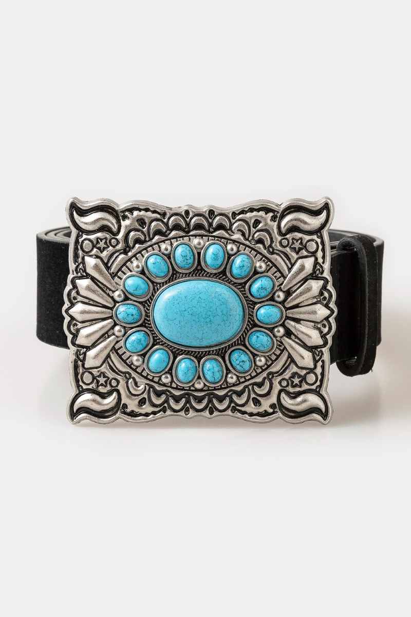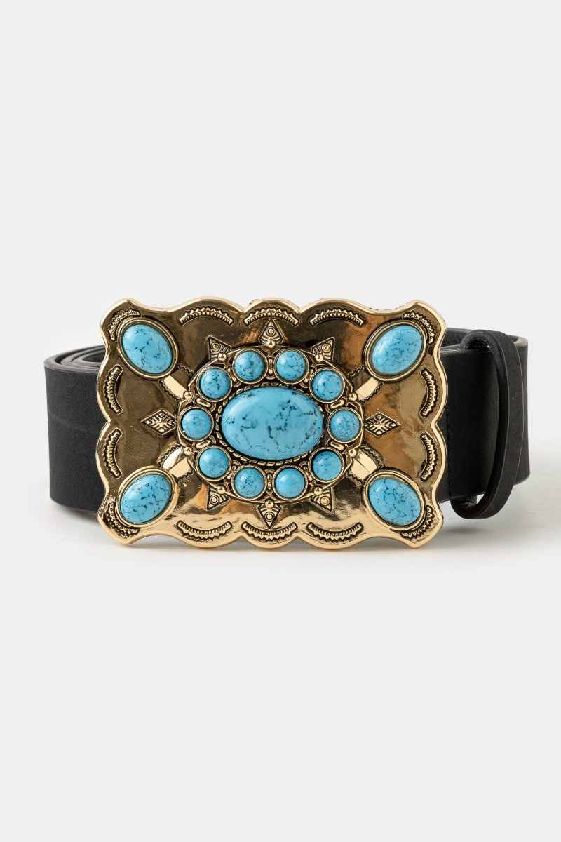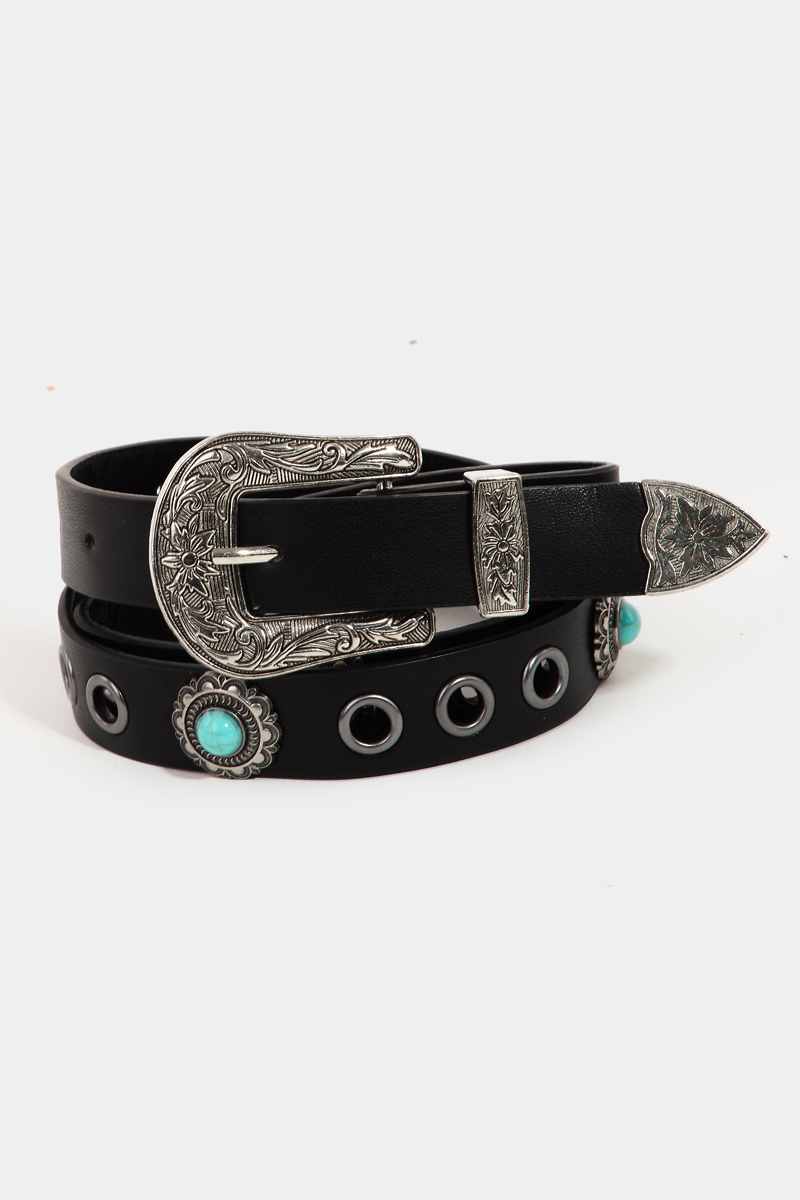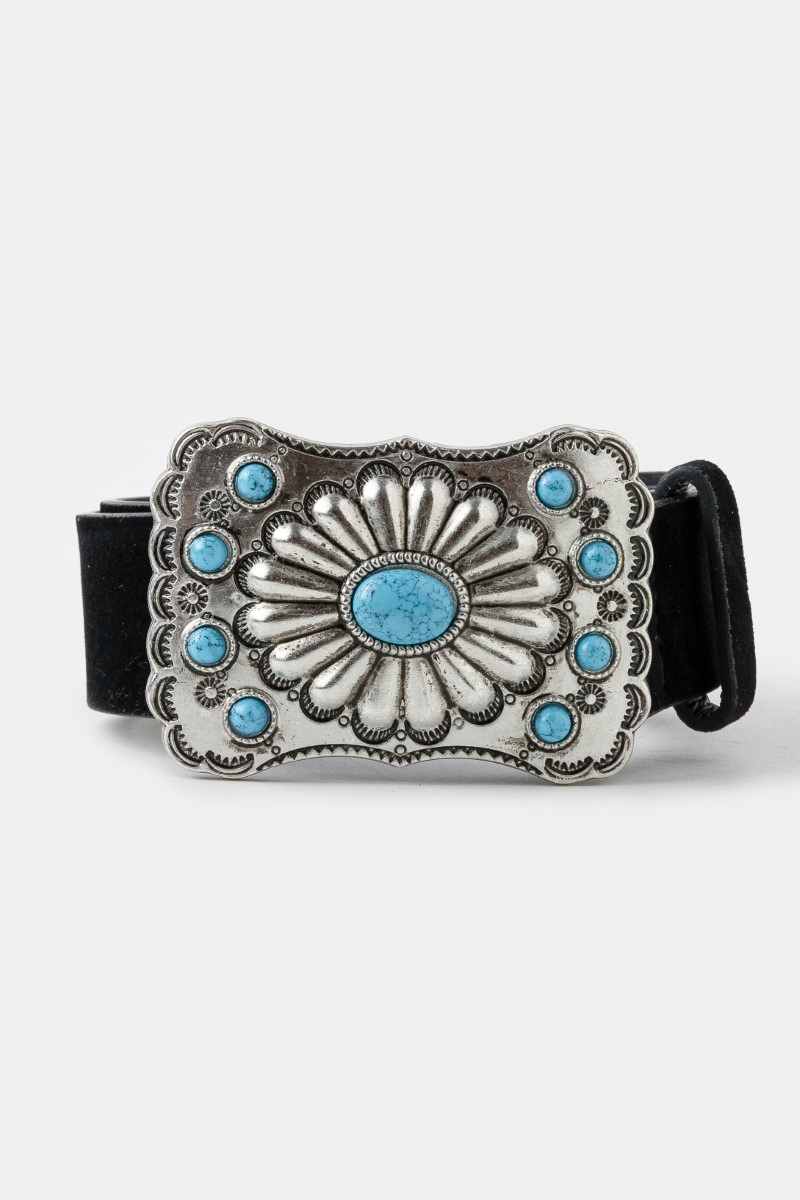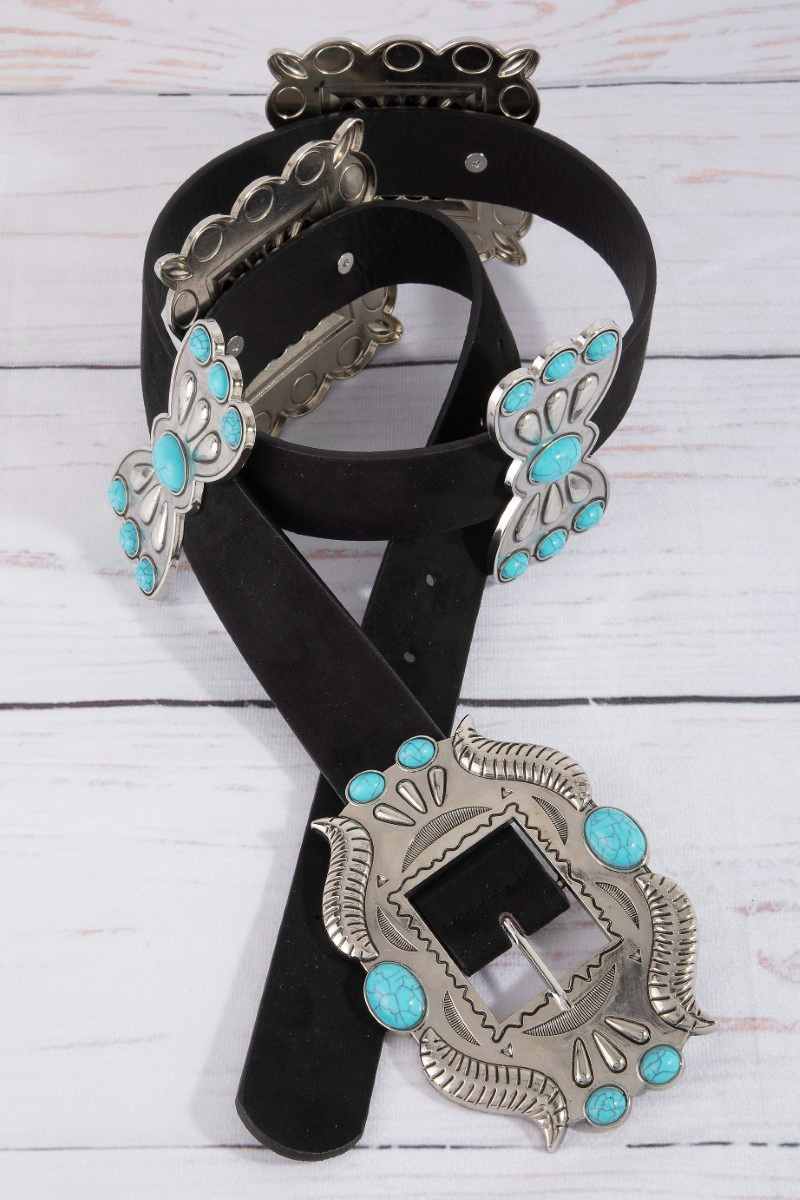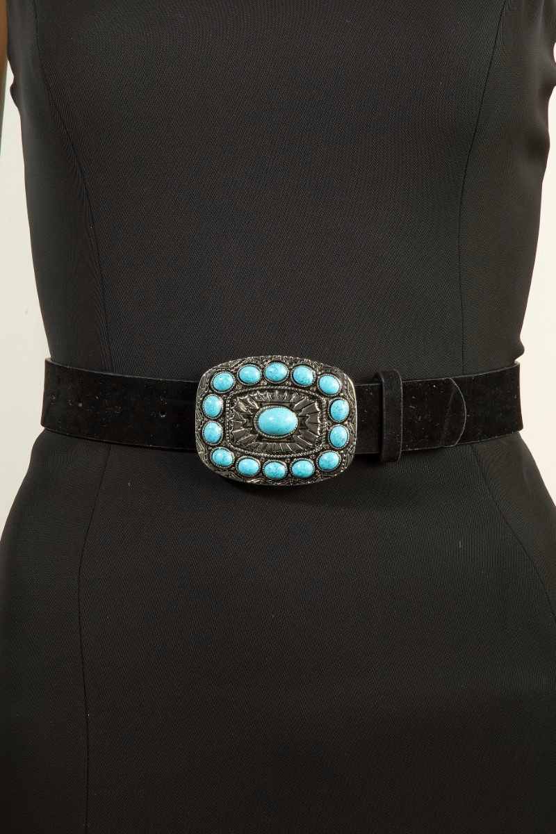| Black PU western belt with ornate silver buckle and turquoise stone accents. | |||