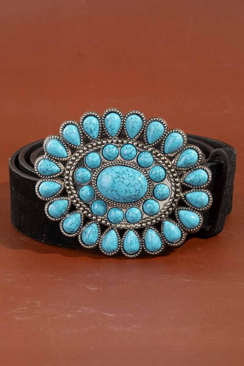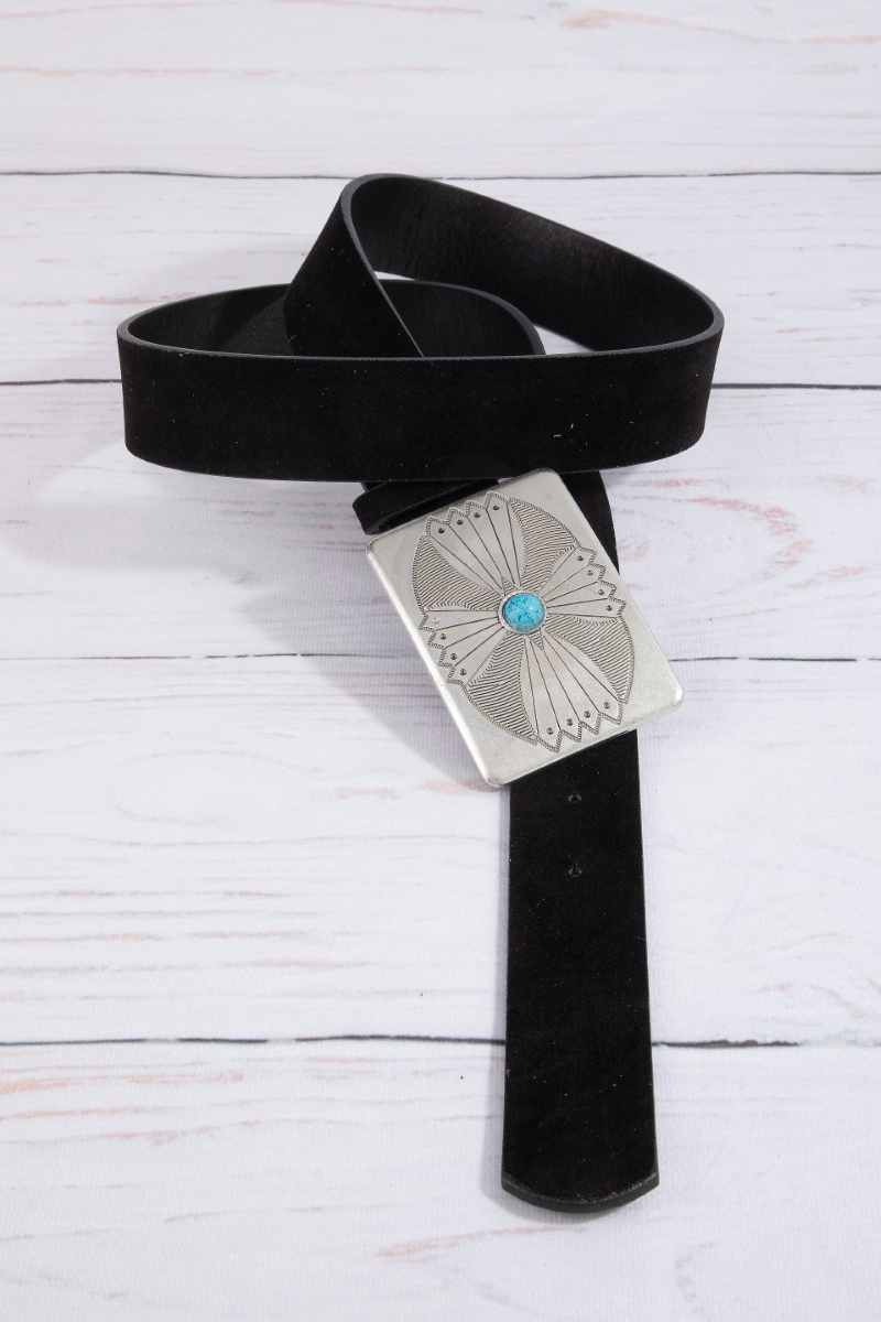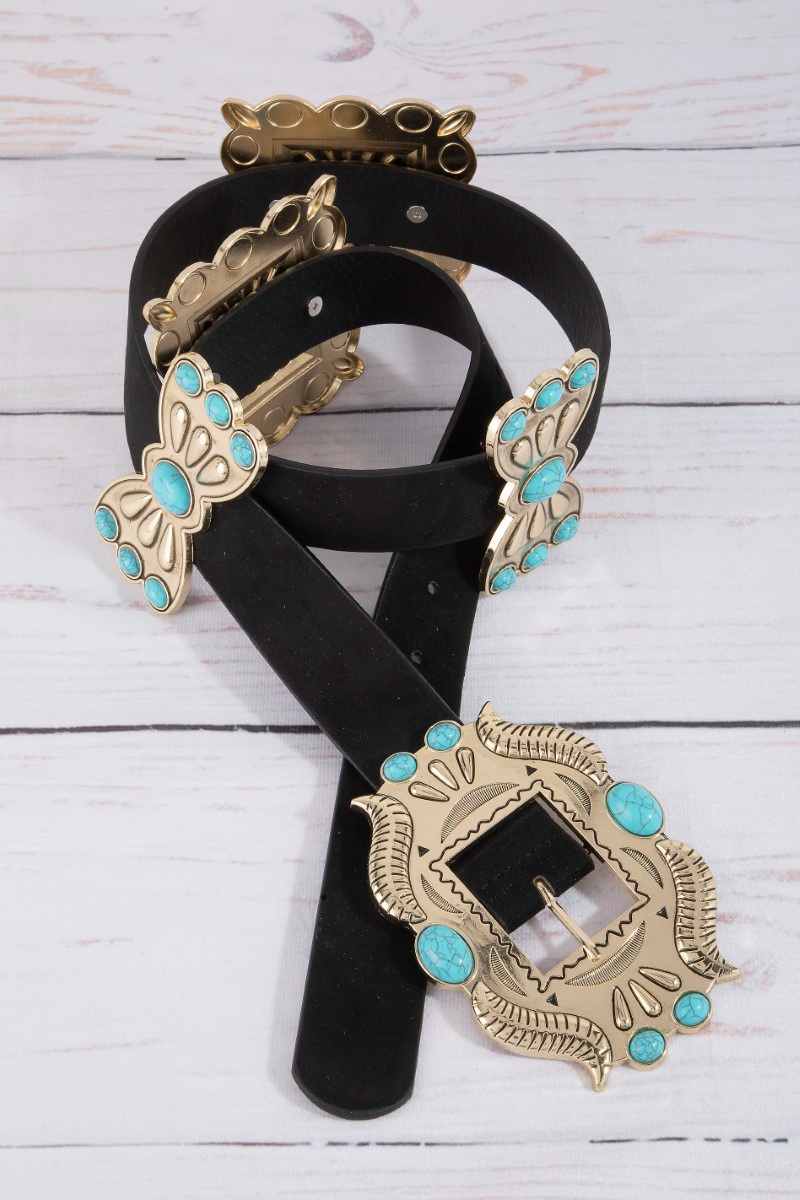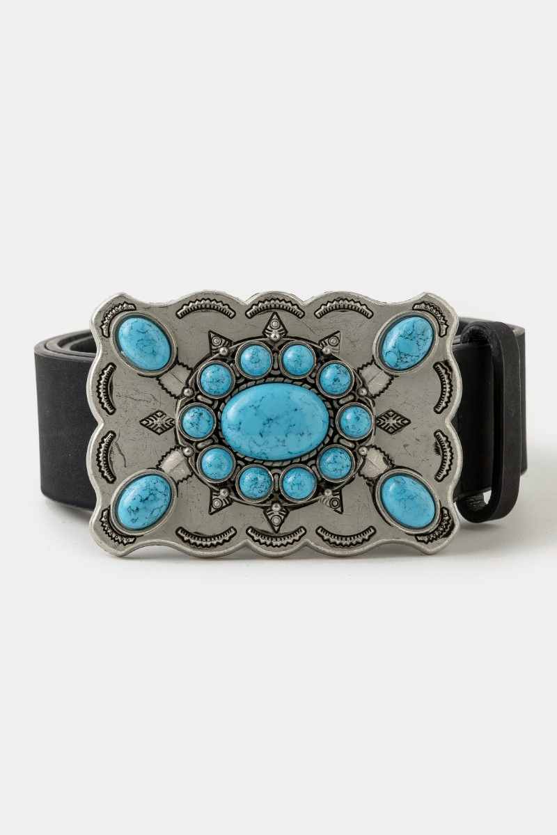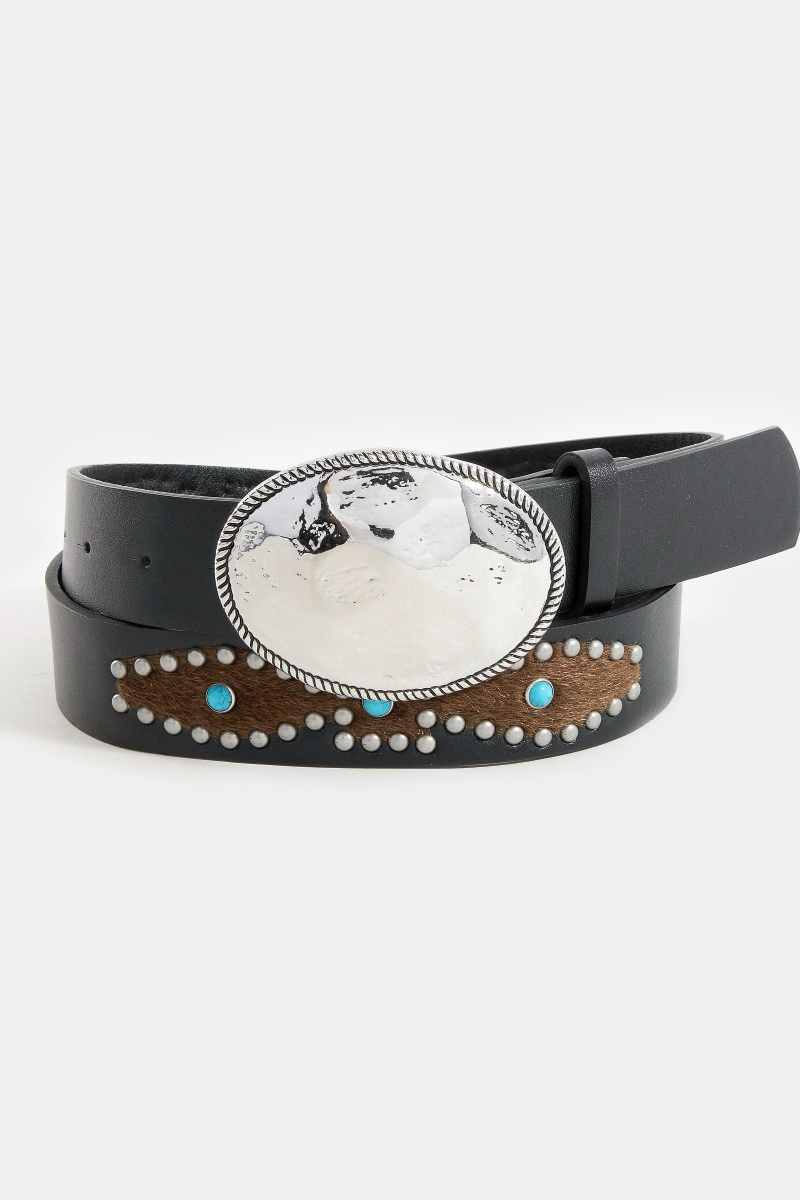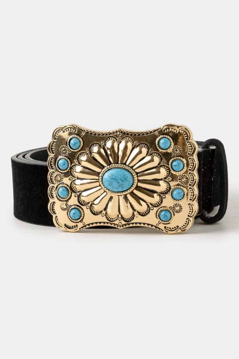 | Black PU western belt with ornate silver buckle and turquoise stone accents. | |||