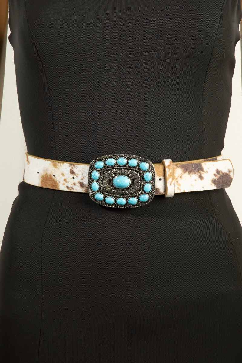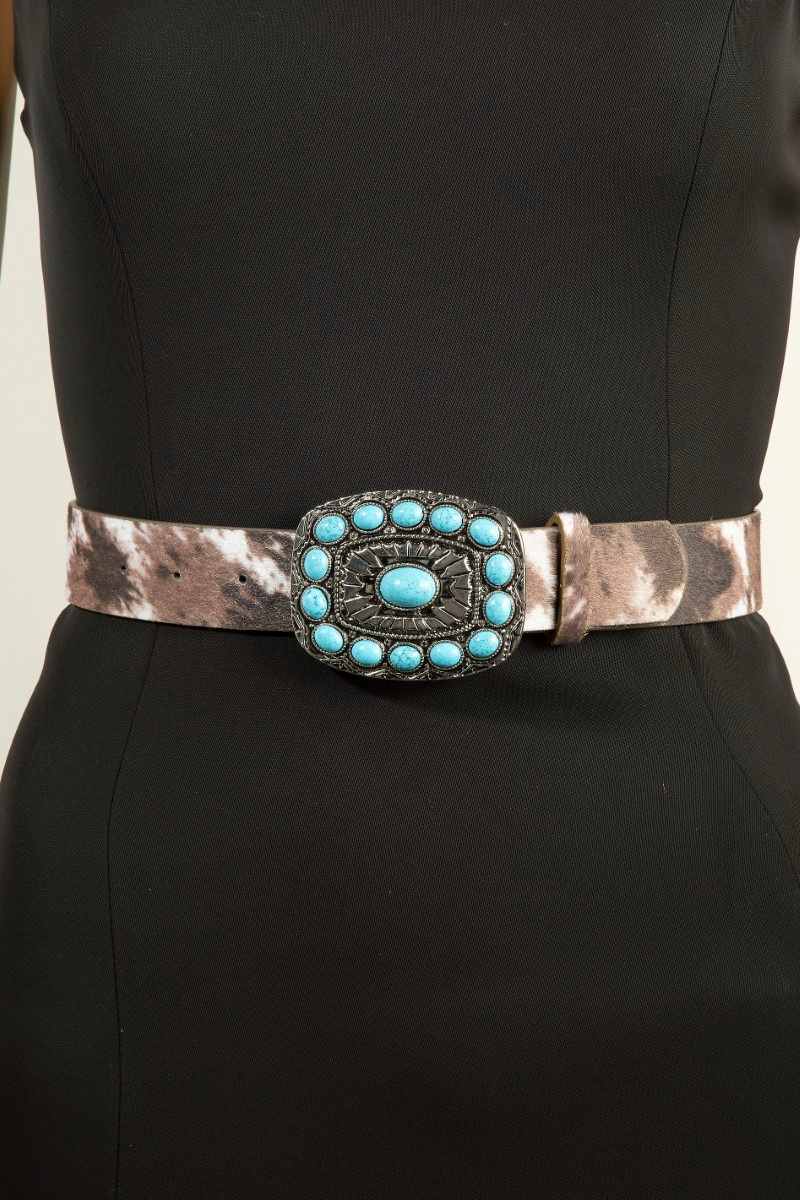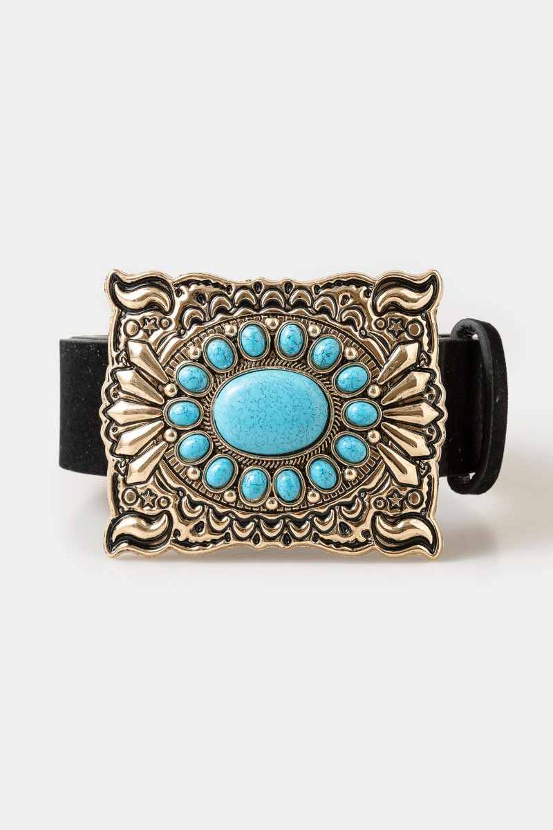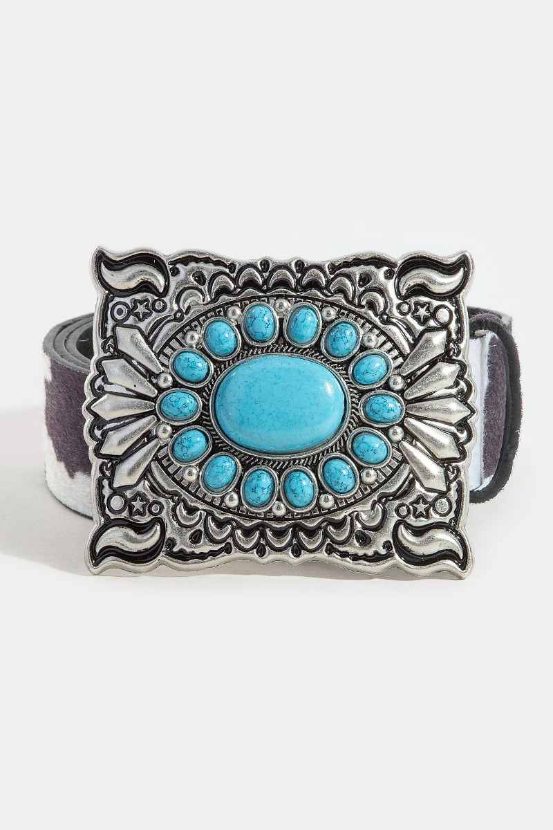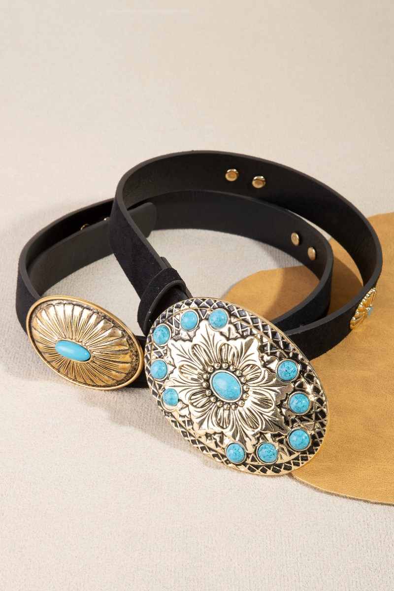 | Black PU western belt with ornate silver buckle and turquoise stone accents. | |||