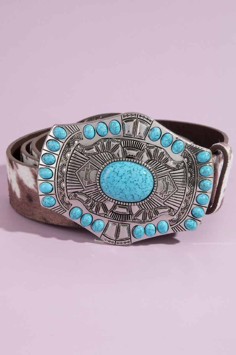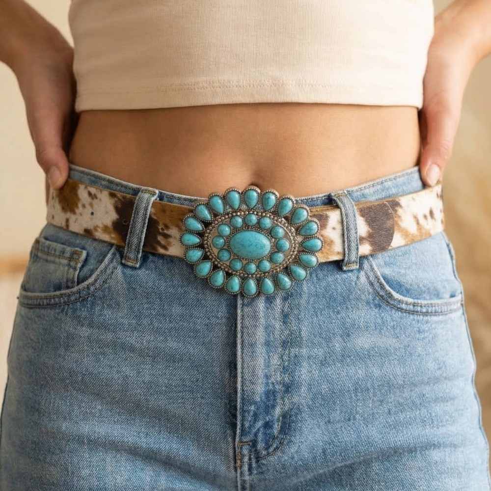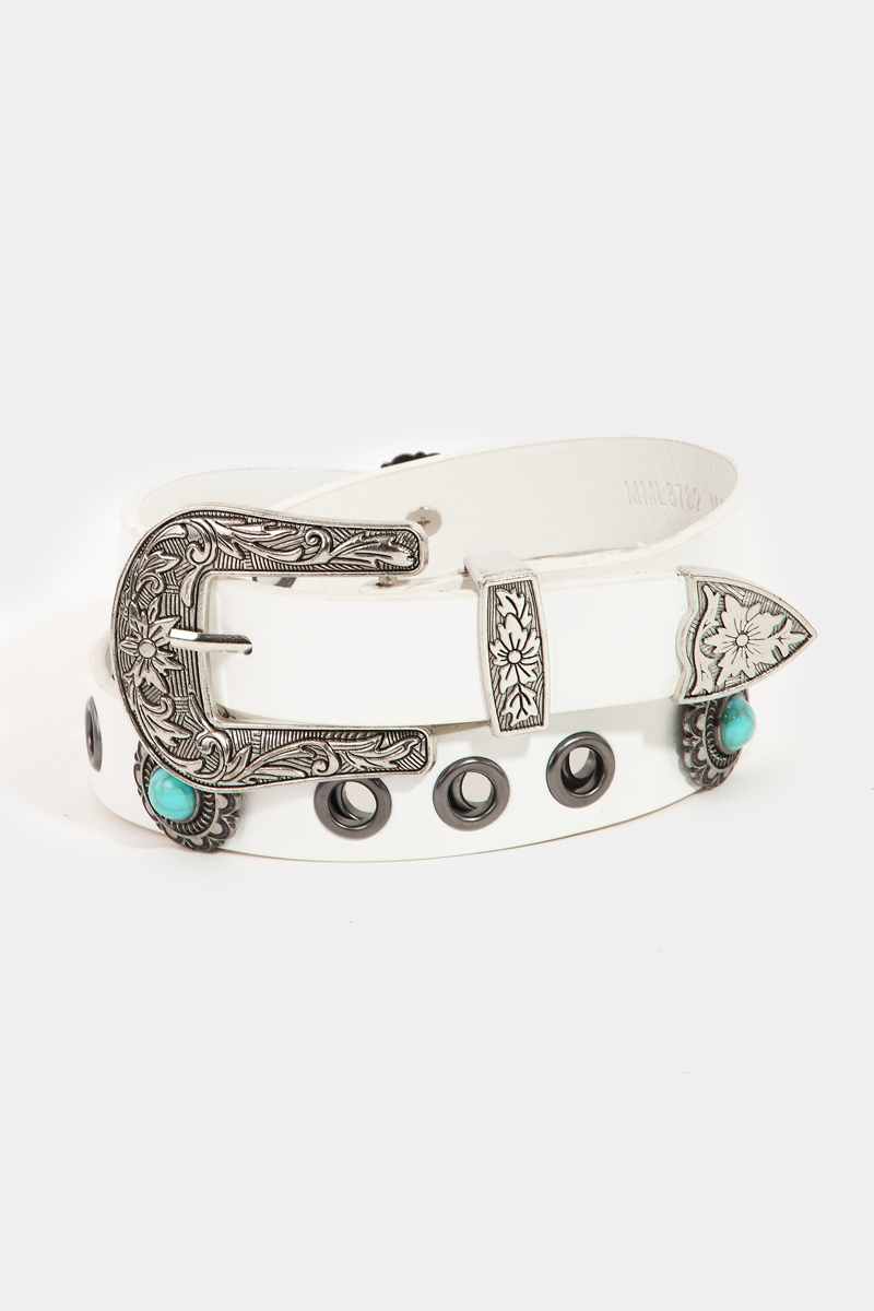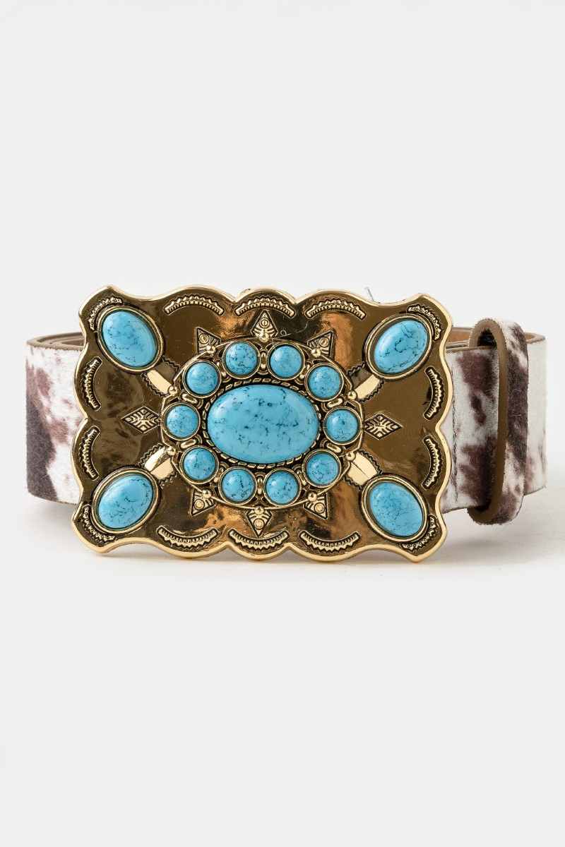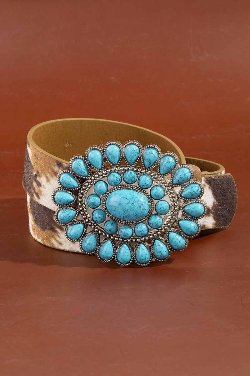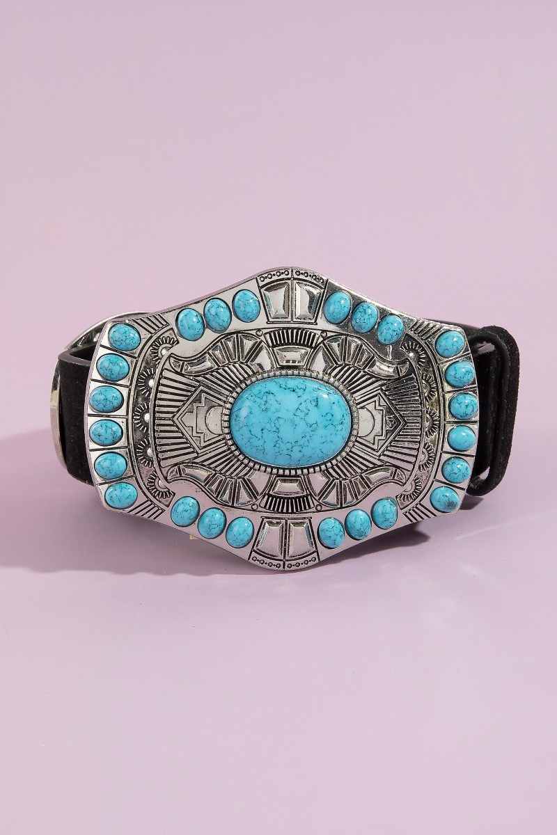 | Black PU western belt with ornate silver buckle and turquoise stone accents. | |||