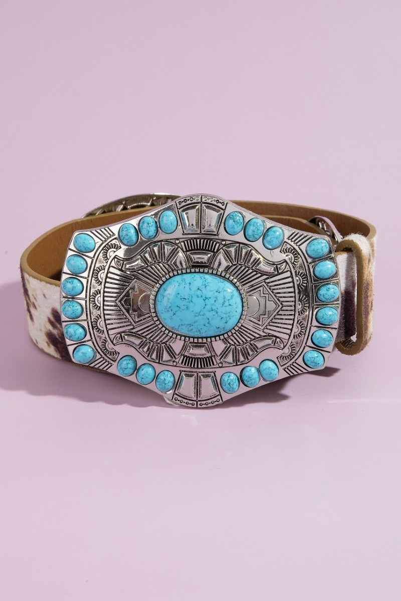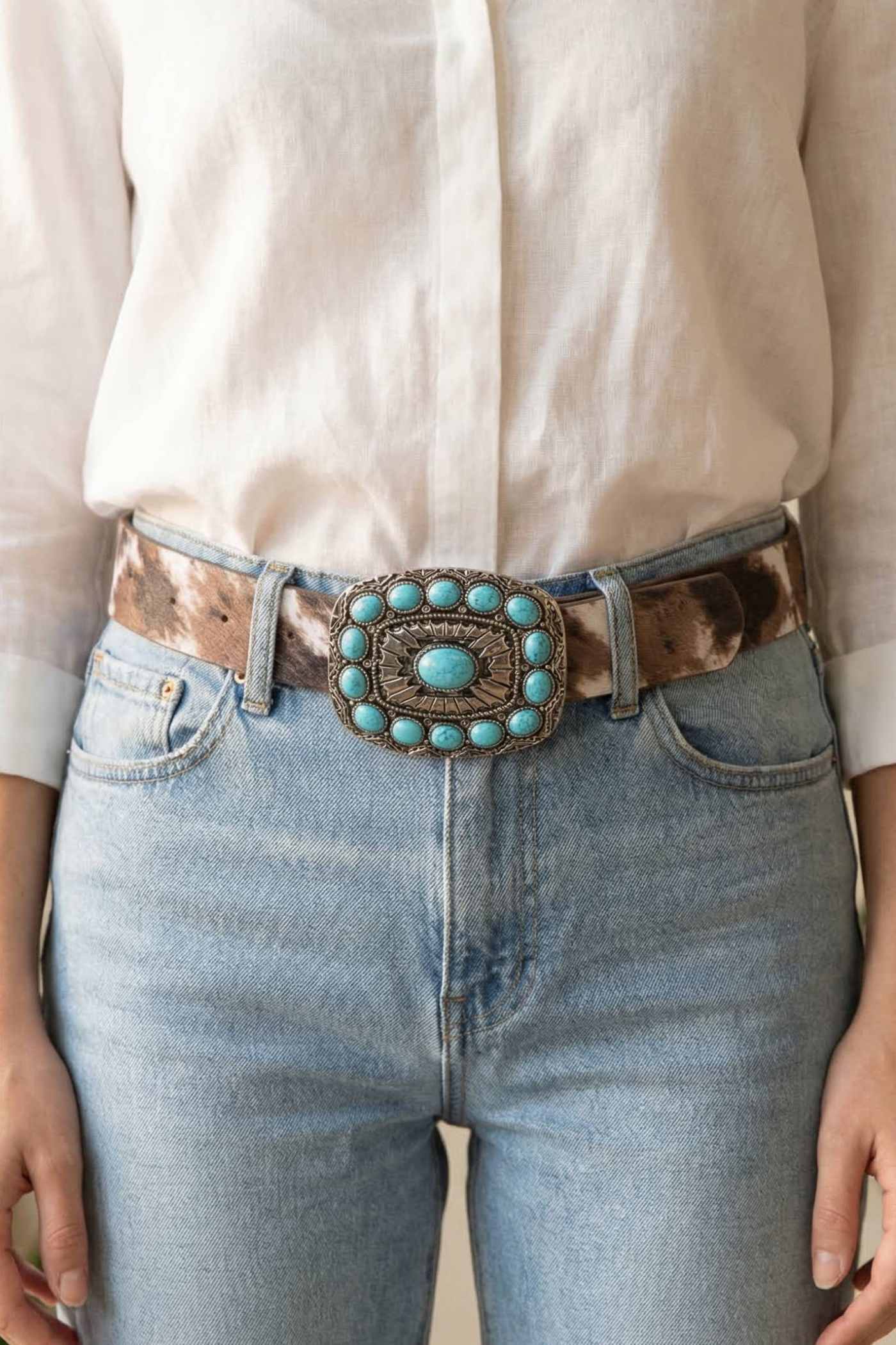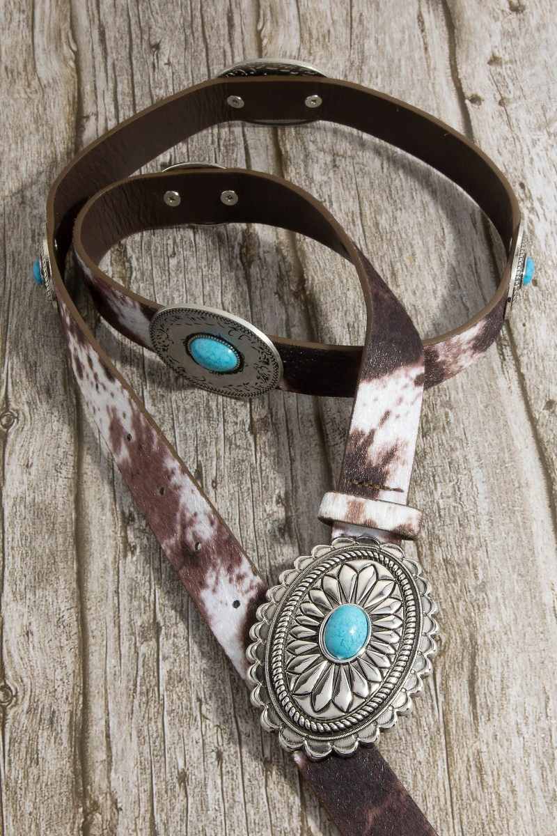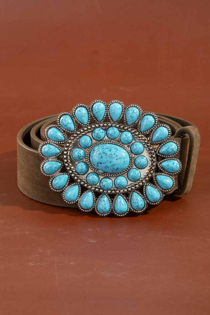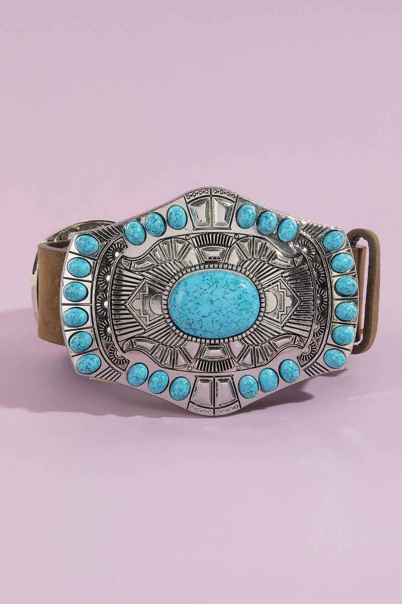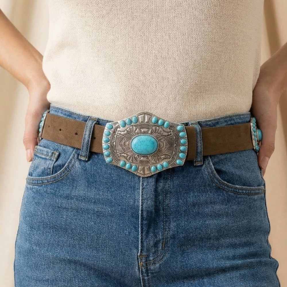 | Black PU western belt with ornate silver buckle and turquoise stone accents. | |||