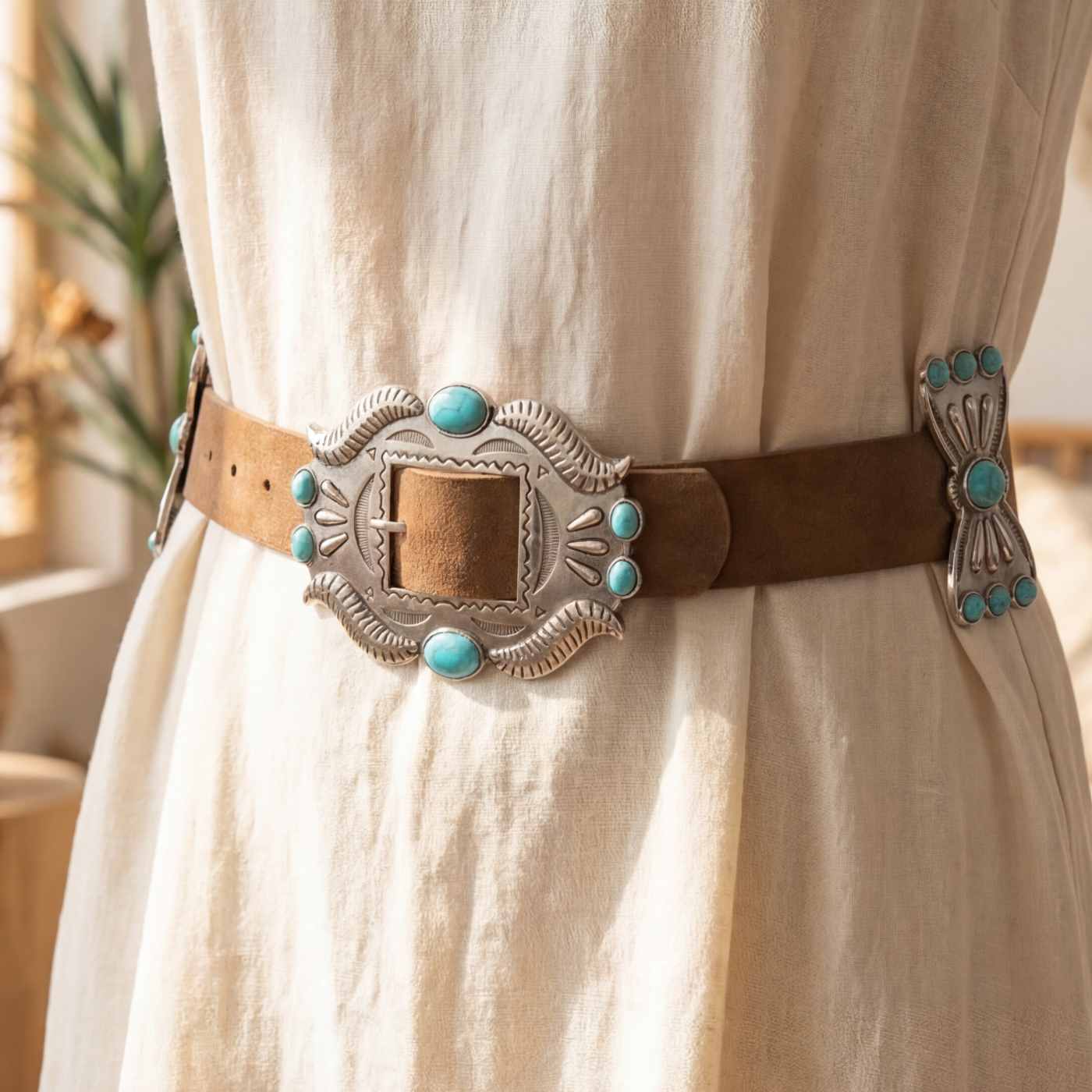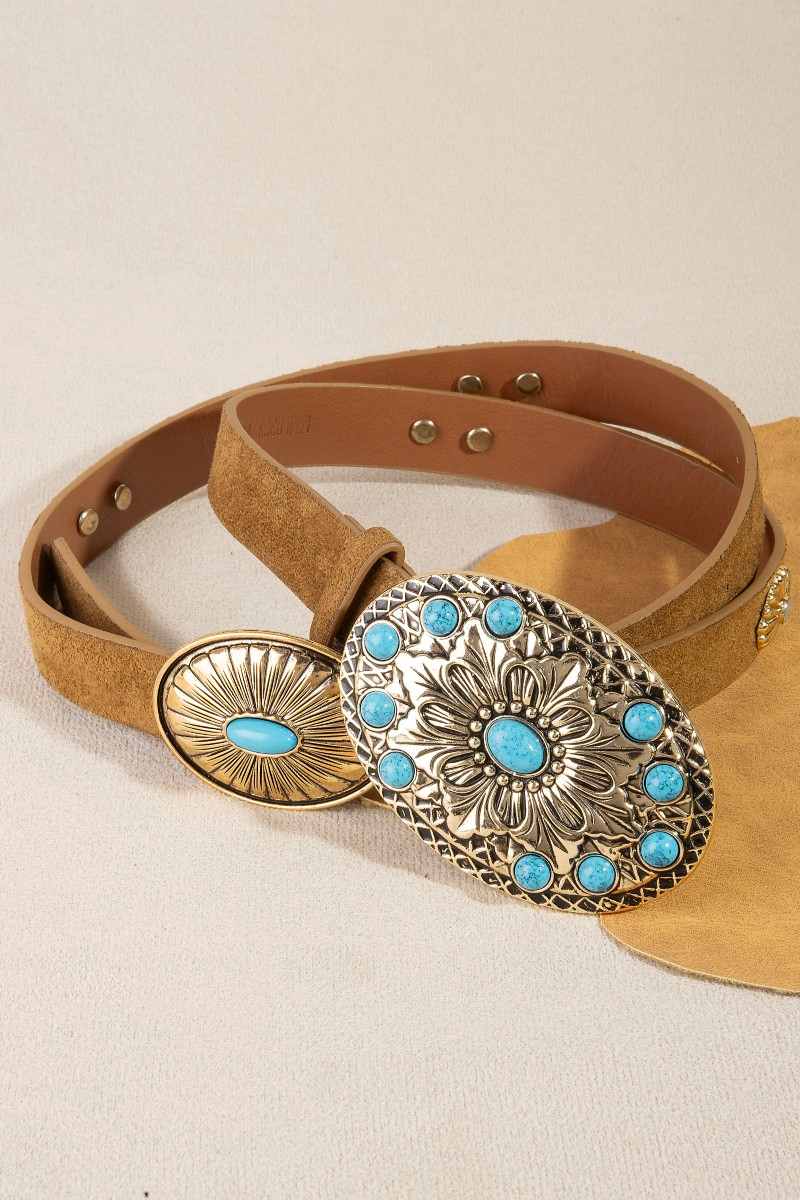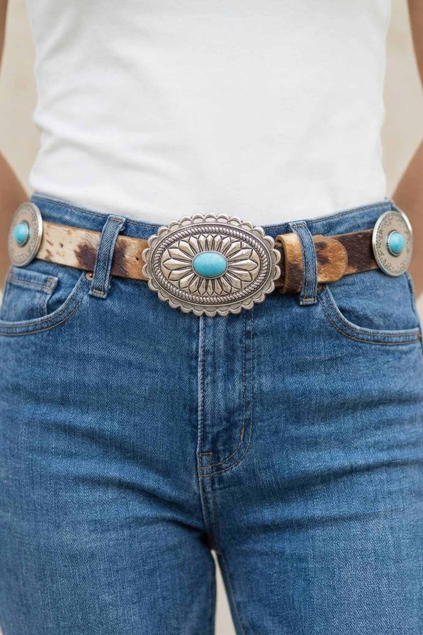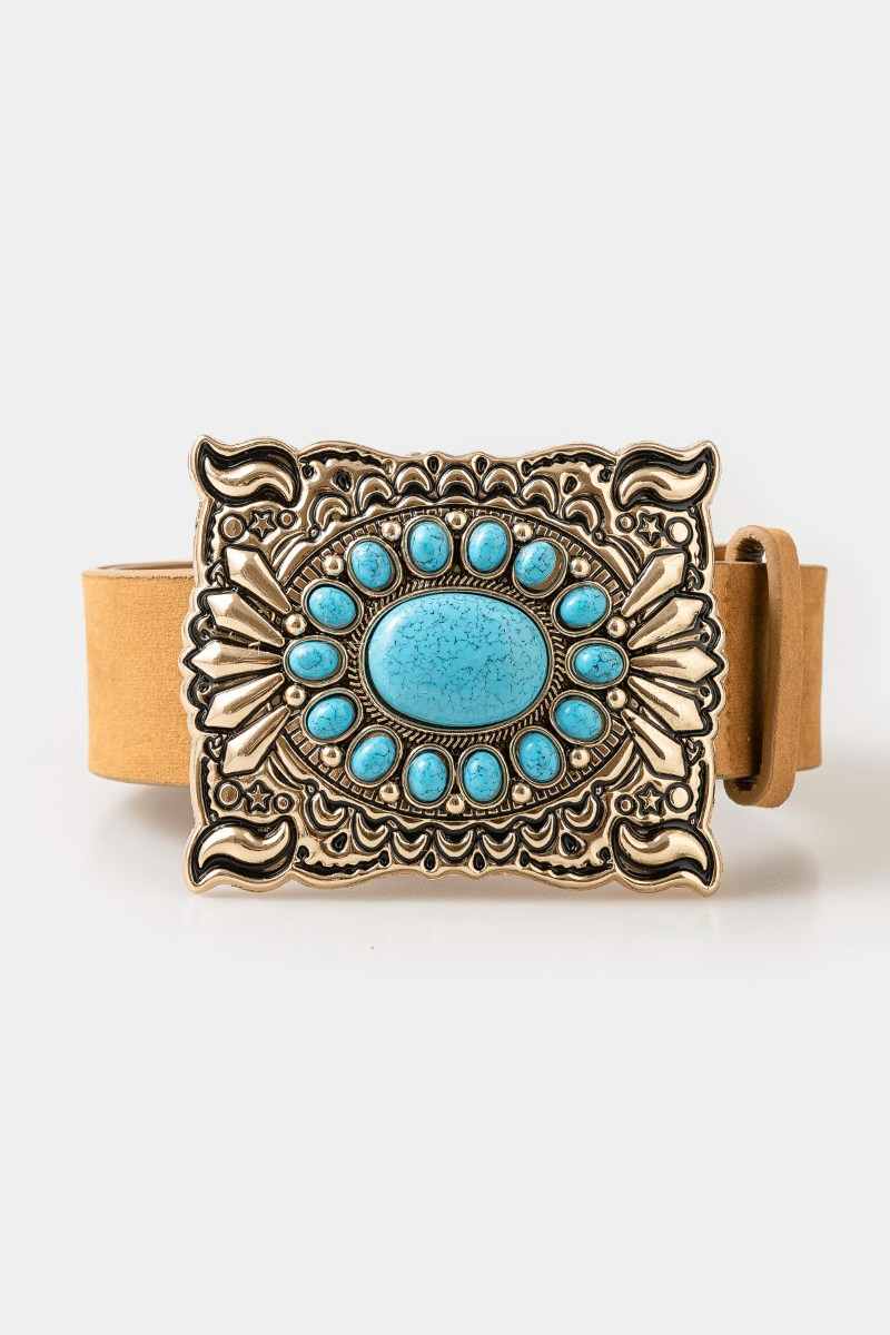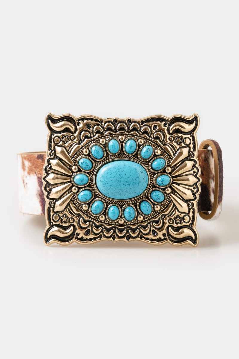 | Black PU western belt with ornate silver buckle and turquoise stone accents. | |||