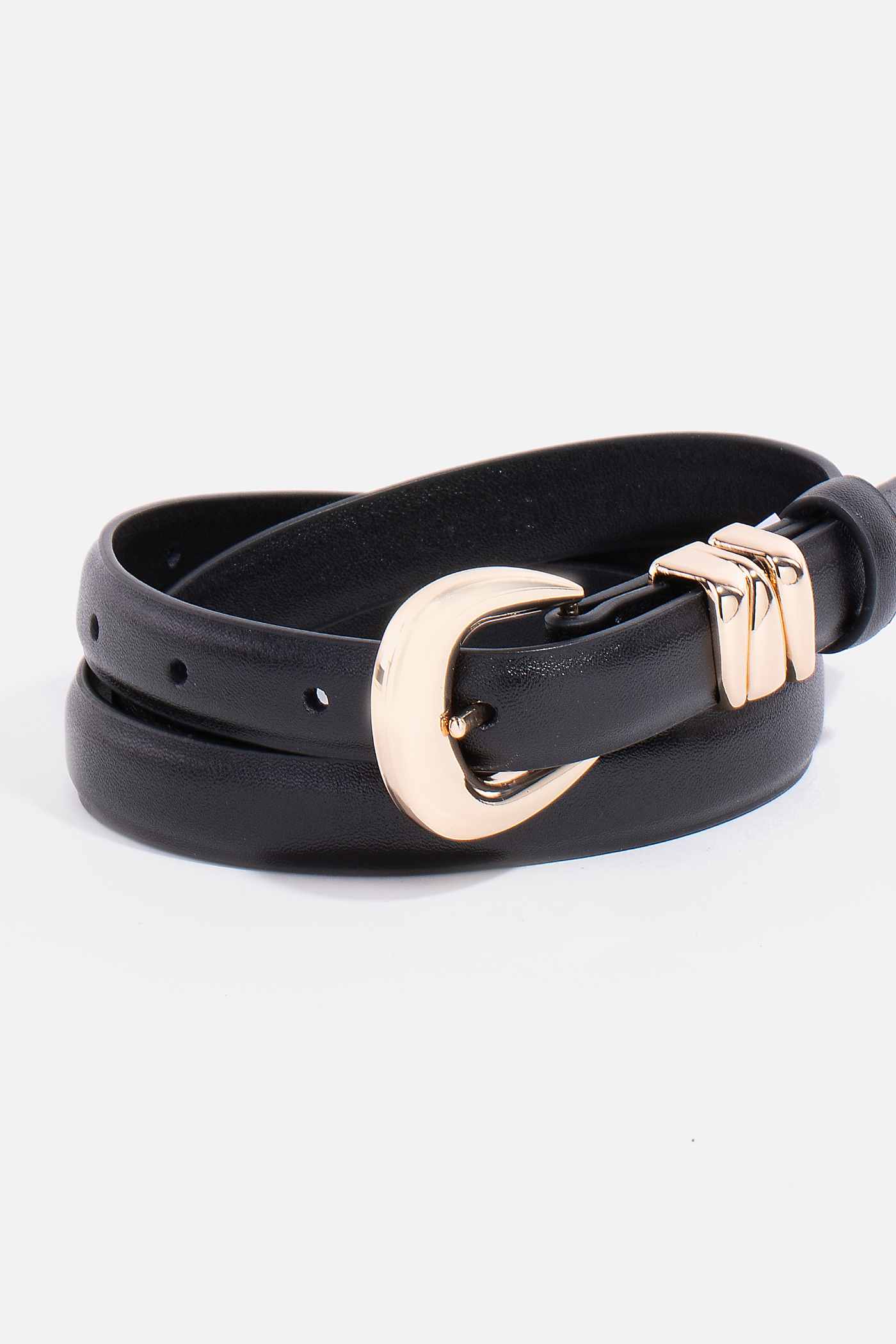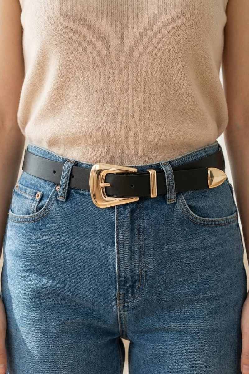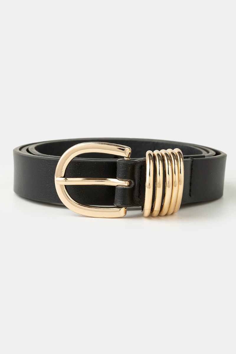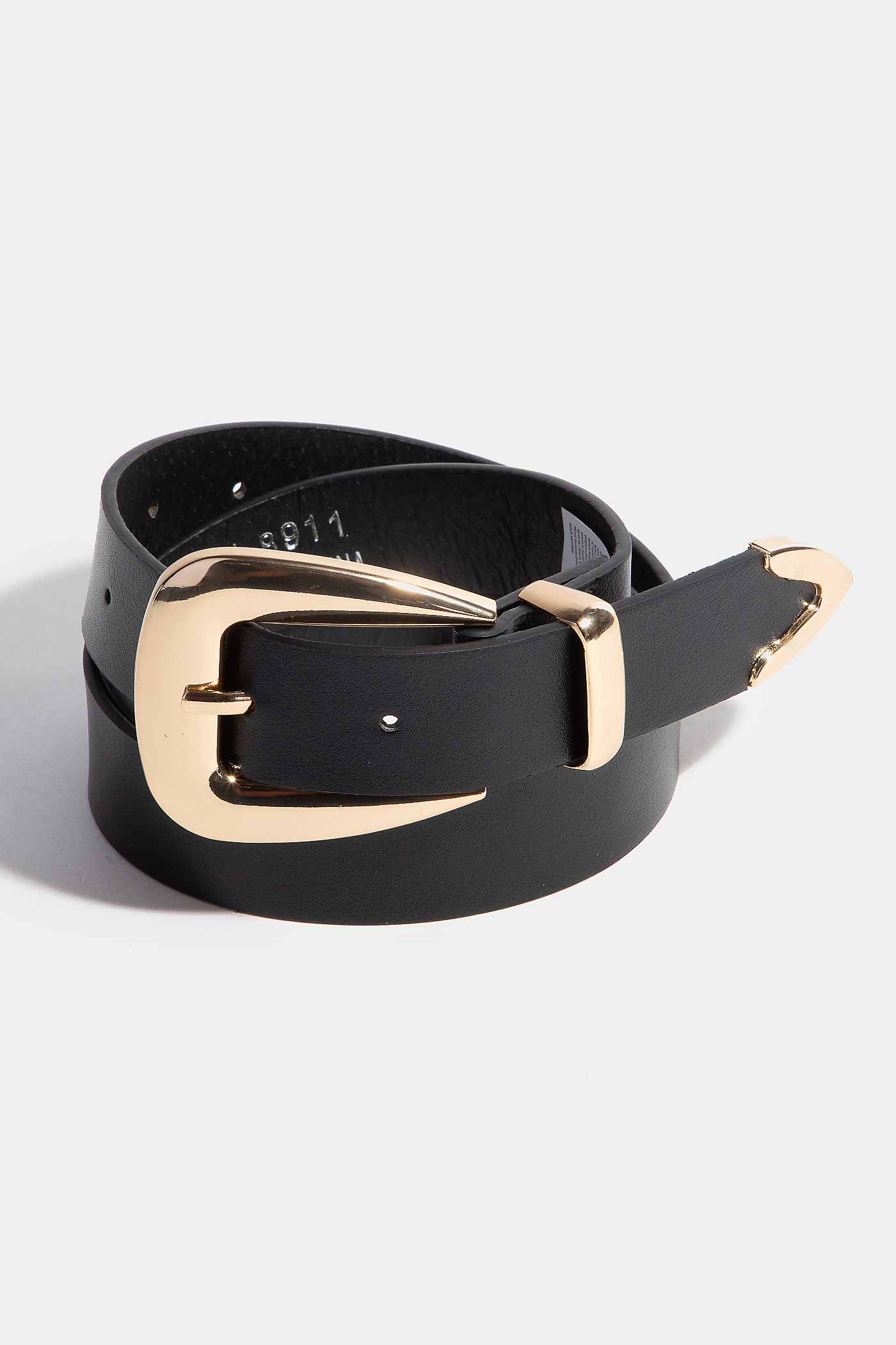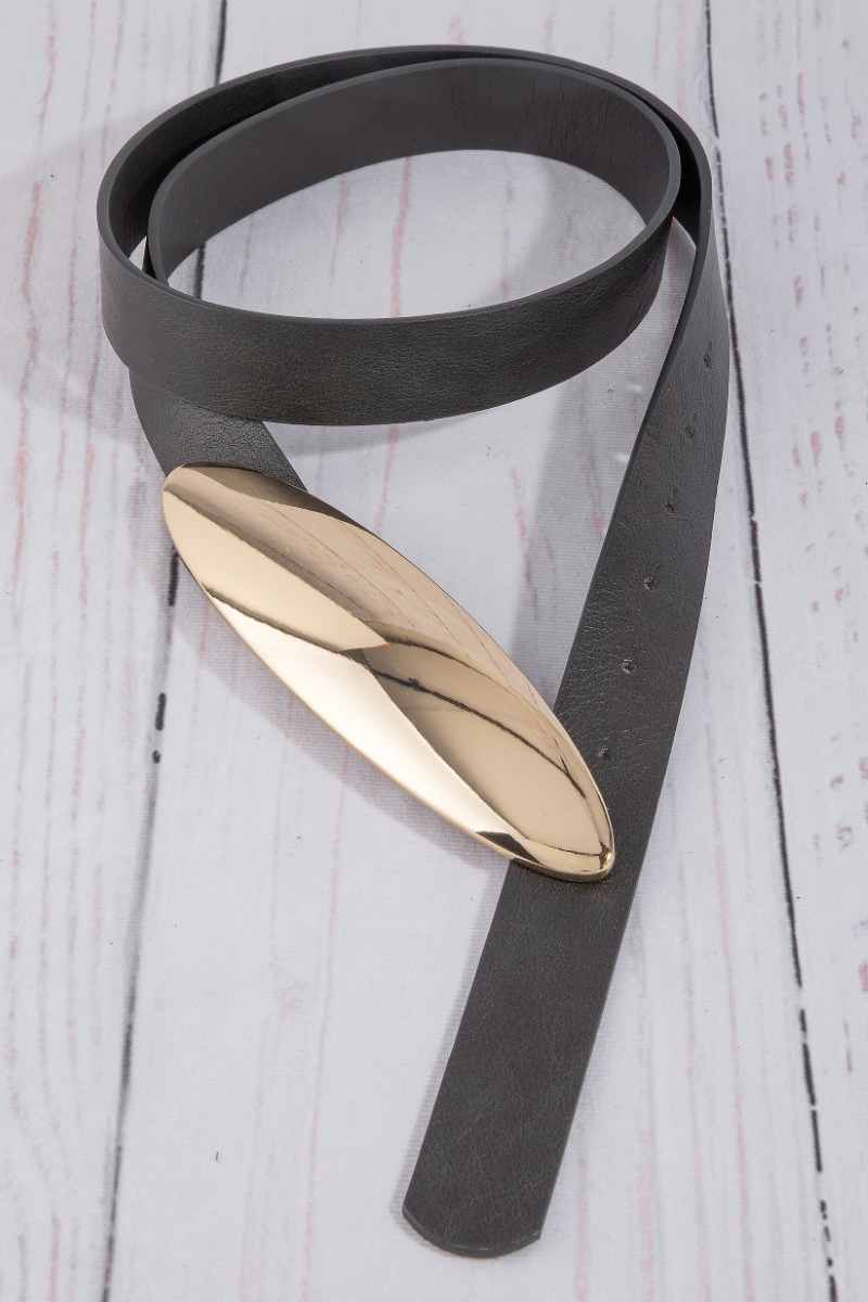 | Black faux leather belt featuring a sleek, polished gold. | |||||