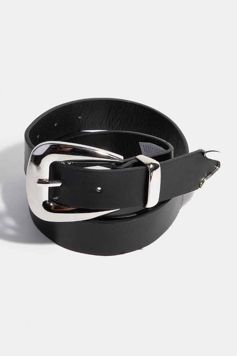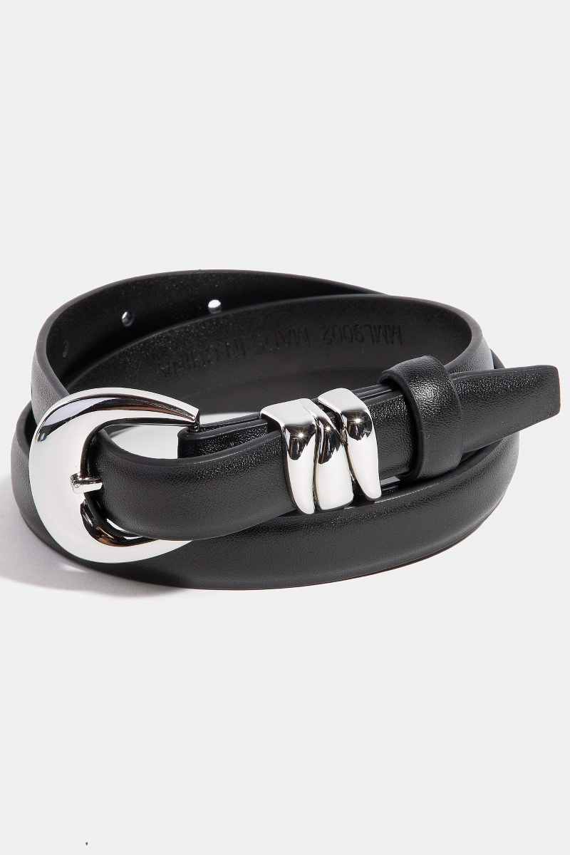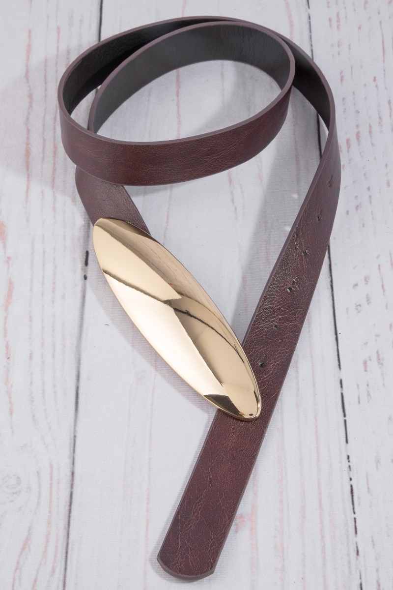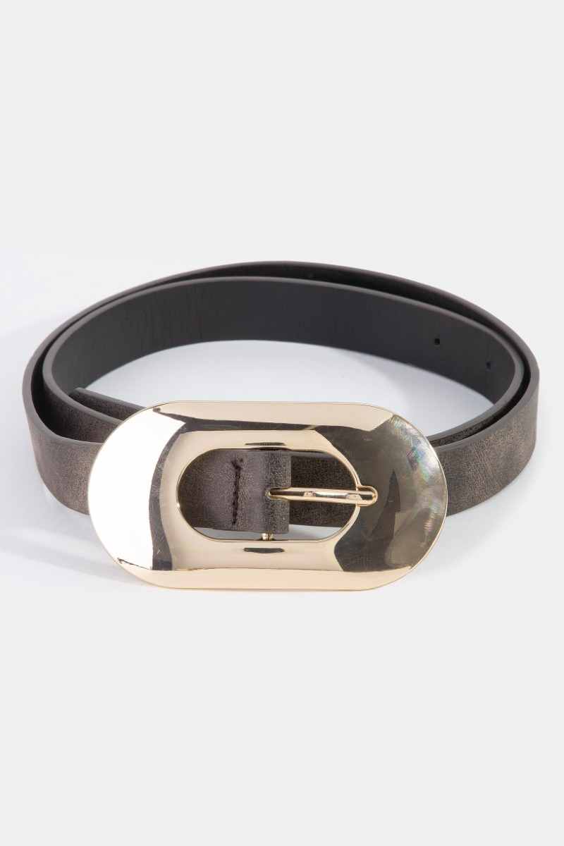 | Black faux leather belt featuring a sleek, polished gold. | |||||