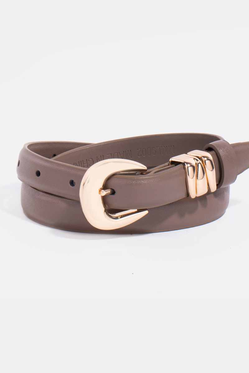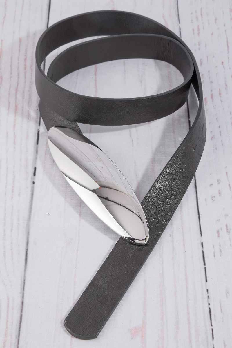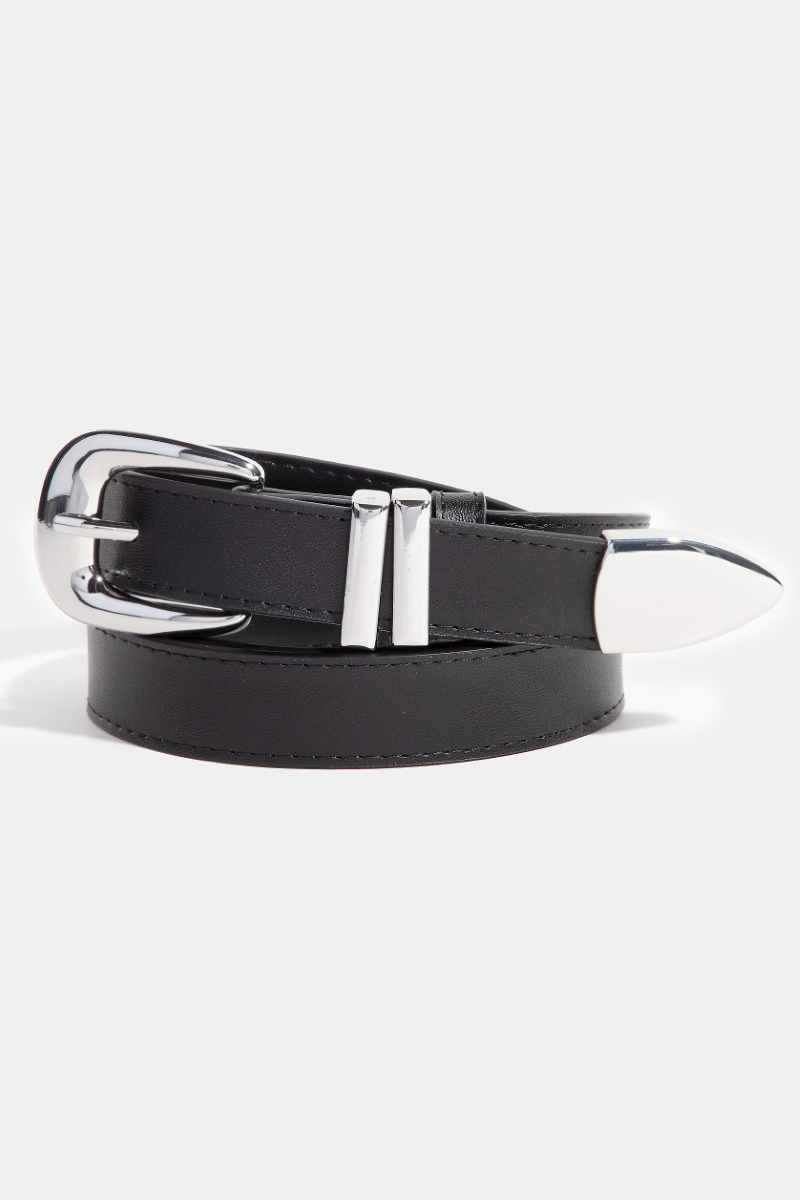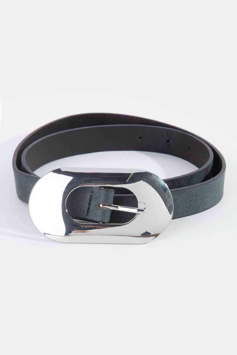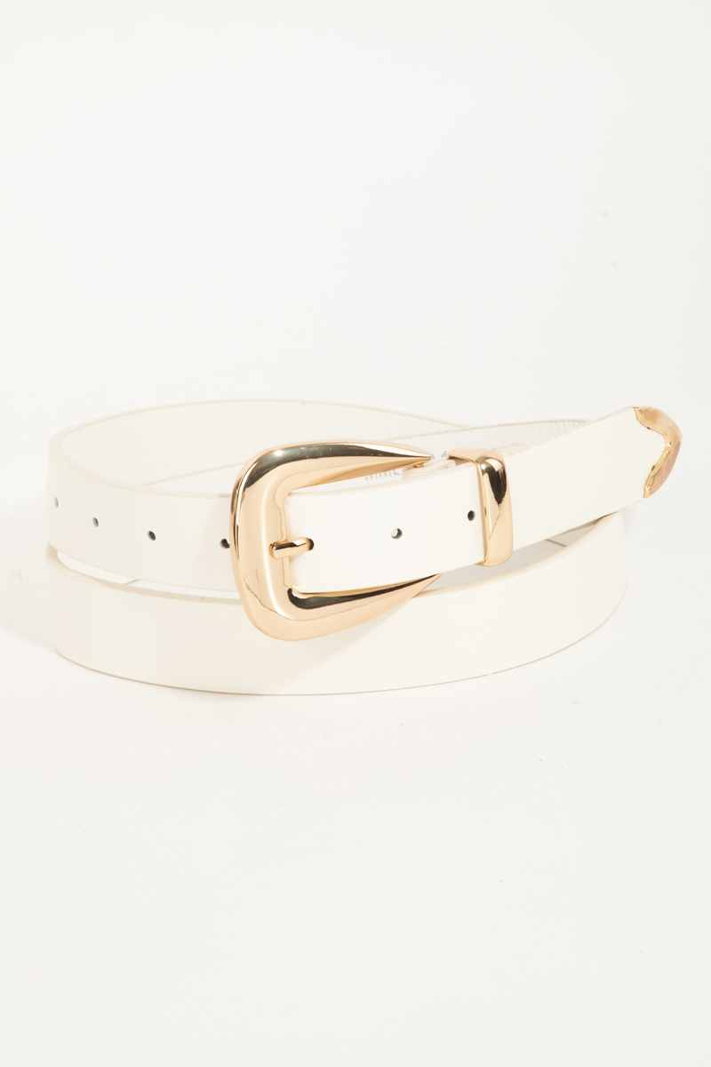 | Black faux leather belt featuring a sleek, polished gold. | |||||