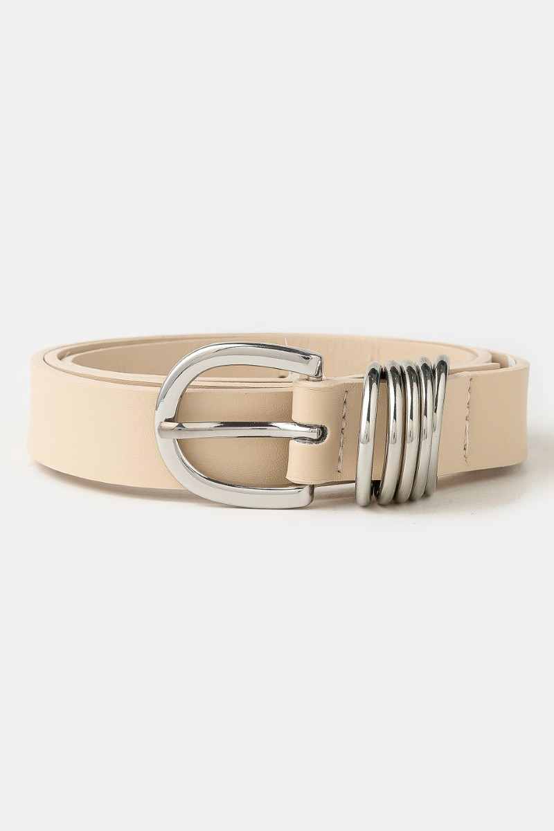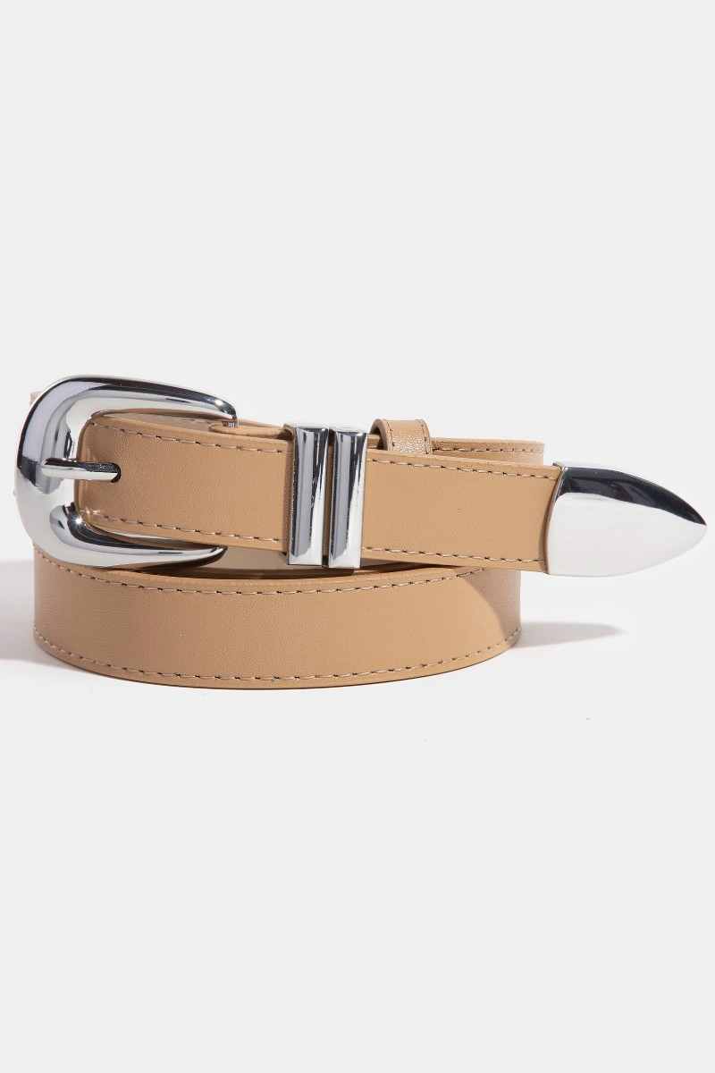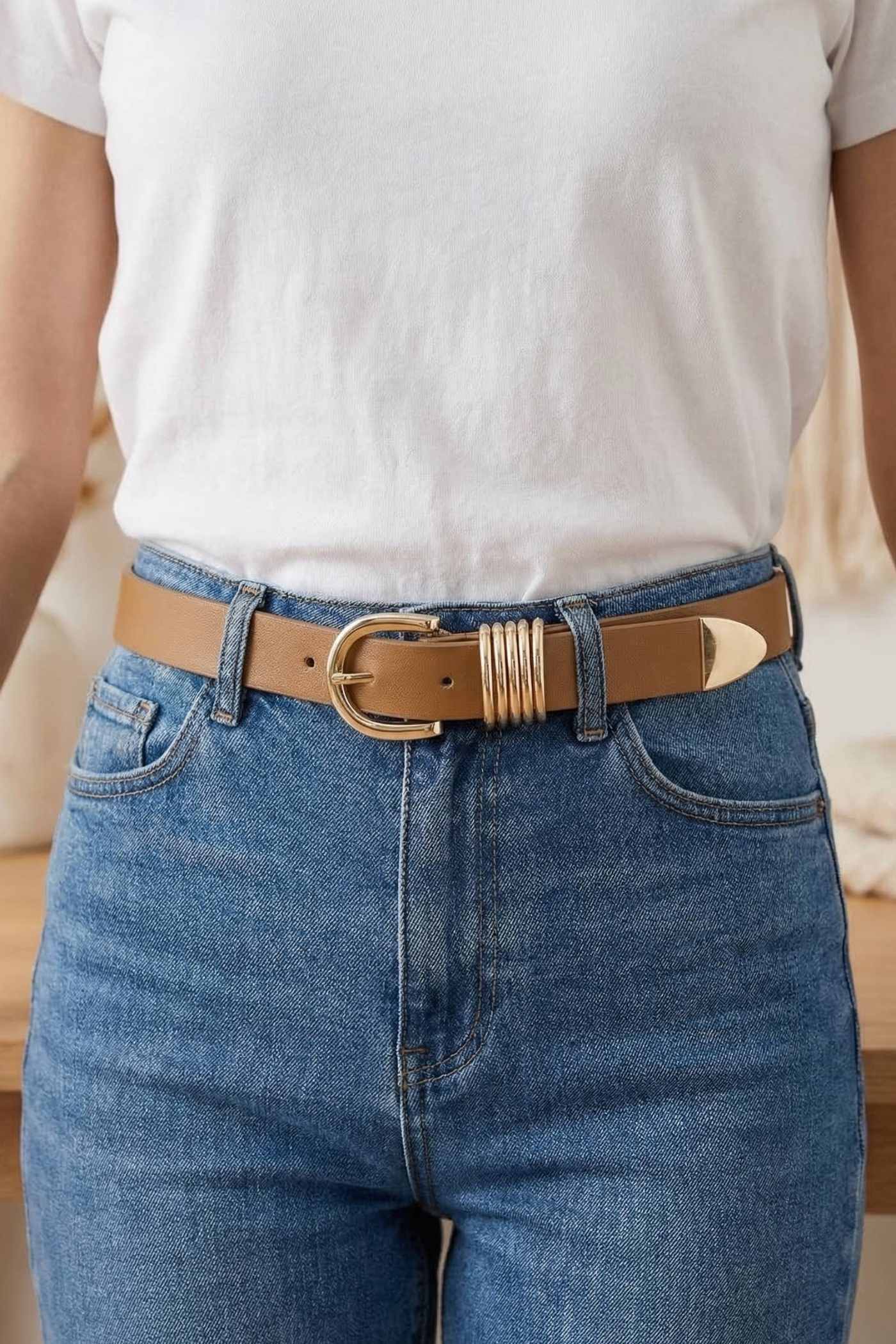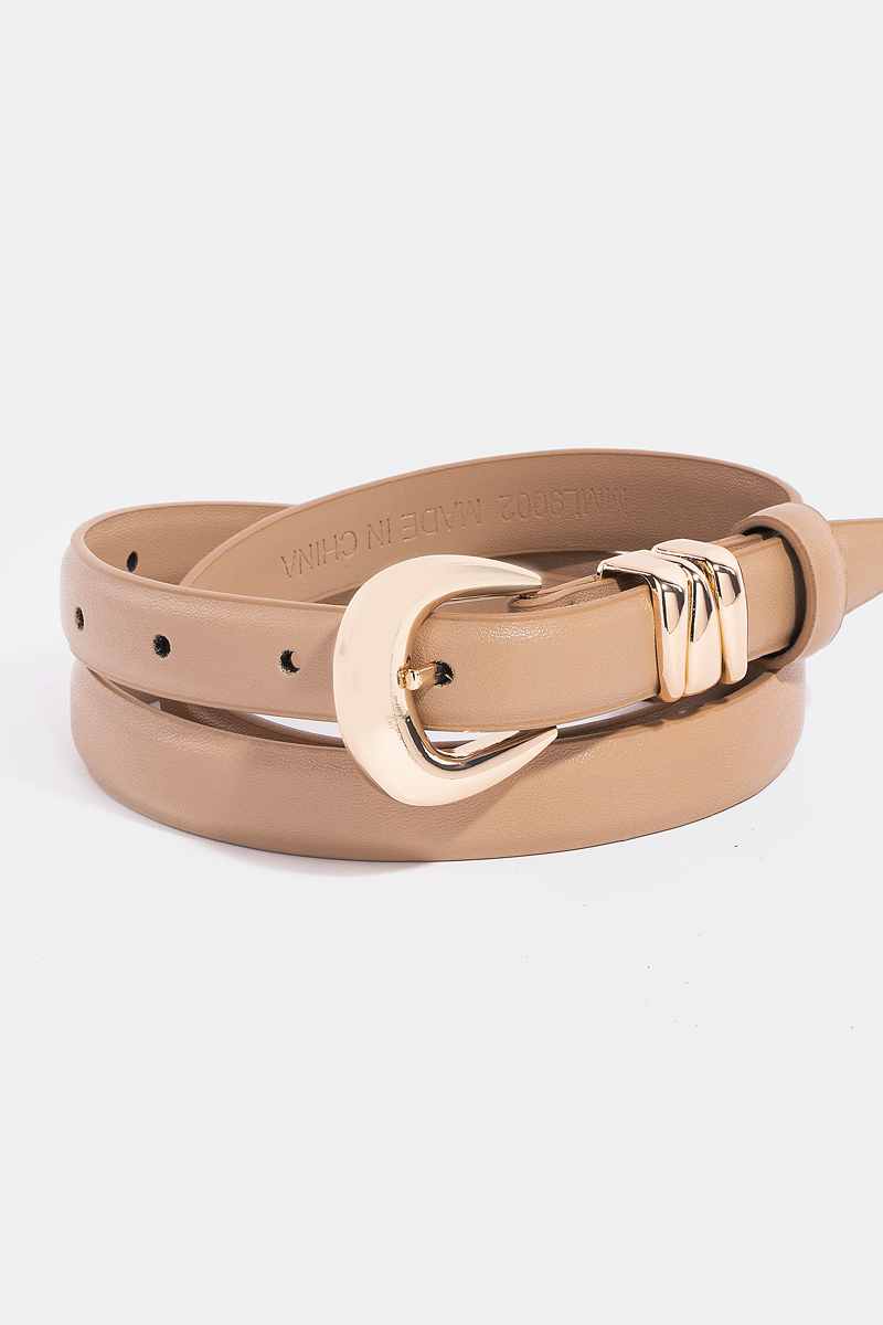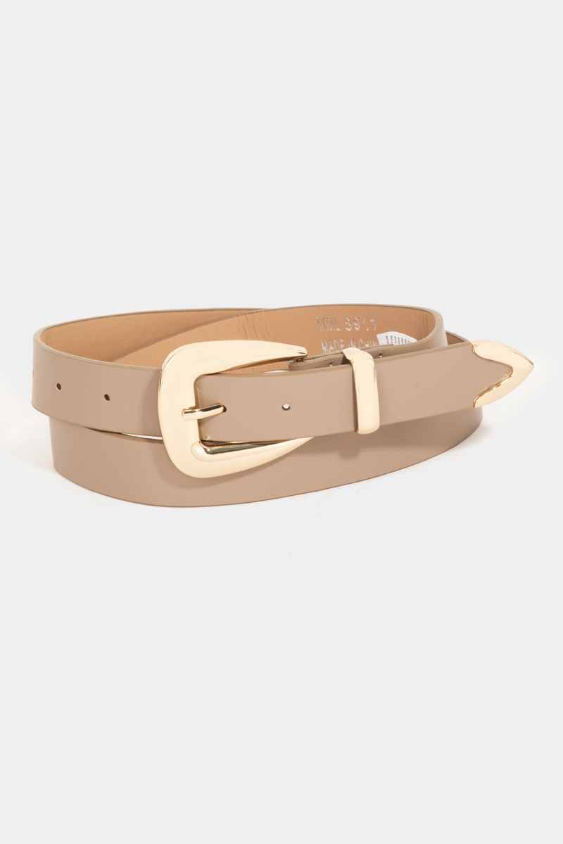| Black faux leather belt featuring a sleek, polished gold. | |||||