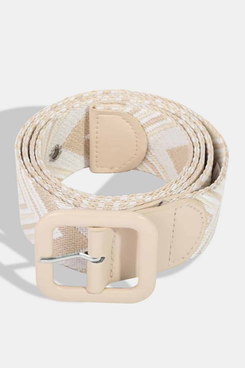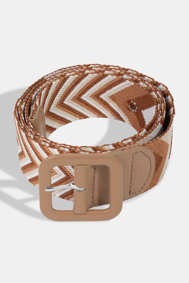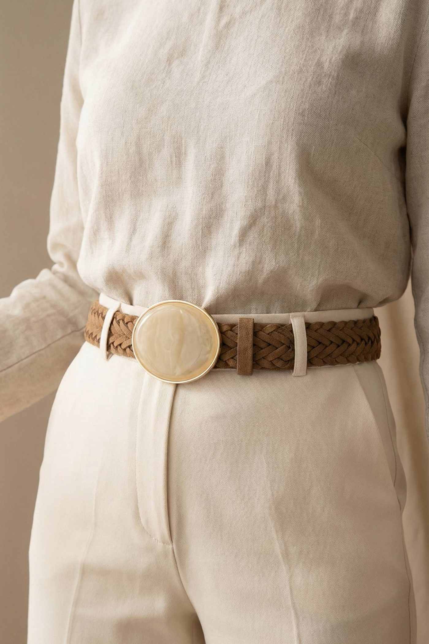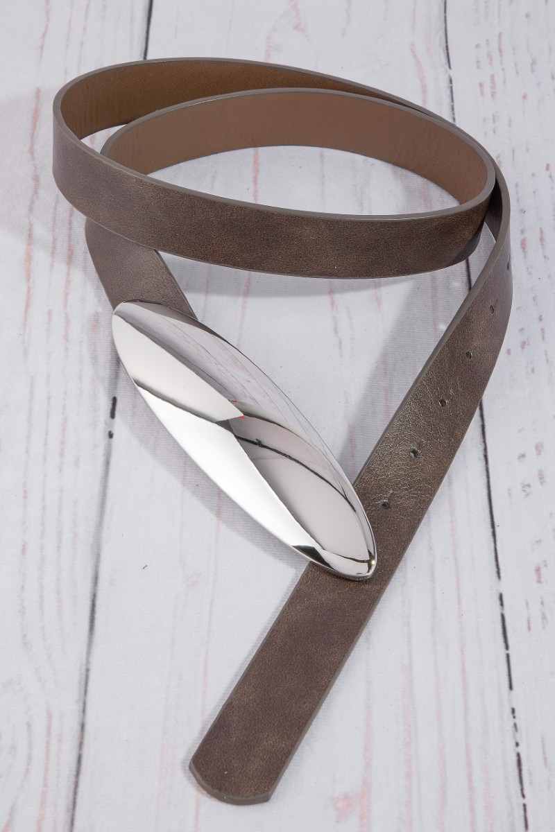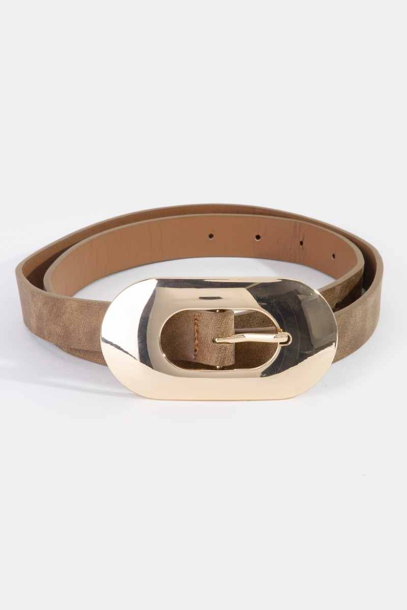 | Textured bronze polyester belt with a large, sleek gold-tone. | |||