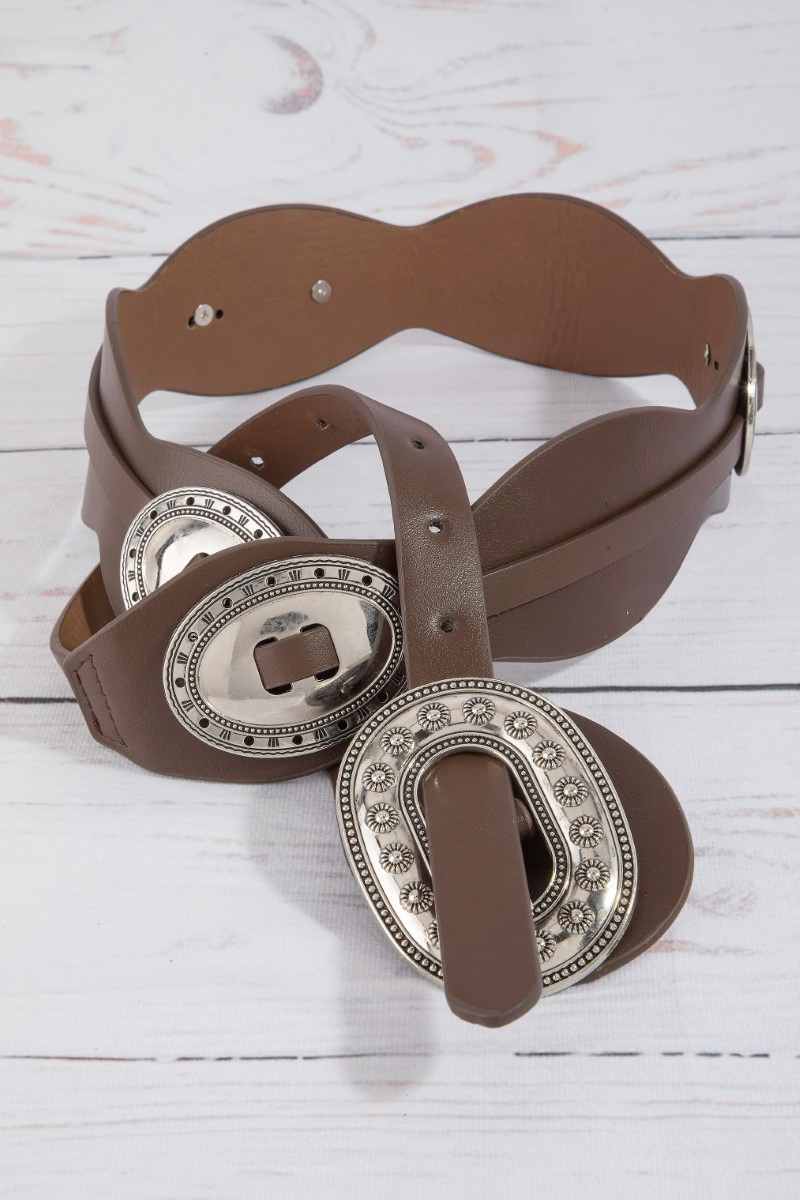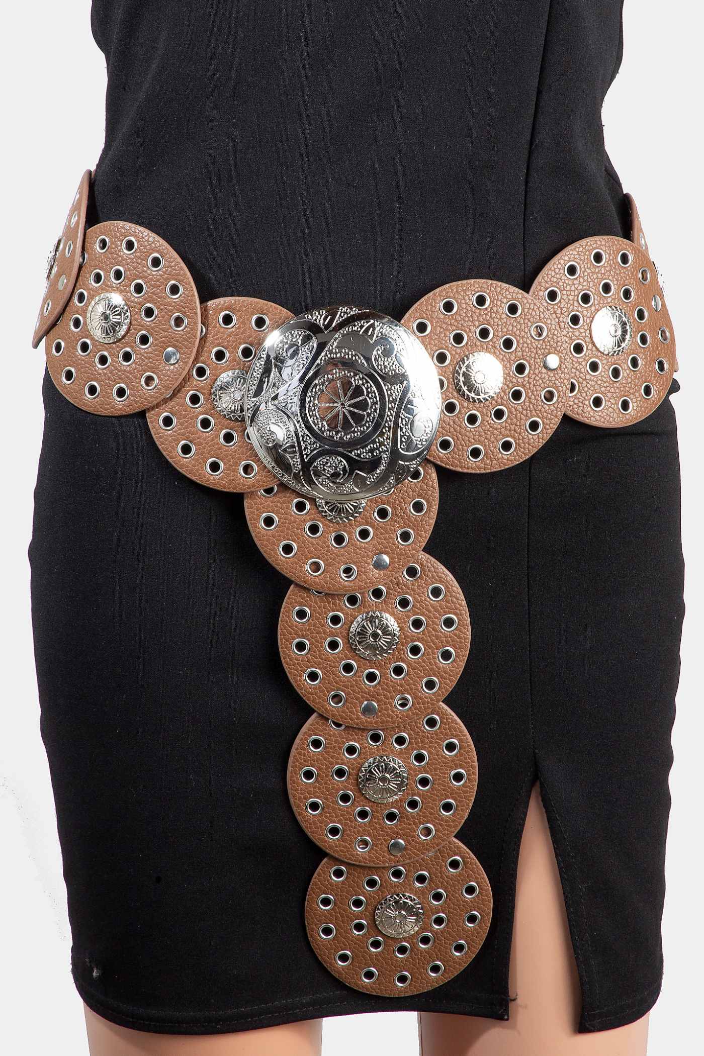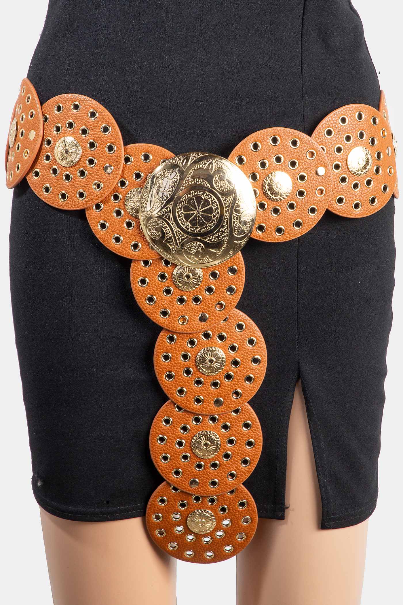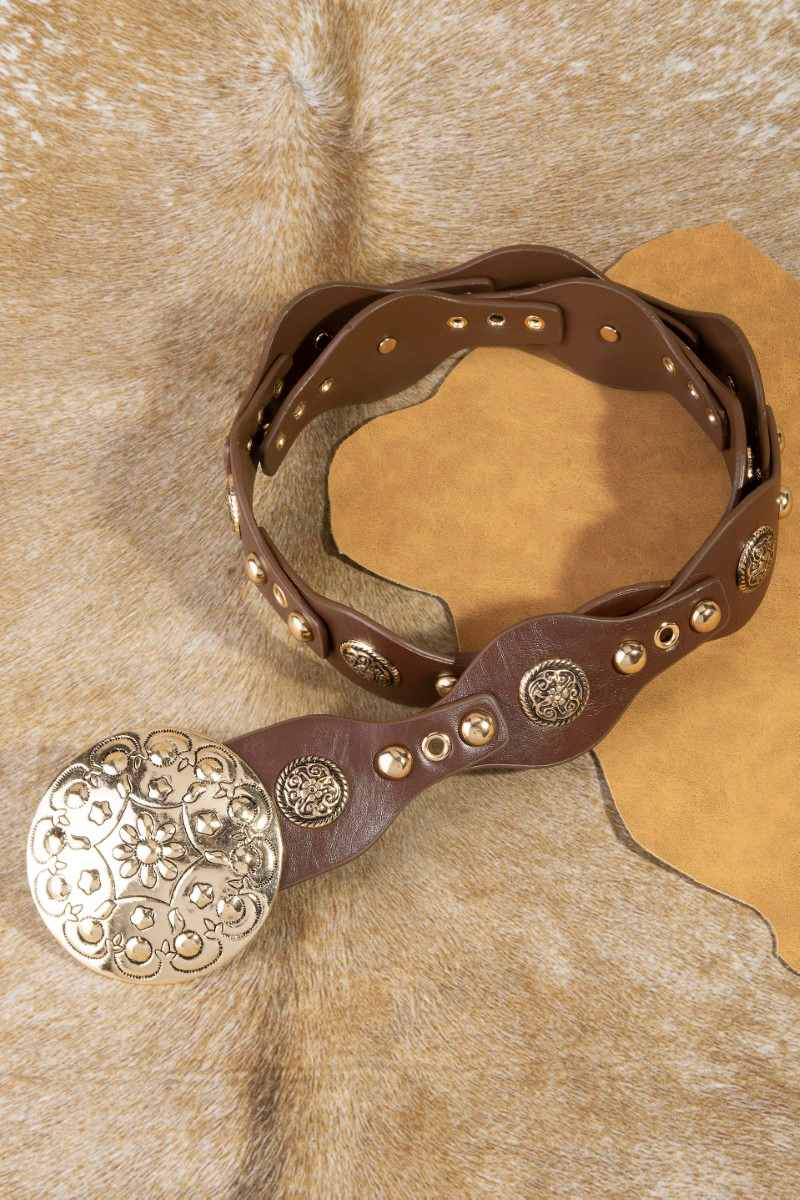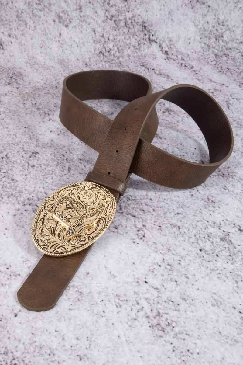 | Brown PU leather belt featuring an oversized gold-tone western medallion. | ||||