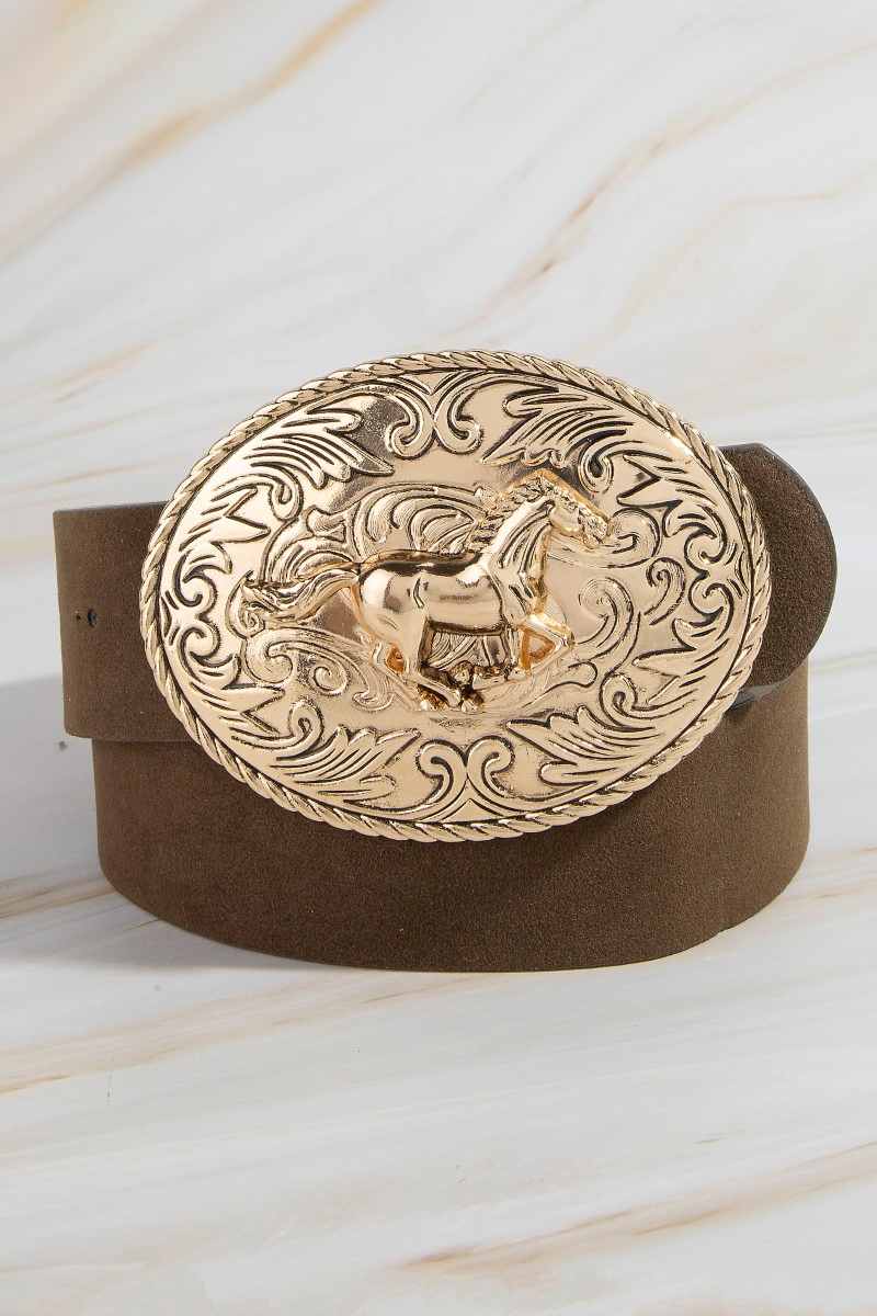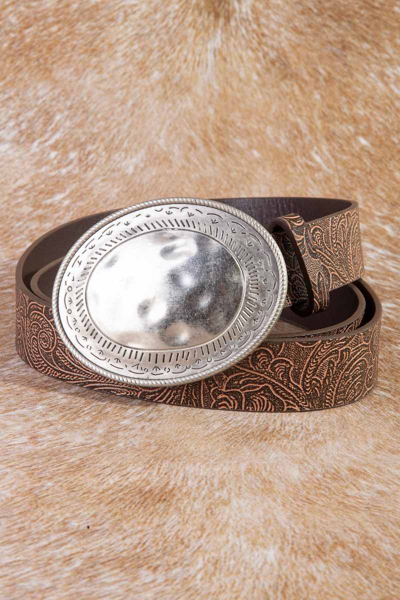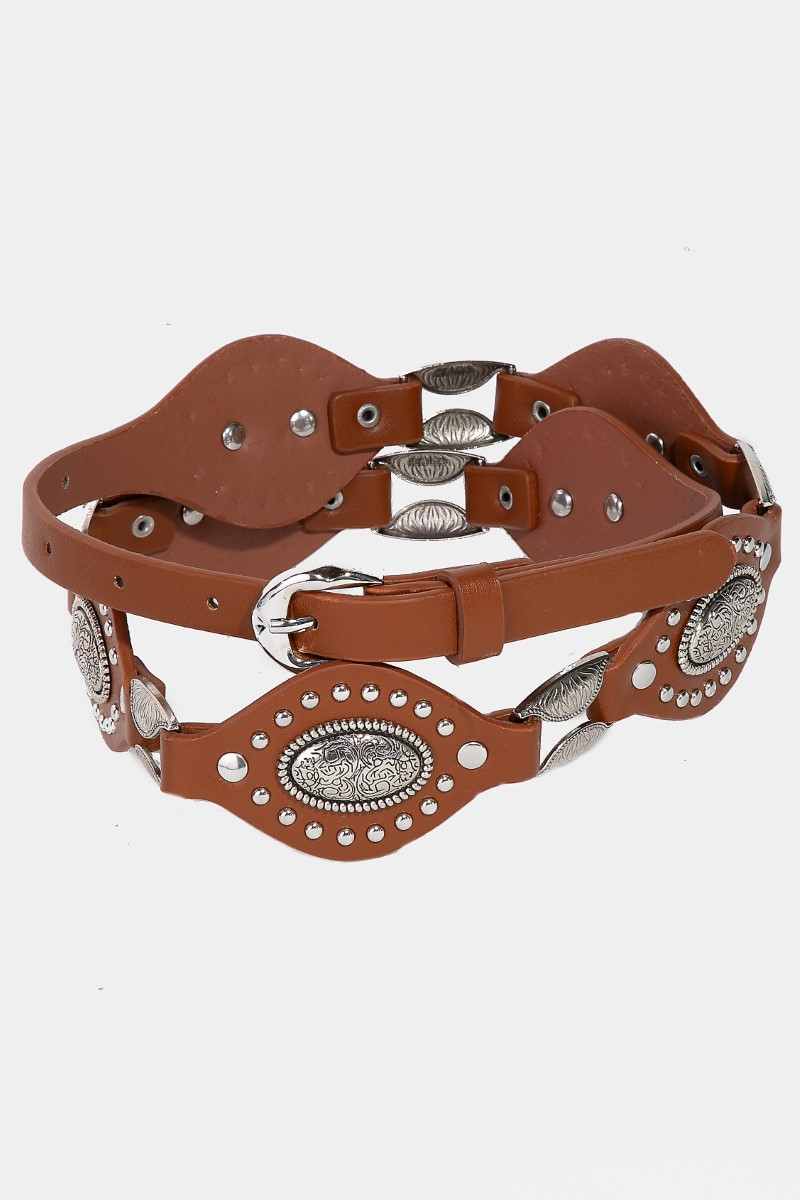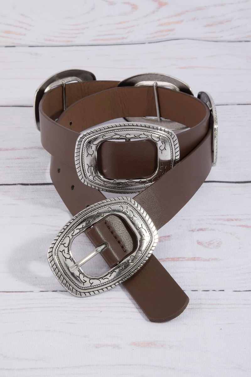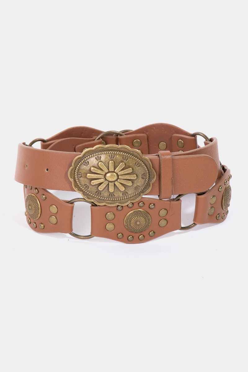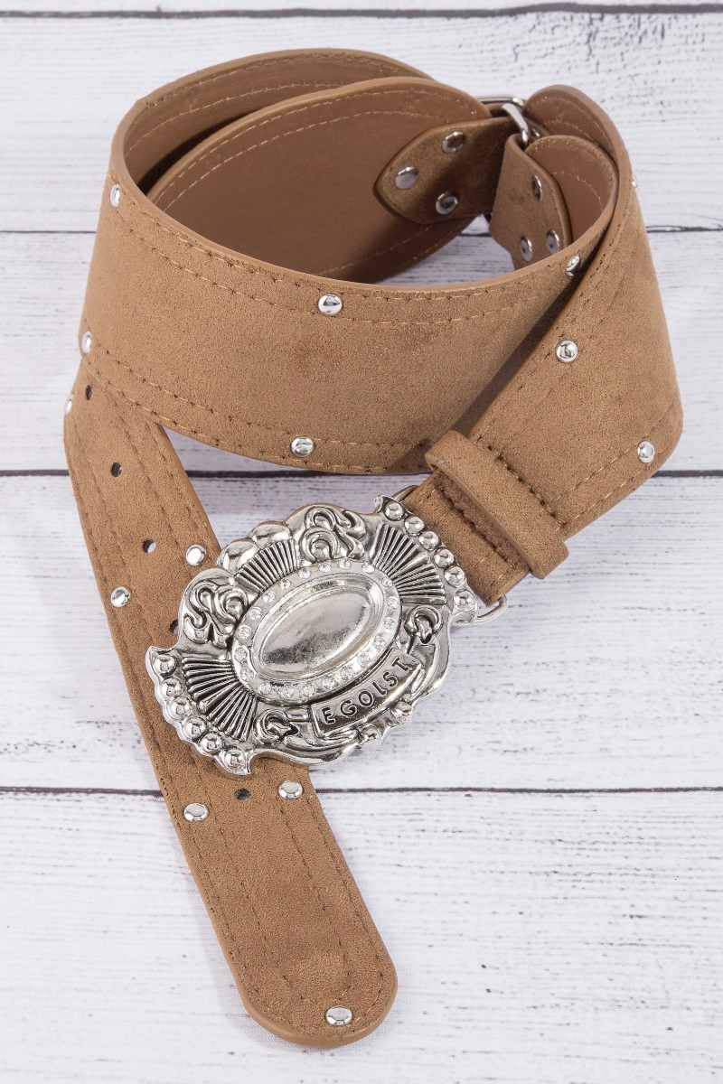 | Brown PU leather belt featuring an oversized gold-tone western medallion. | ||||