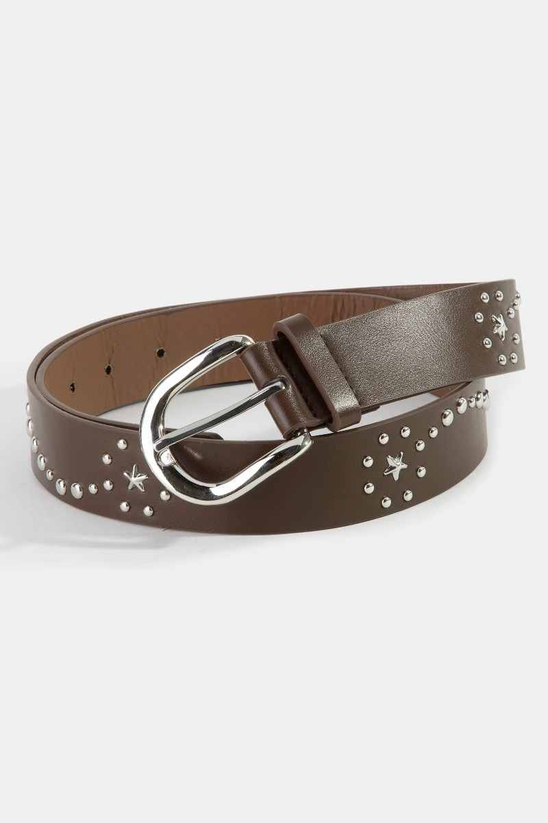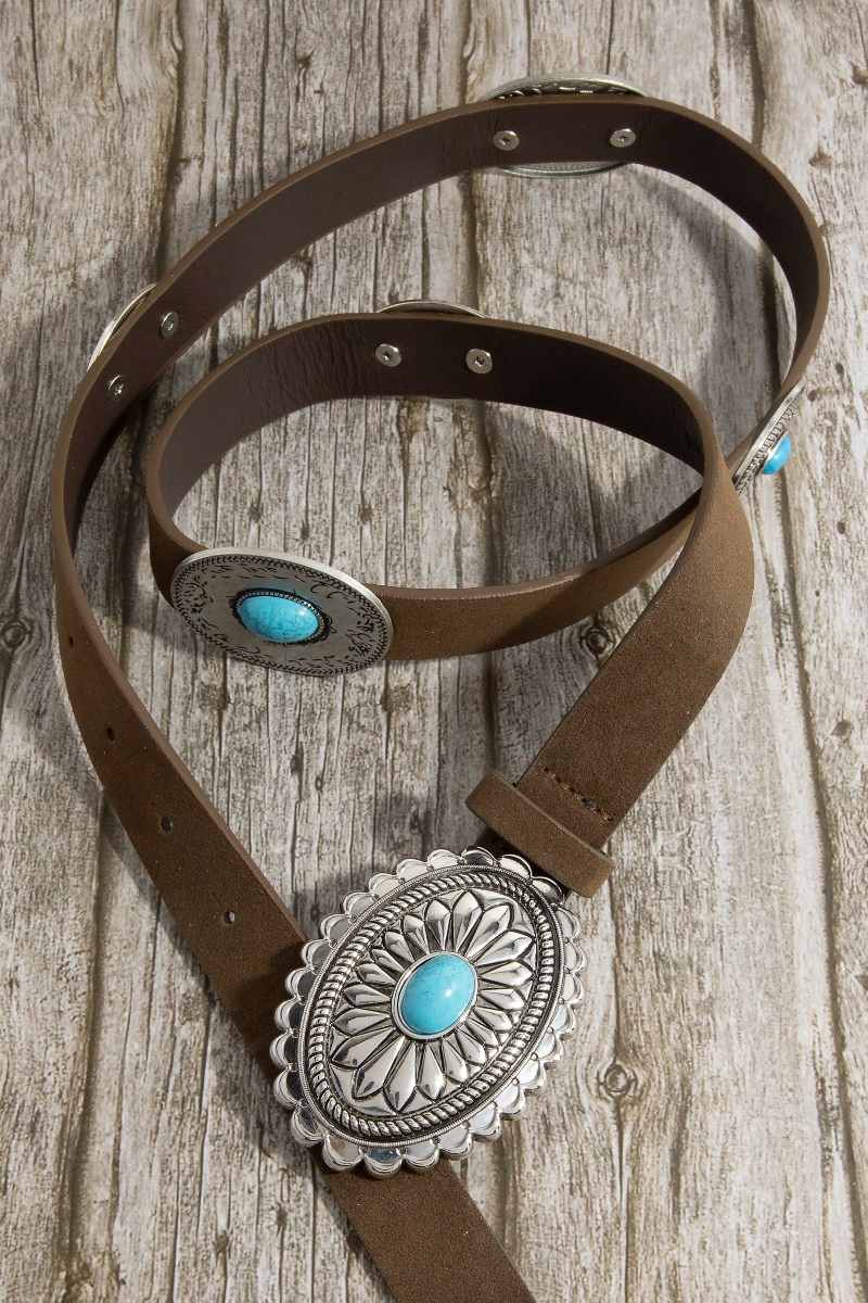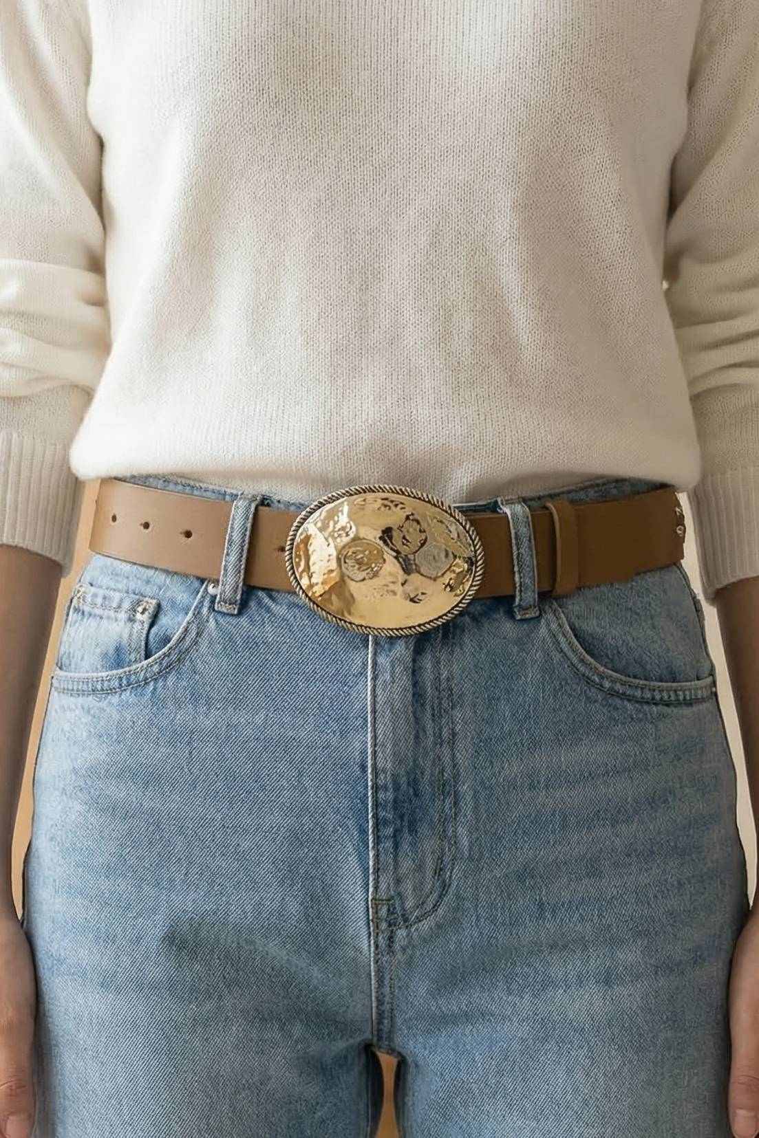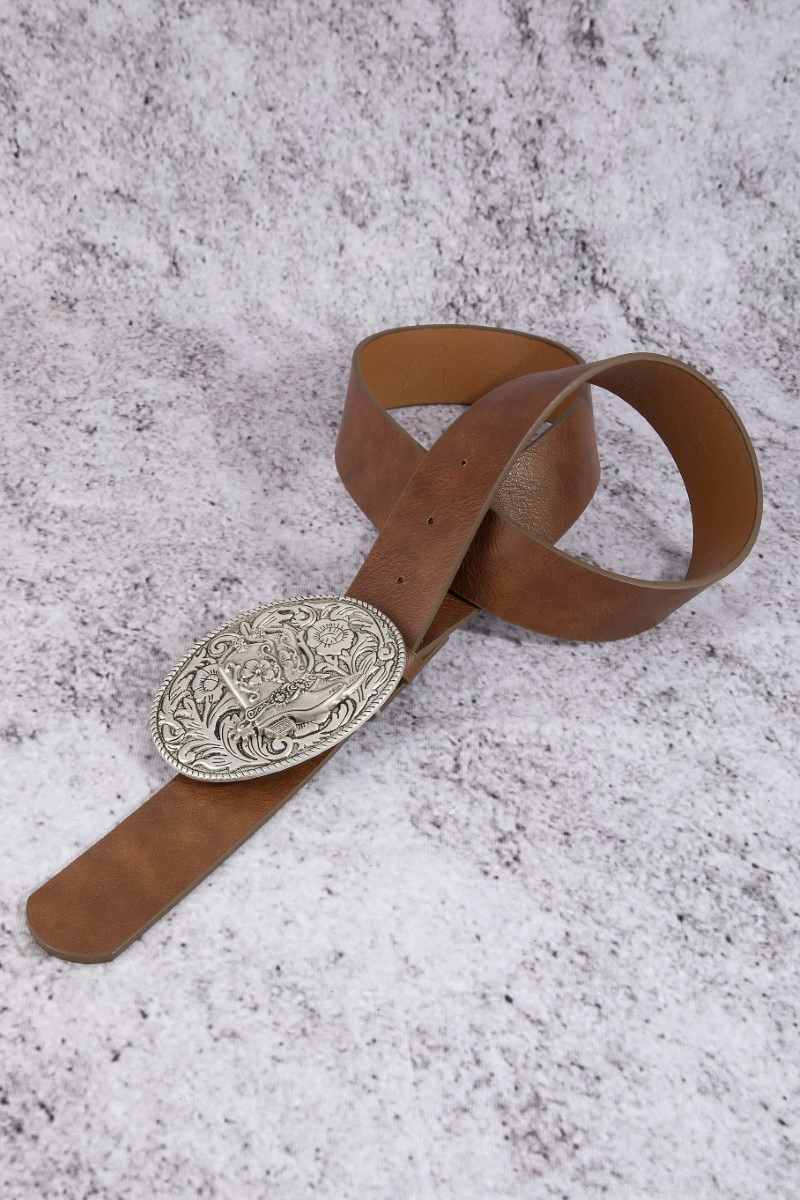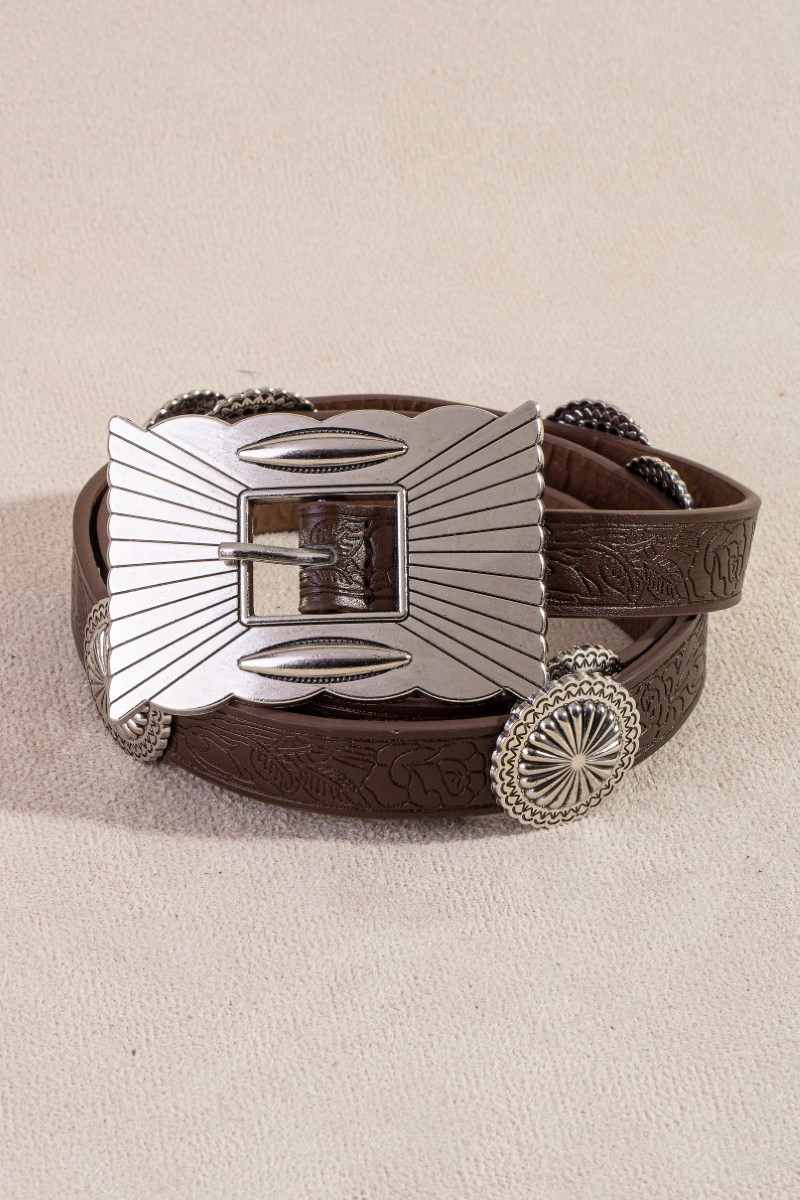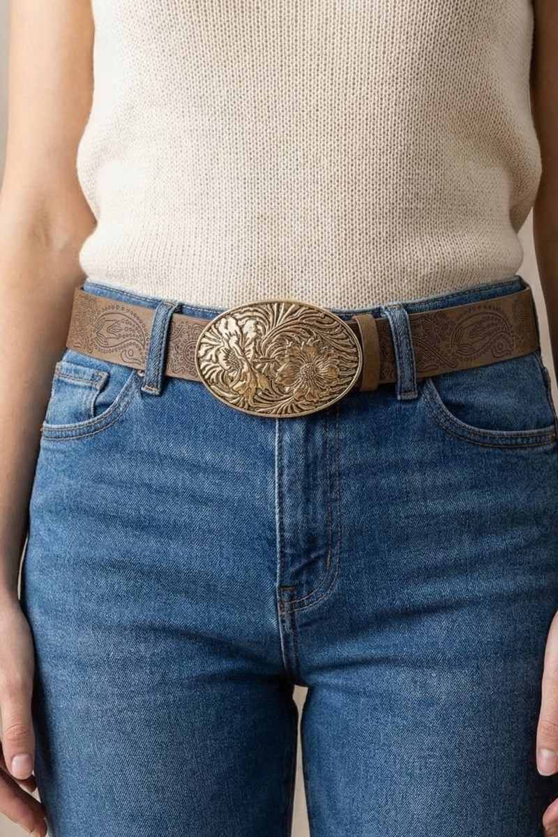 | Brown PU leather belt featuring an oversized gold-tone western medallion. | ||||
