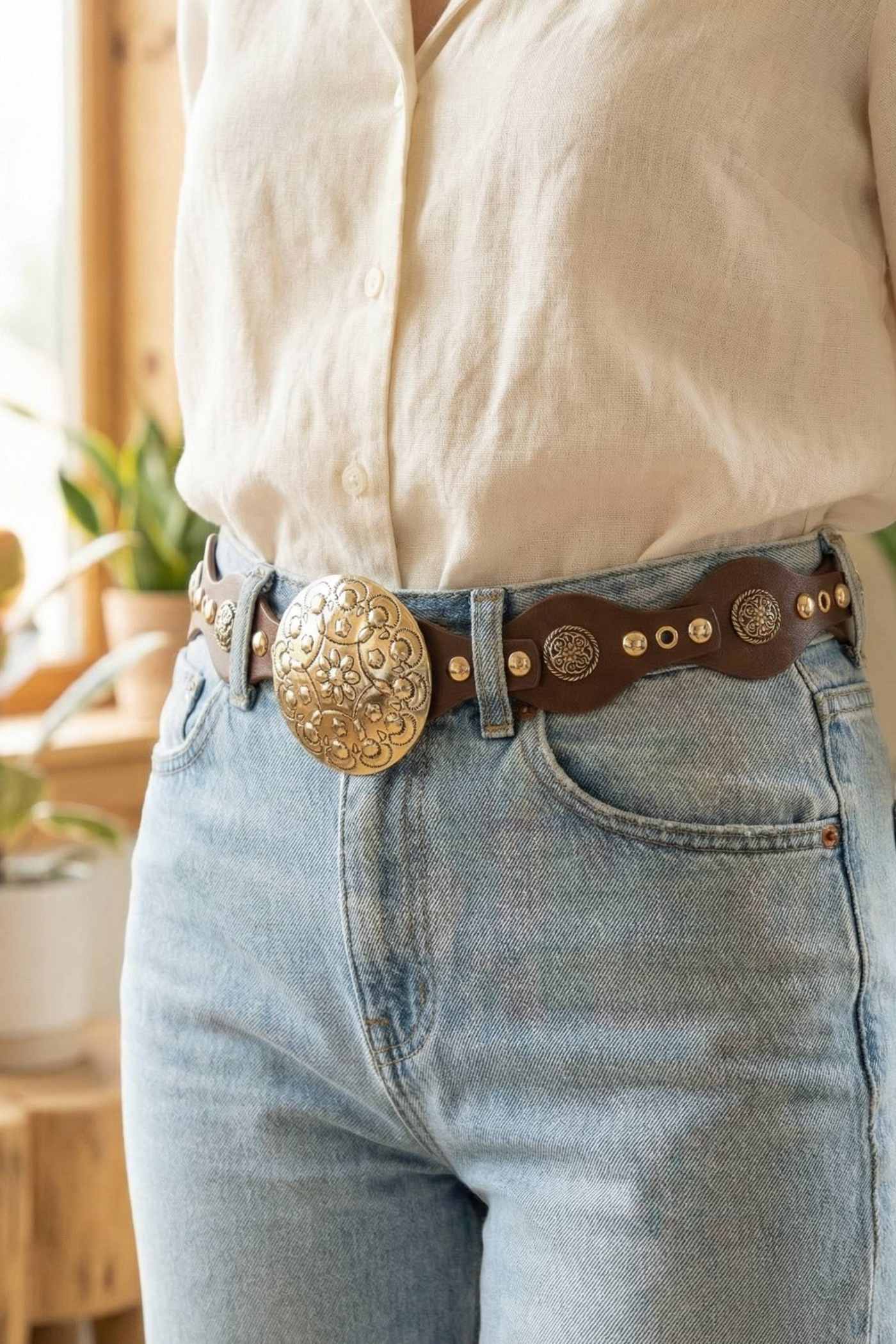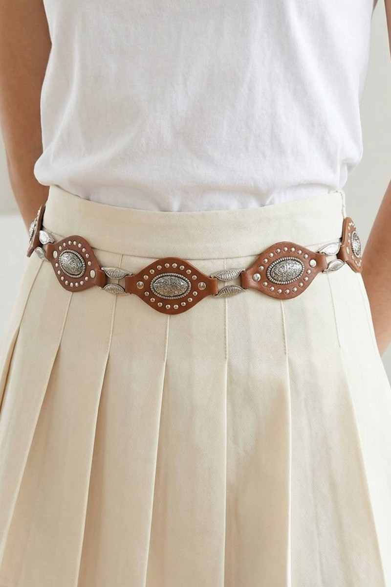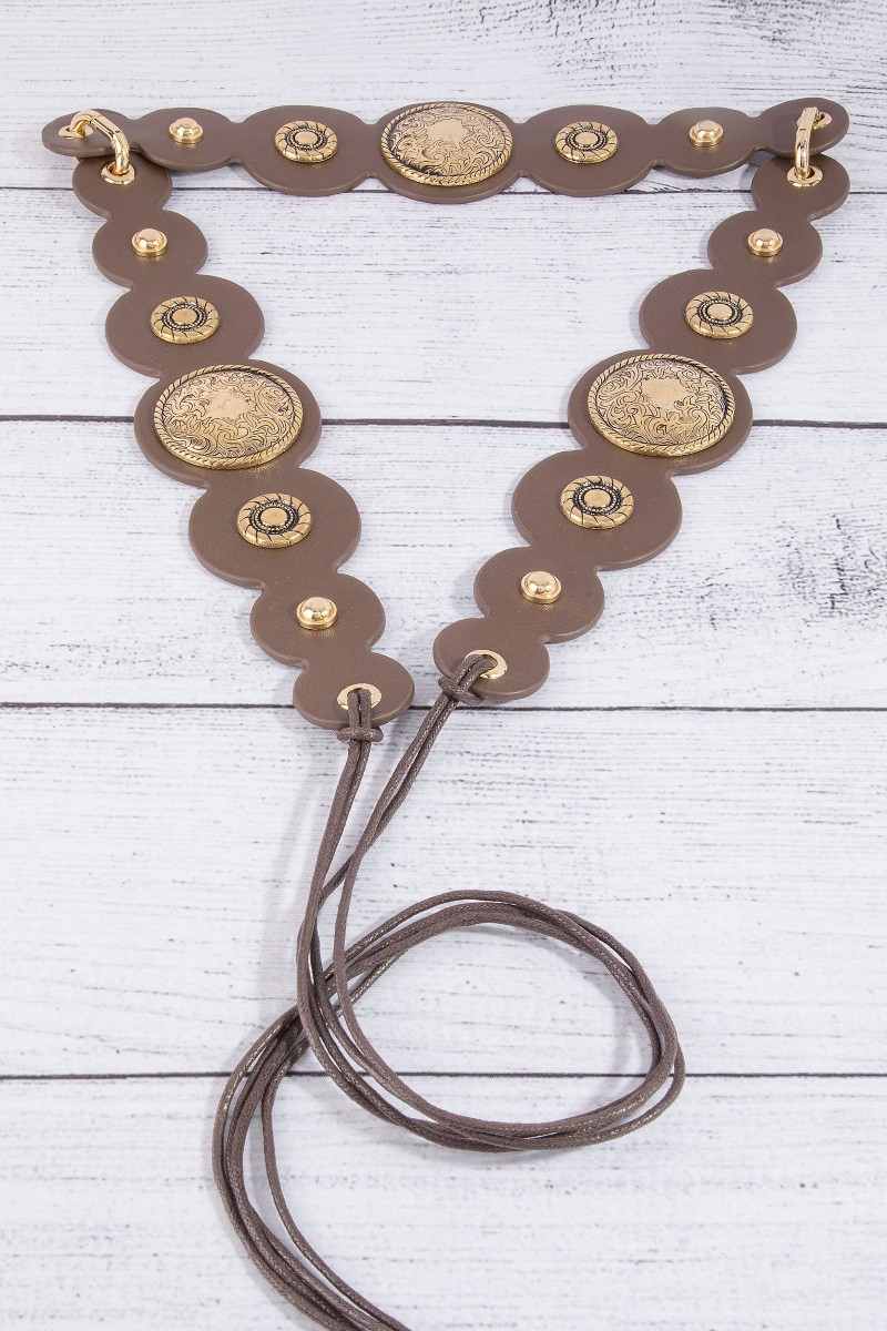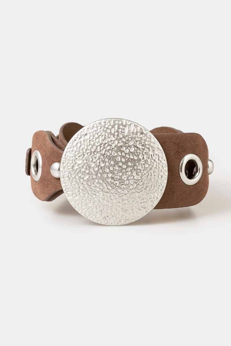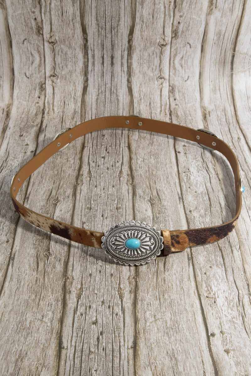 | Brown PU leather belt featuring an oversized gold-tone western medallion. | ||||