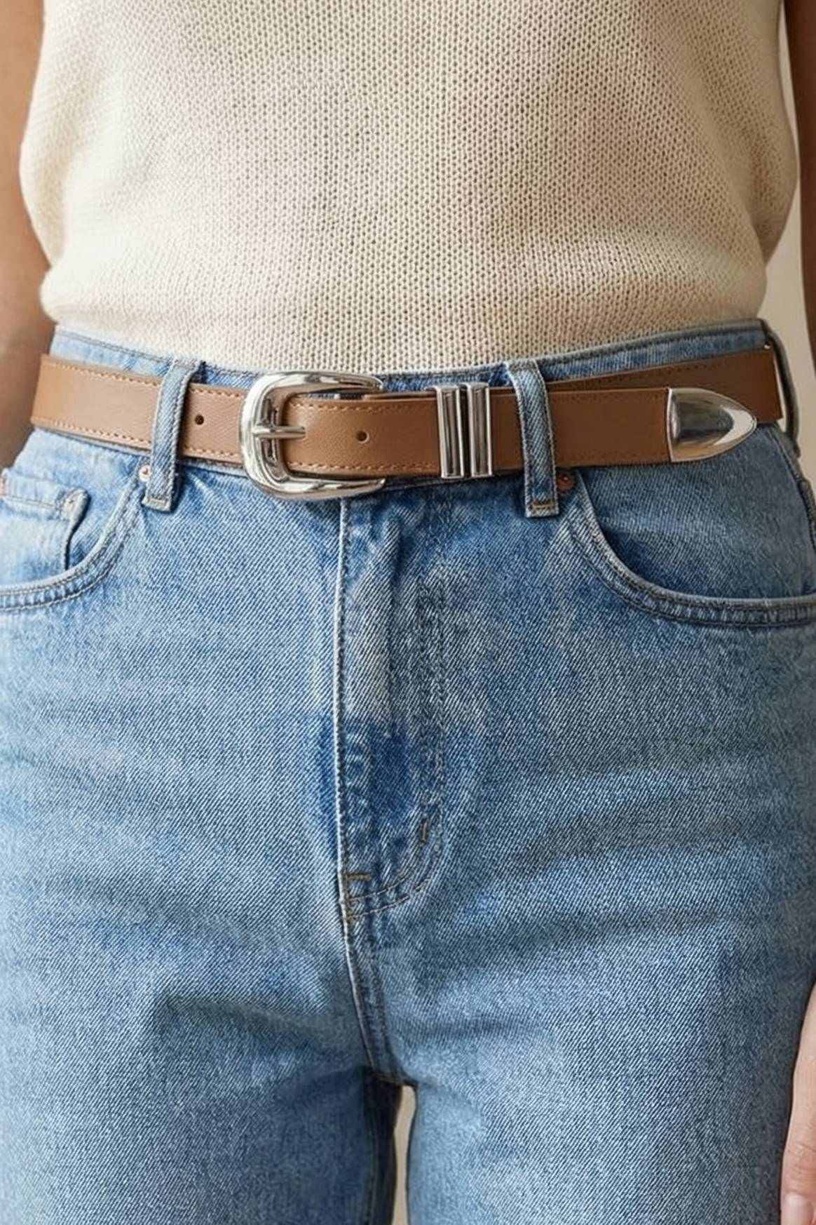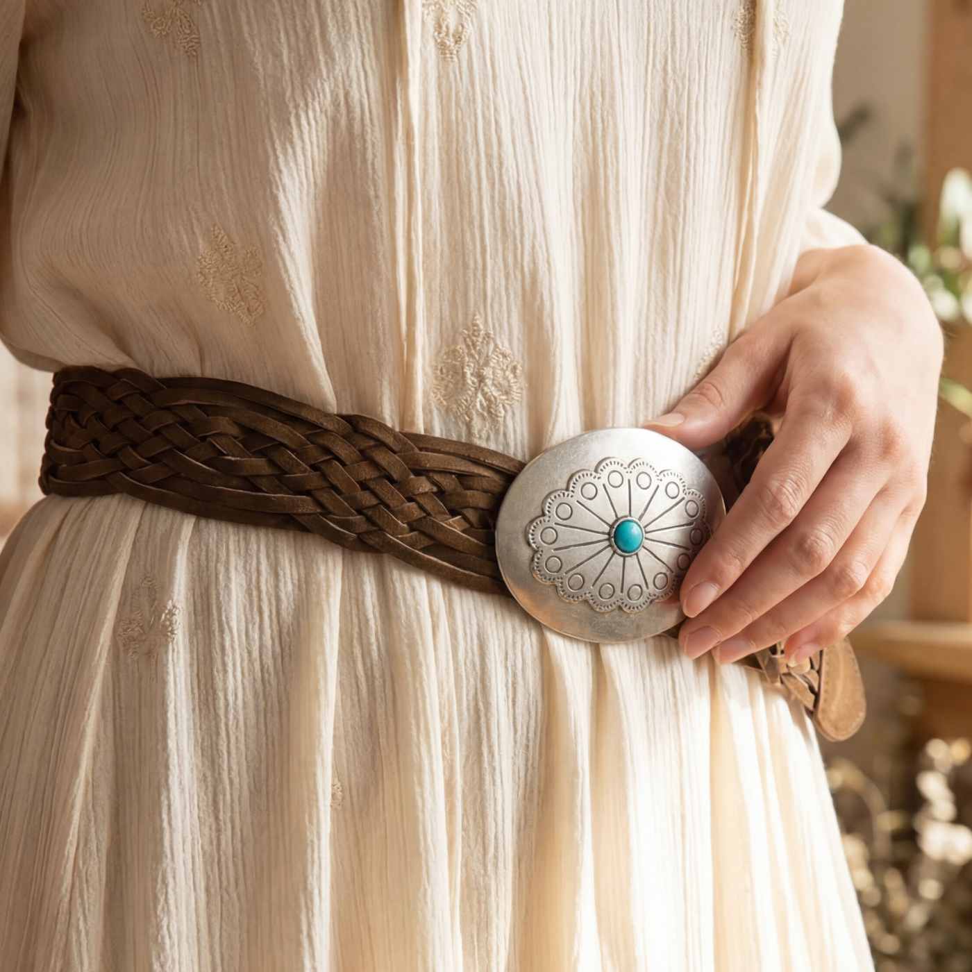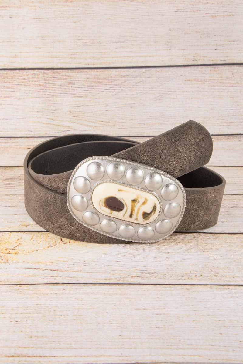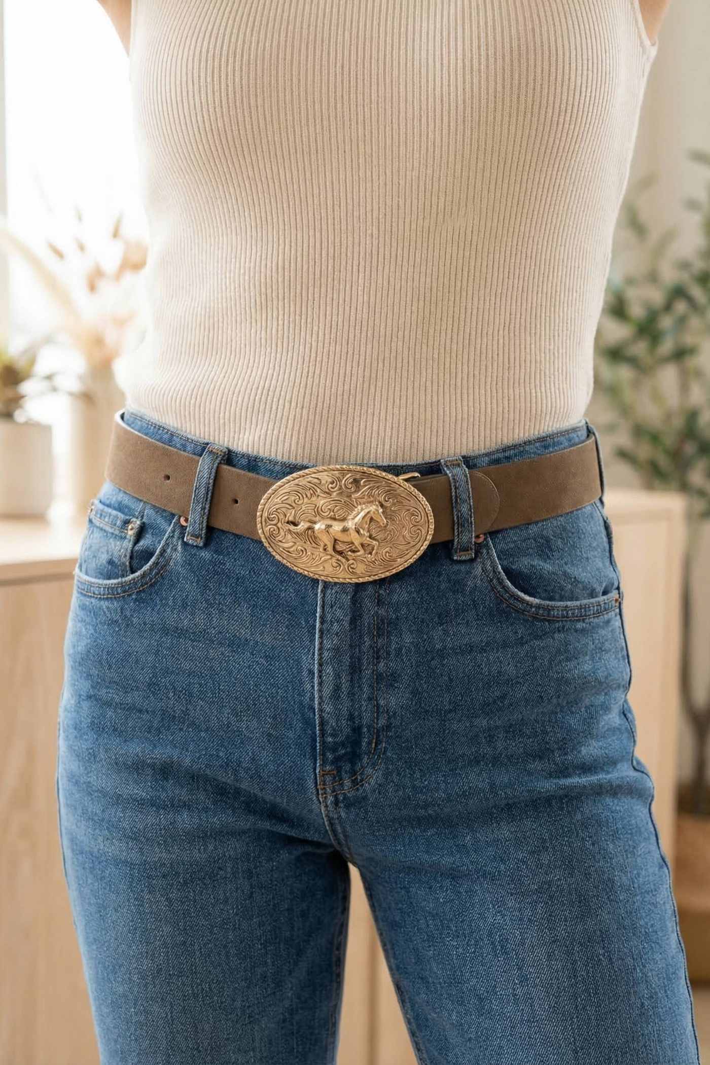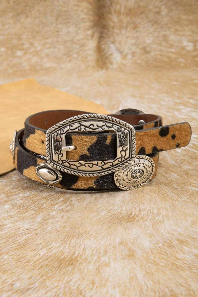 | Brown PU leather belt featuring an oversized gold-tone western medallion. | ||||