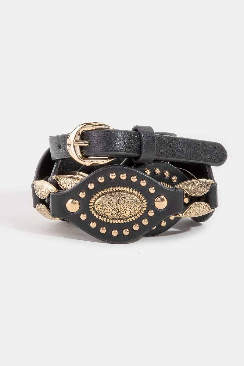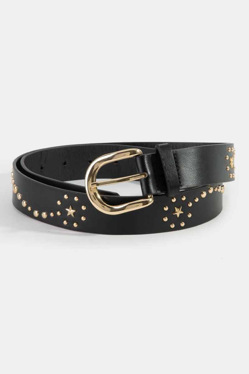| Black PU leather belt with gold-tone buckle, studded. | ||||
