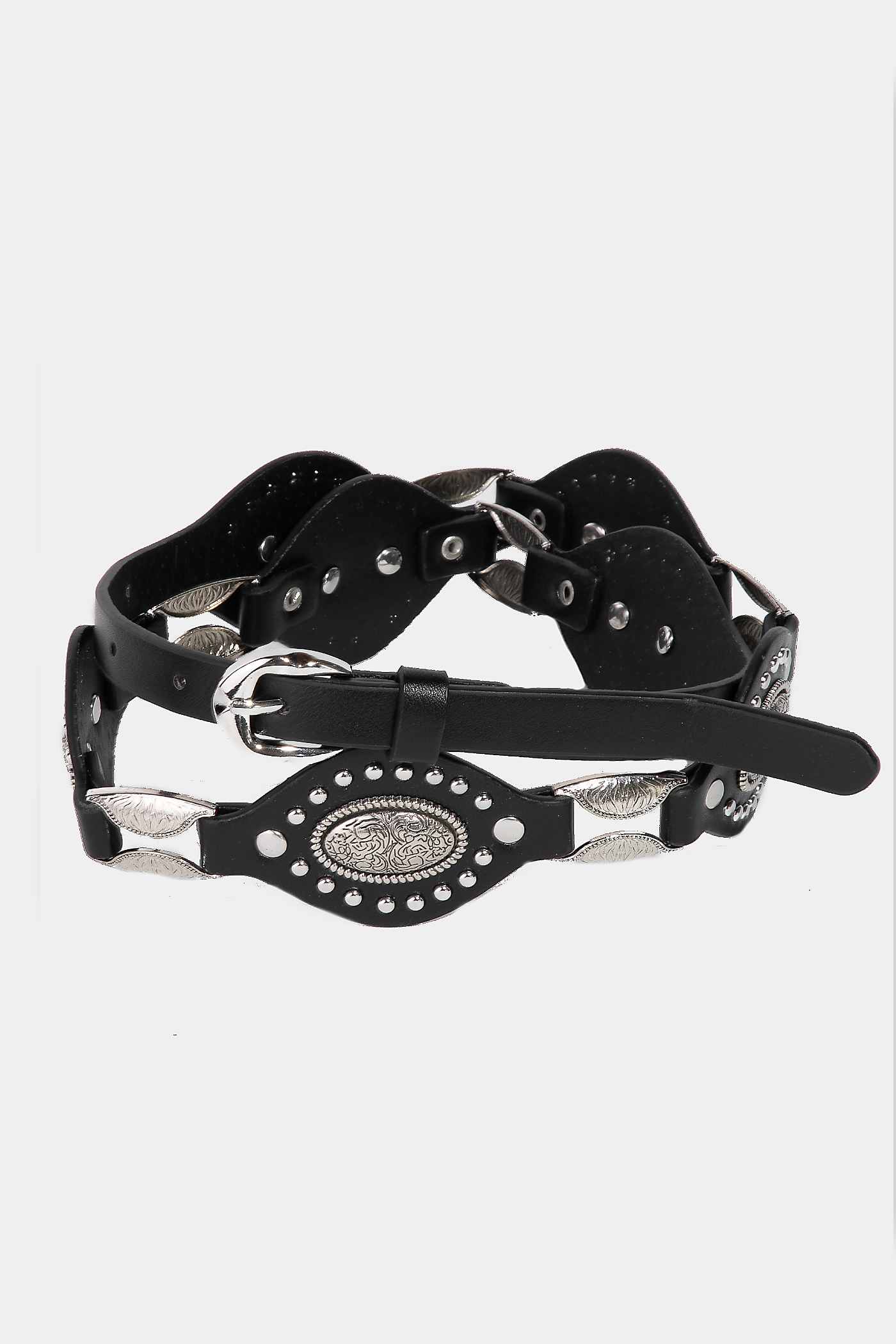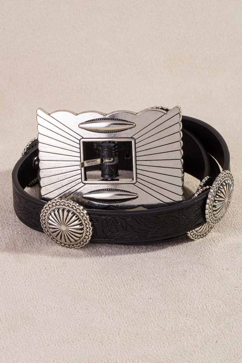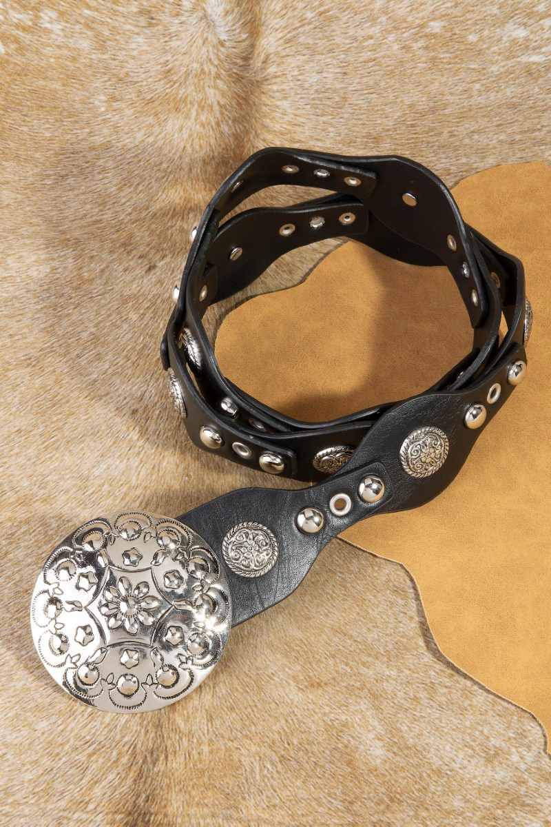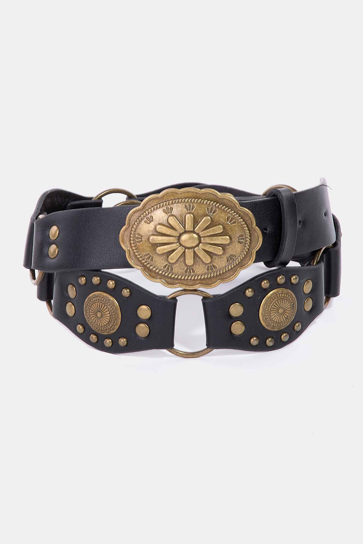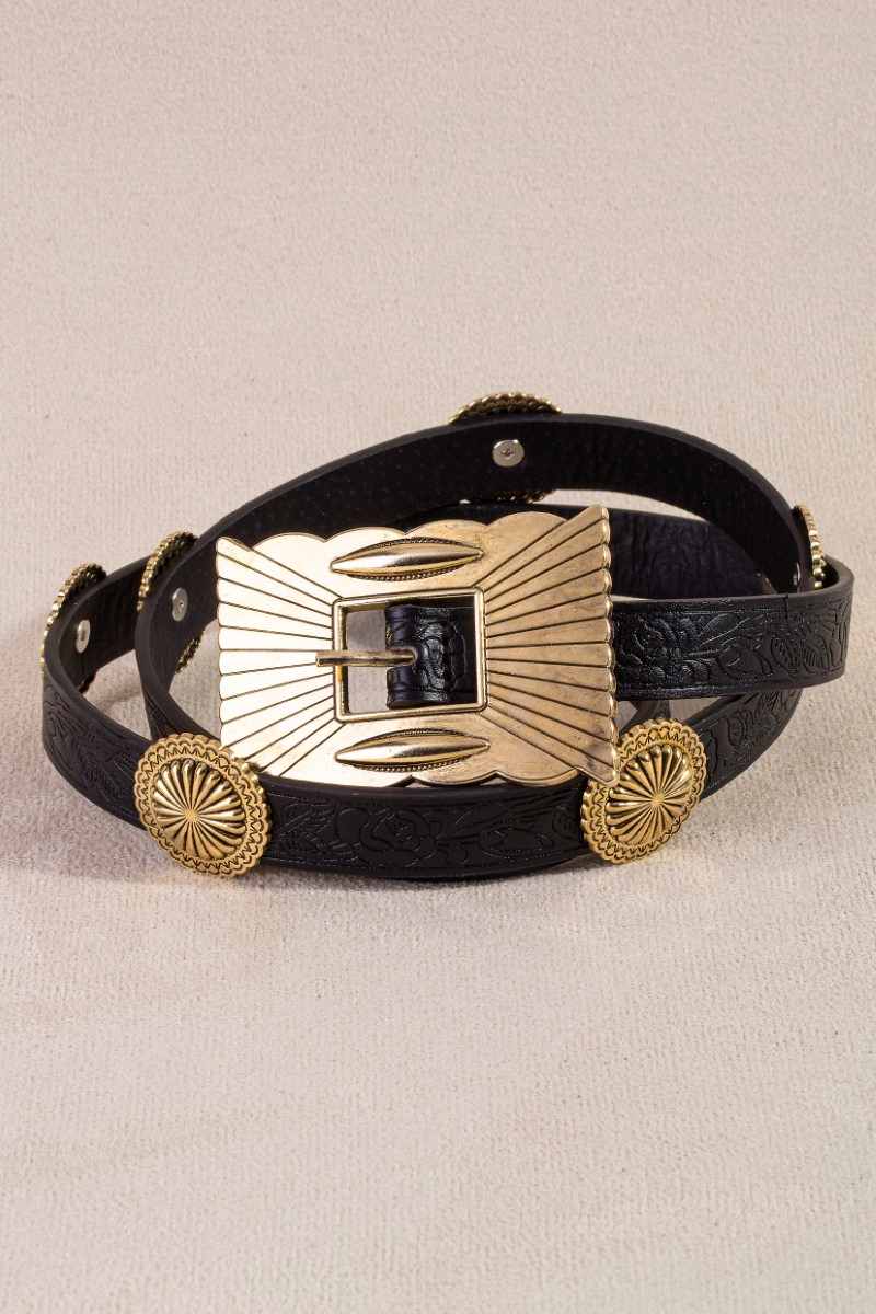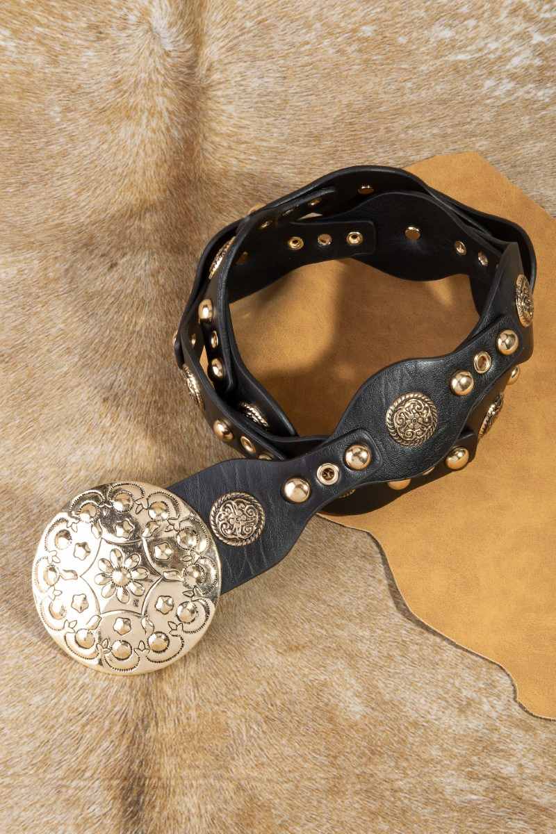 | Black faux leather Western concho belt with ornate gold-tone. | ||||