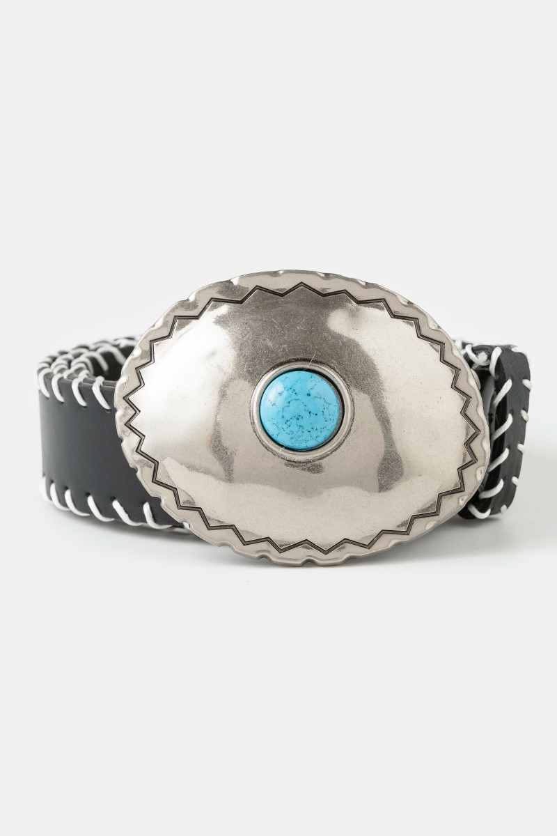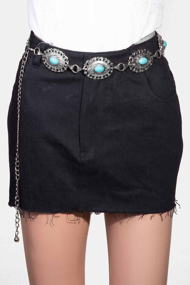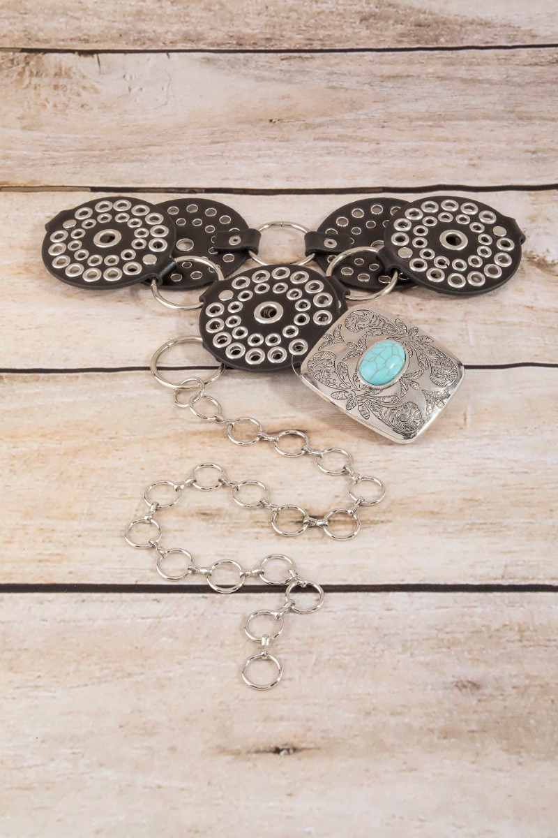 | Black studded oval belt with silver chain and turquoise stone buckle. | |||