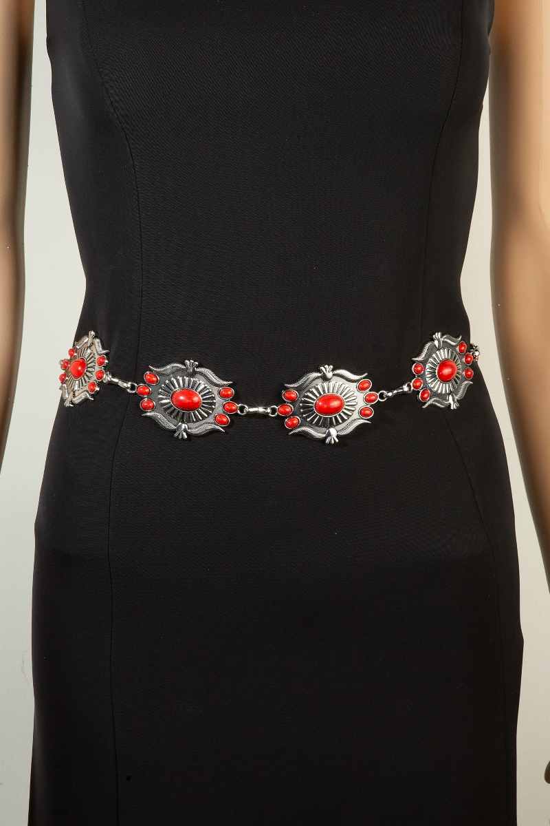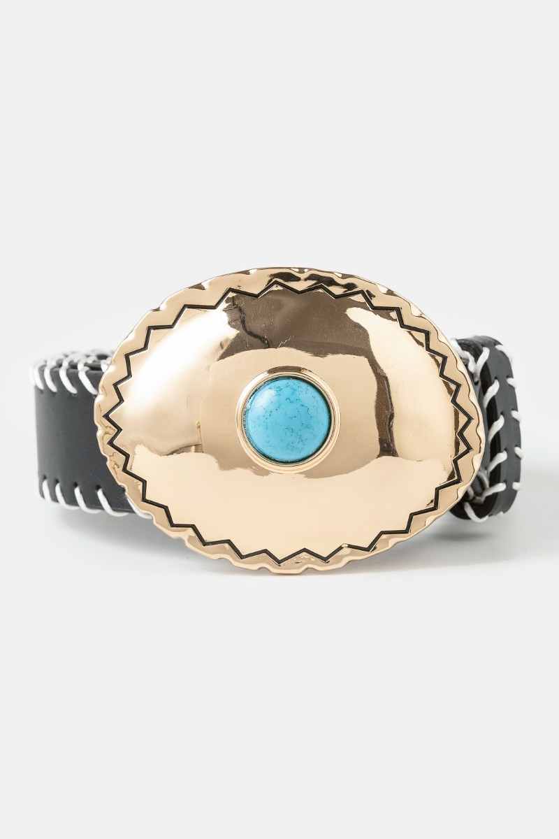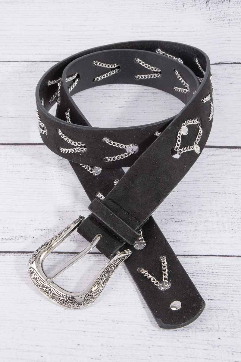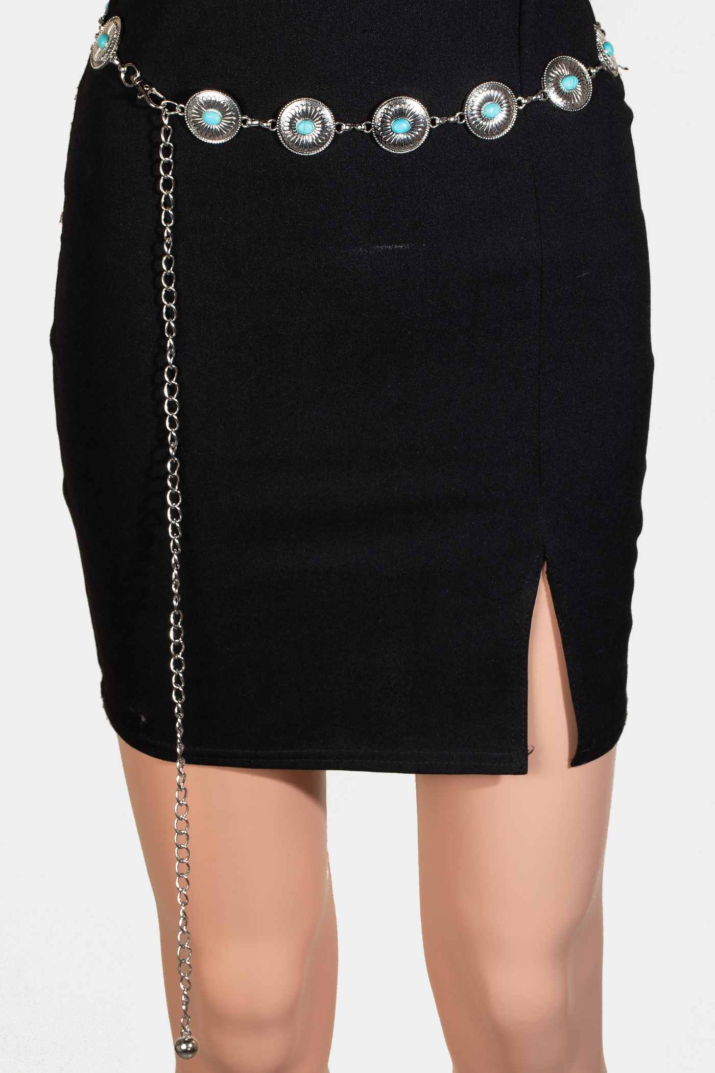 | Black studded oval belt with silver chain and turquoise stone buckle. | |||