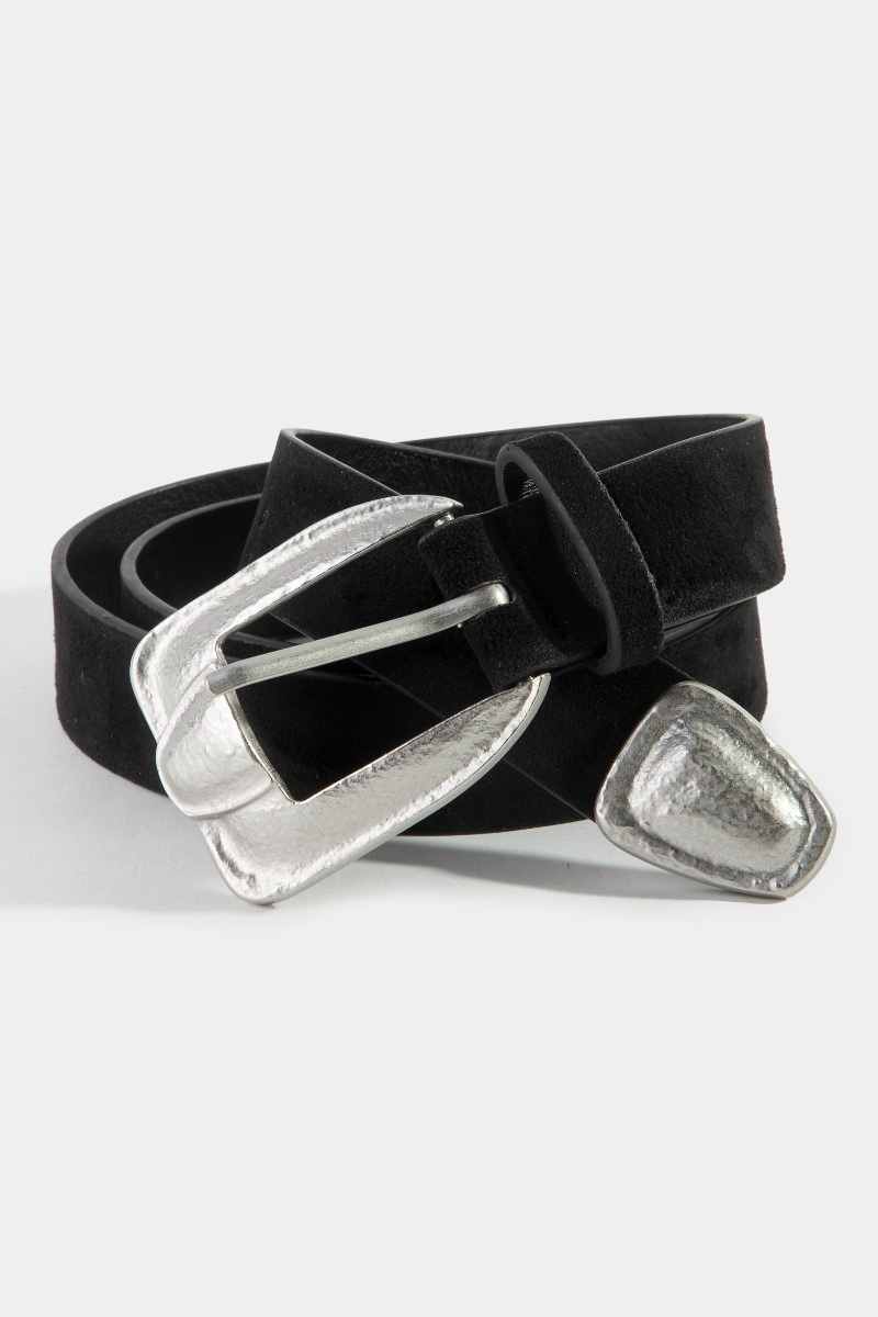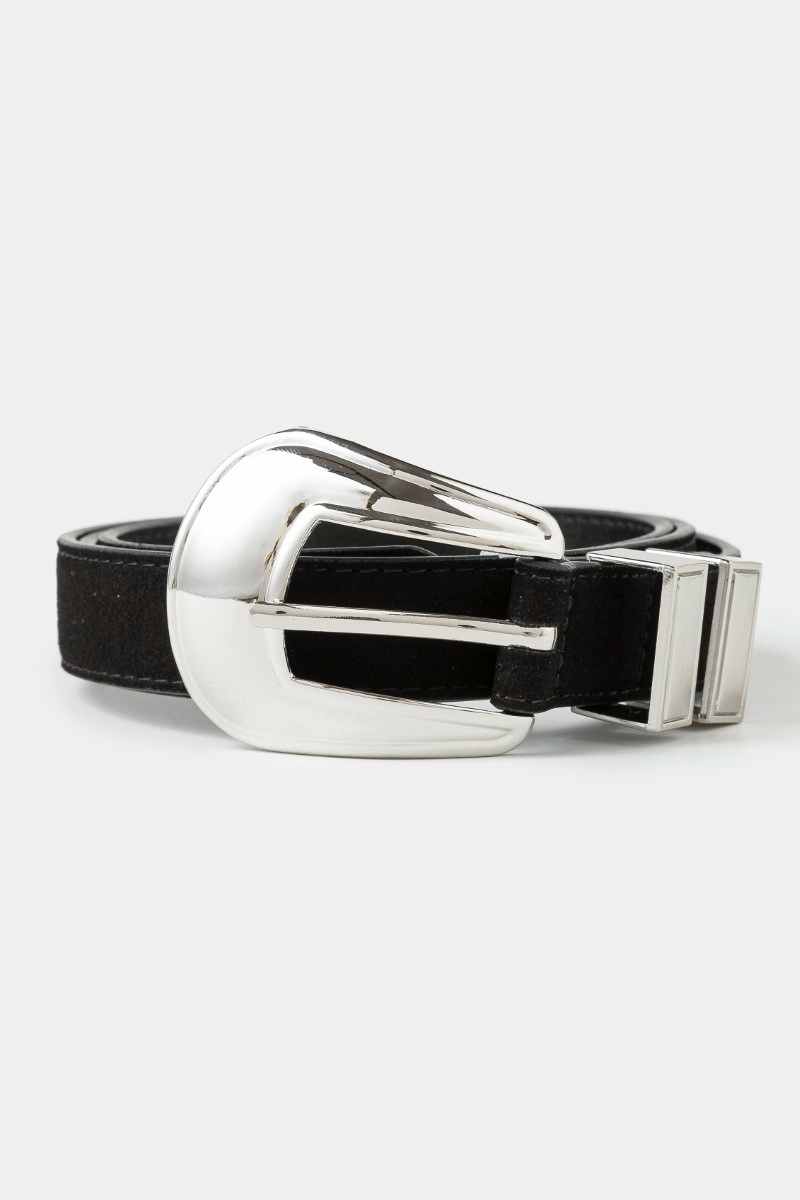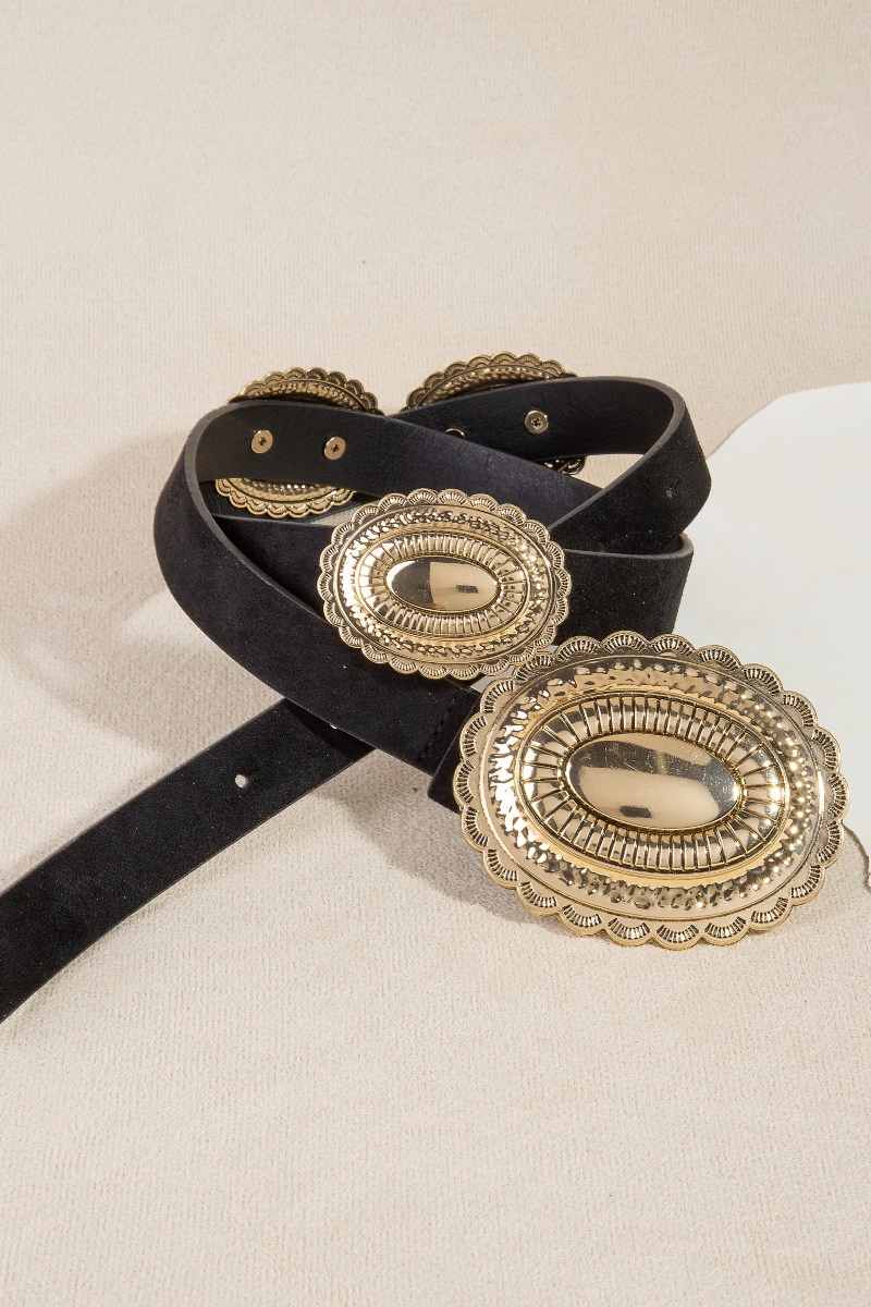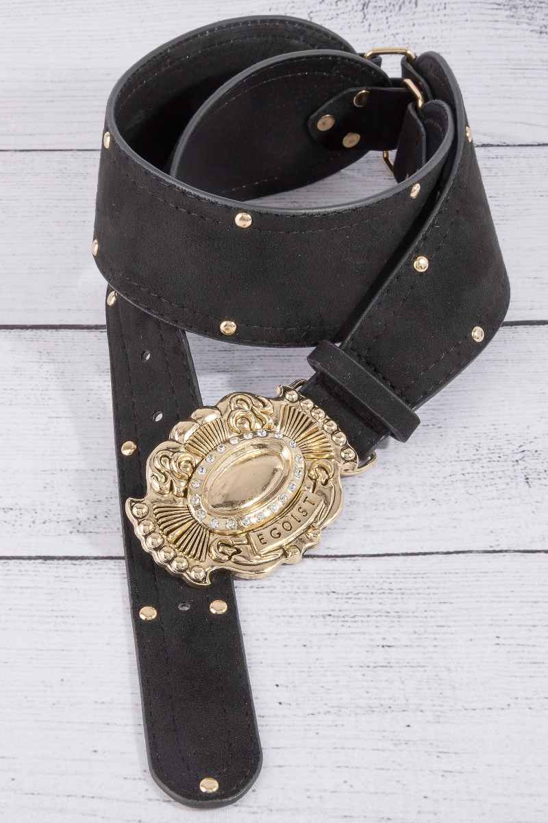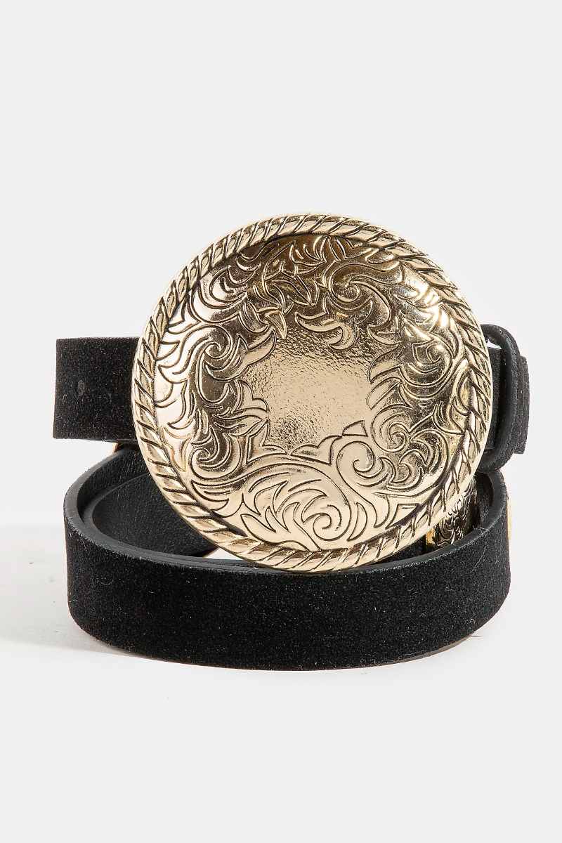| Black faux suede belt featuring an ornate gold-tone oval buckle. | |||||