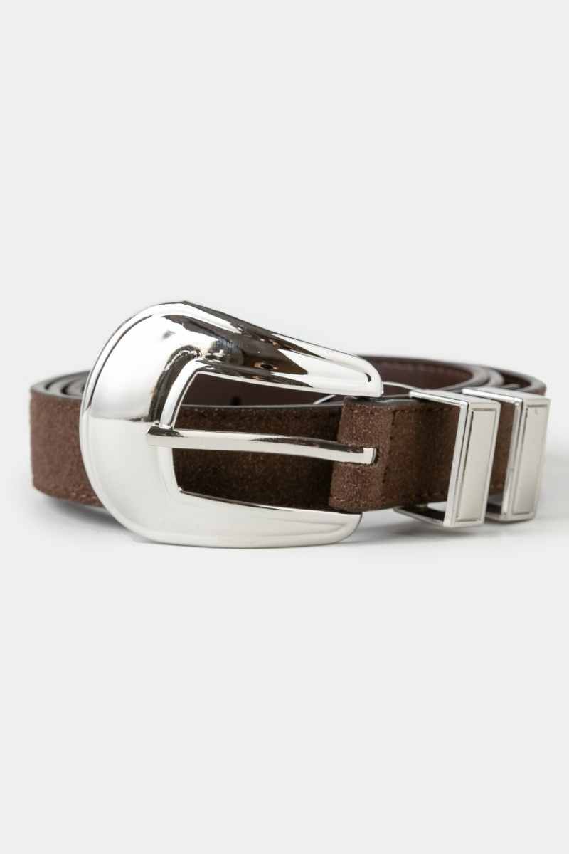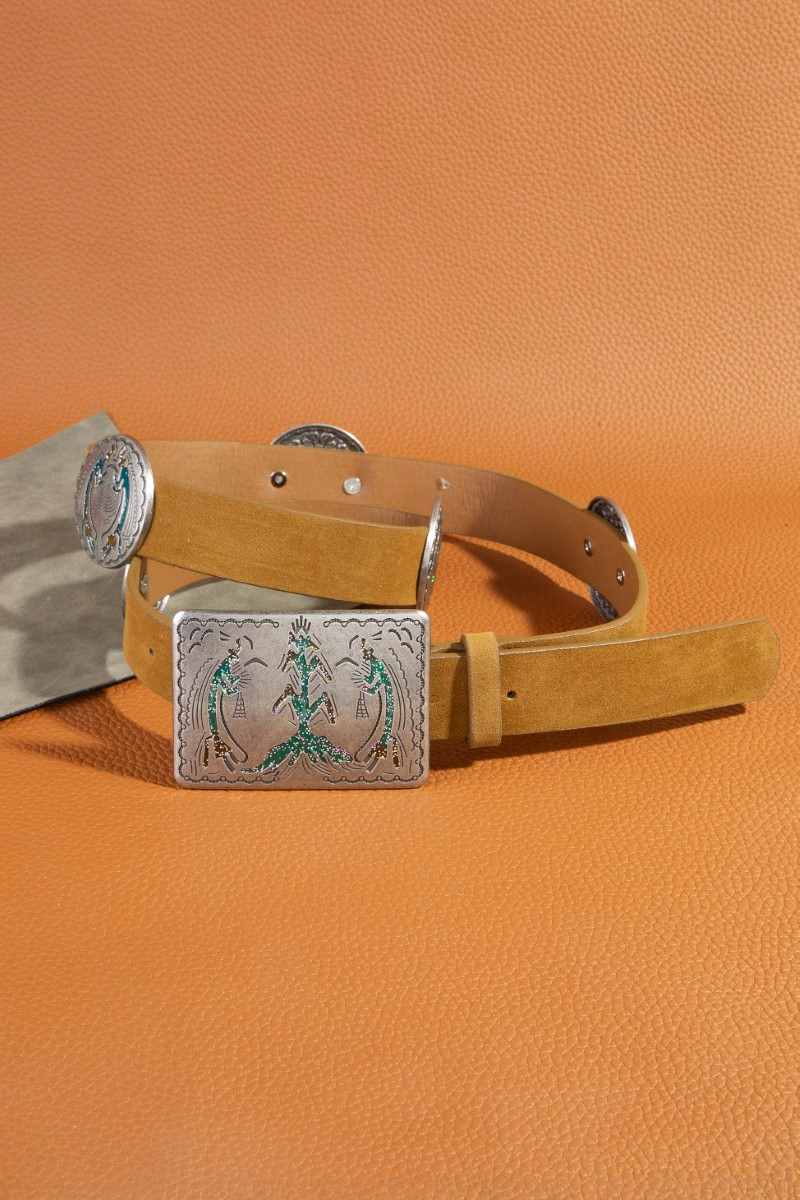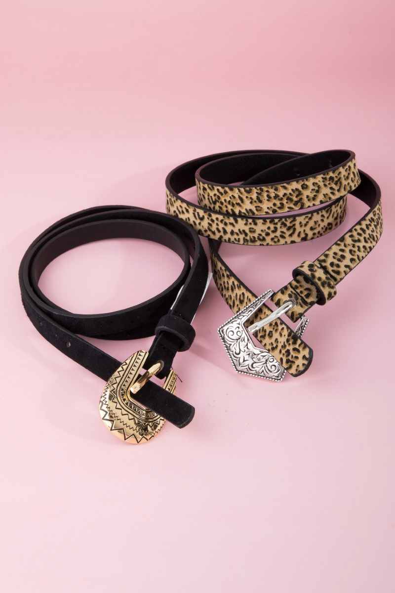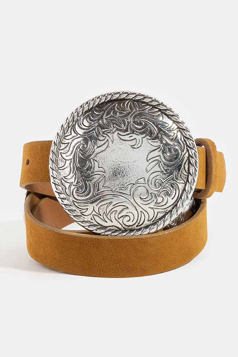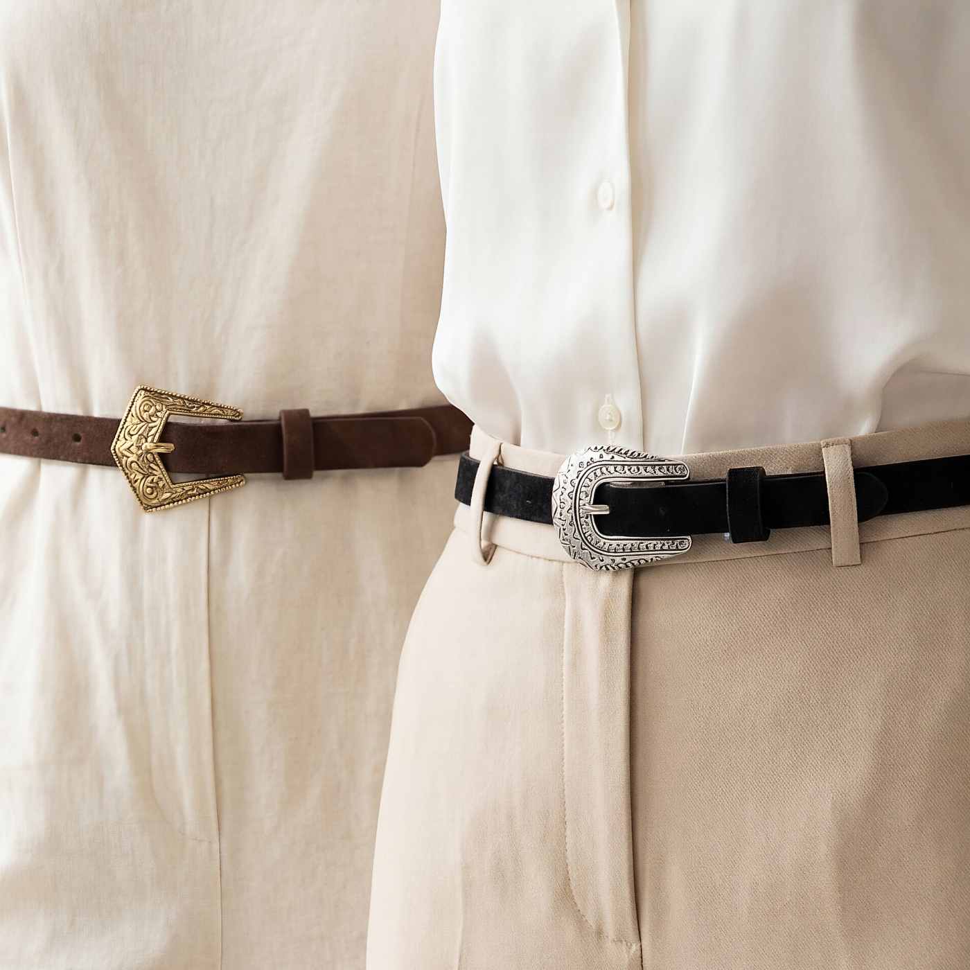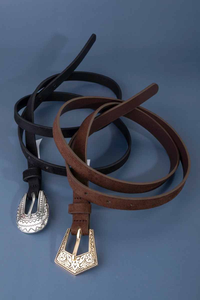 | Slim faux suede belts with ornate western-style alloy buckles. | |||