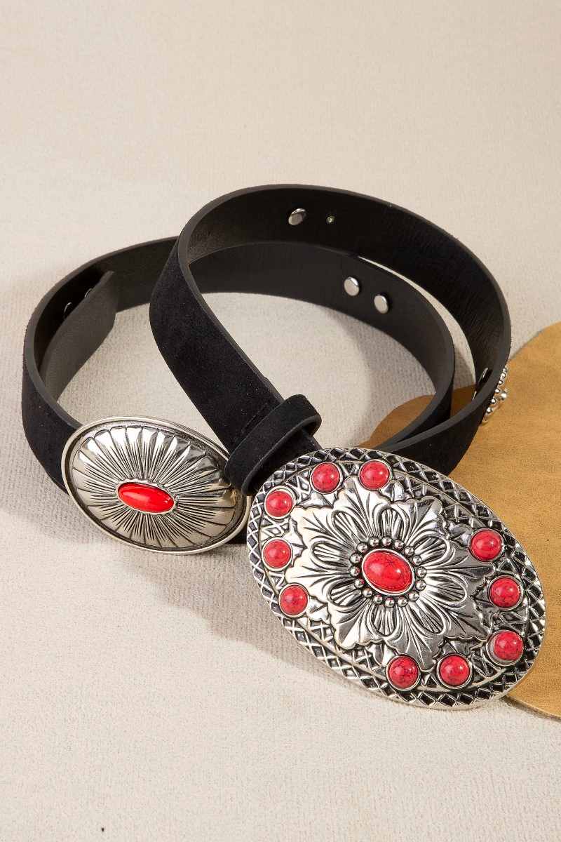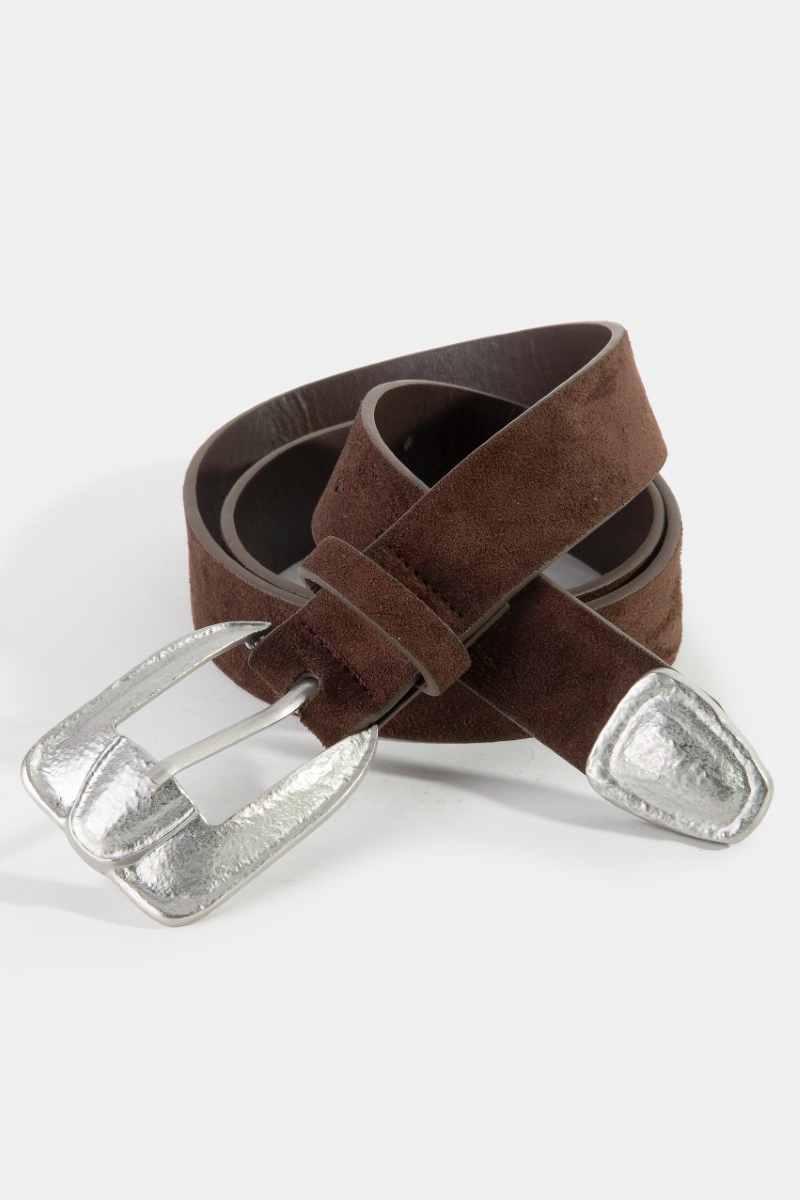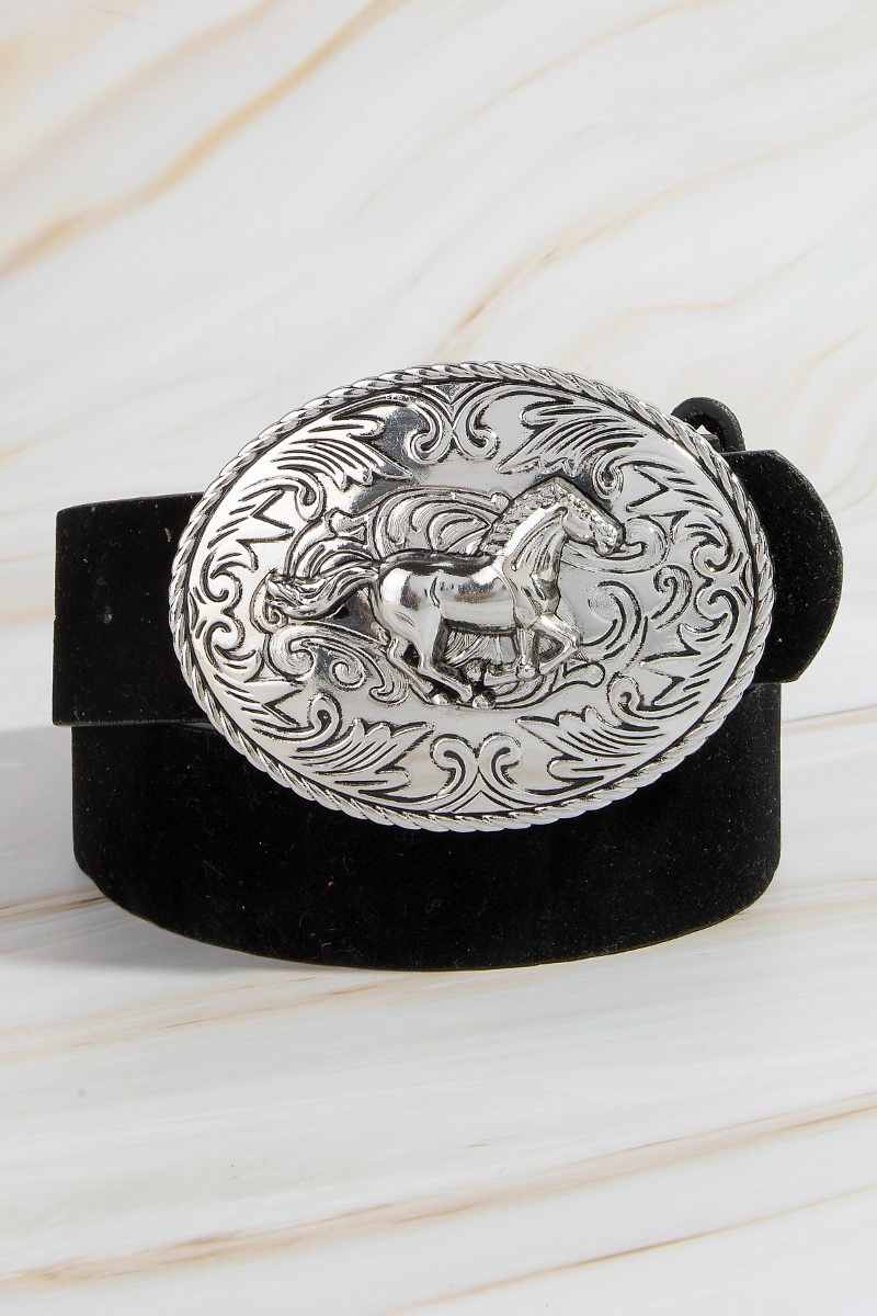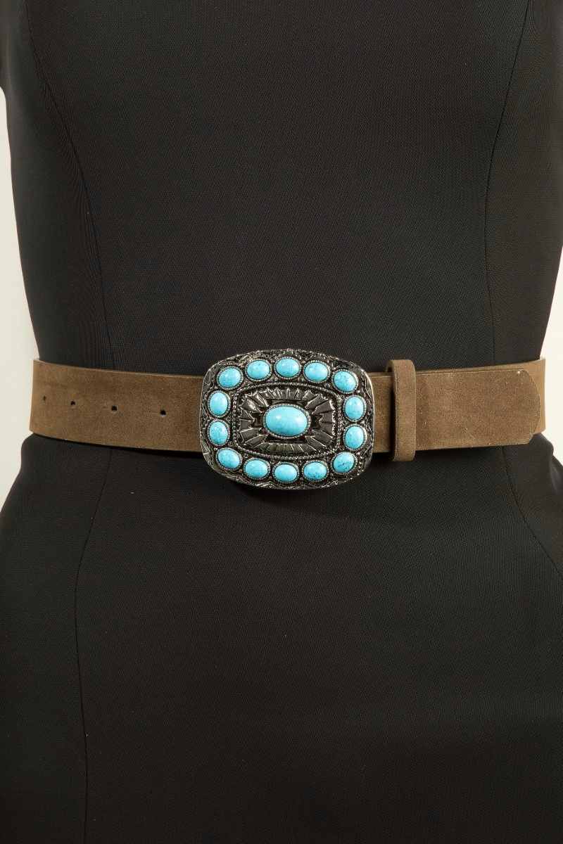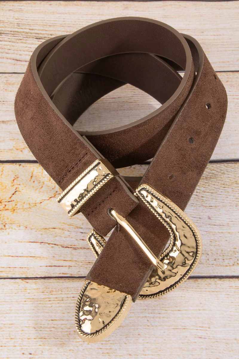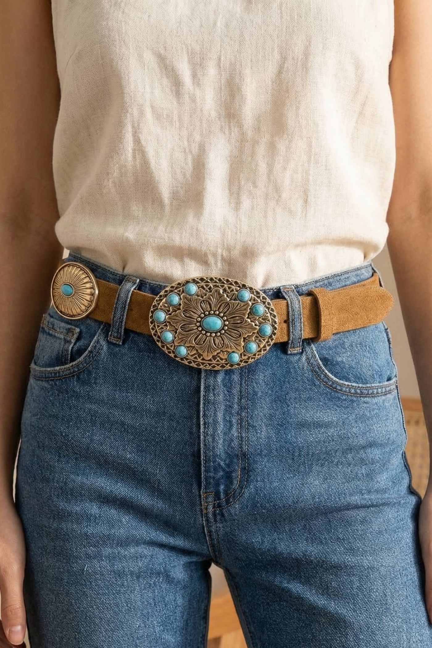 | Slim faux suede belts with ornate western-style alloy buckles. | |||