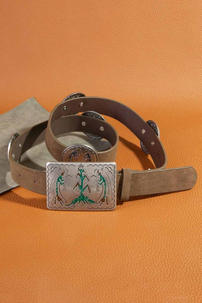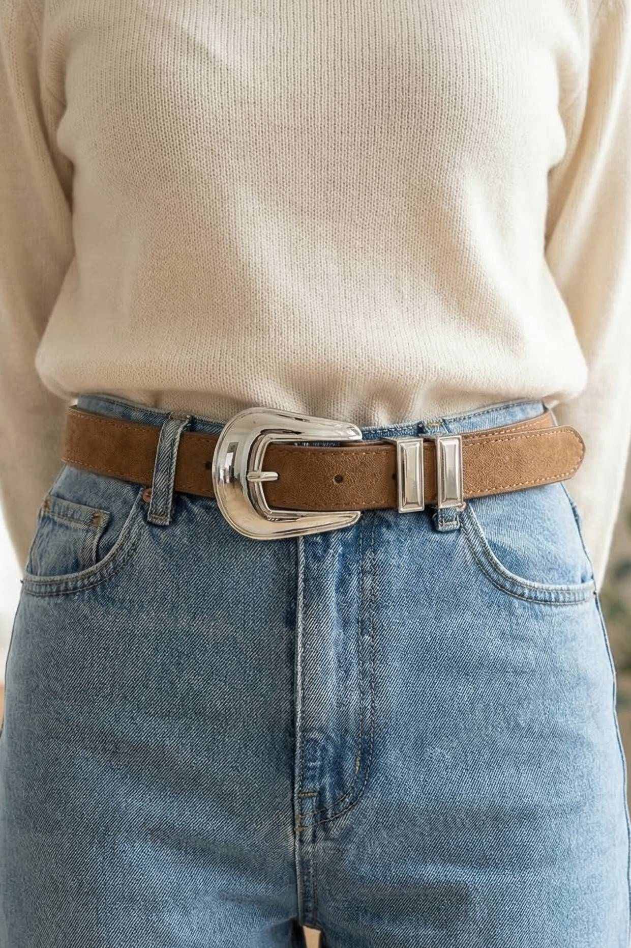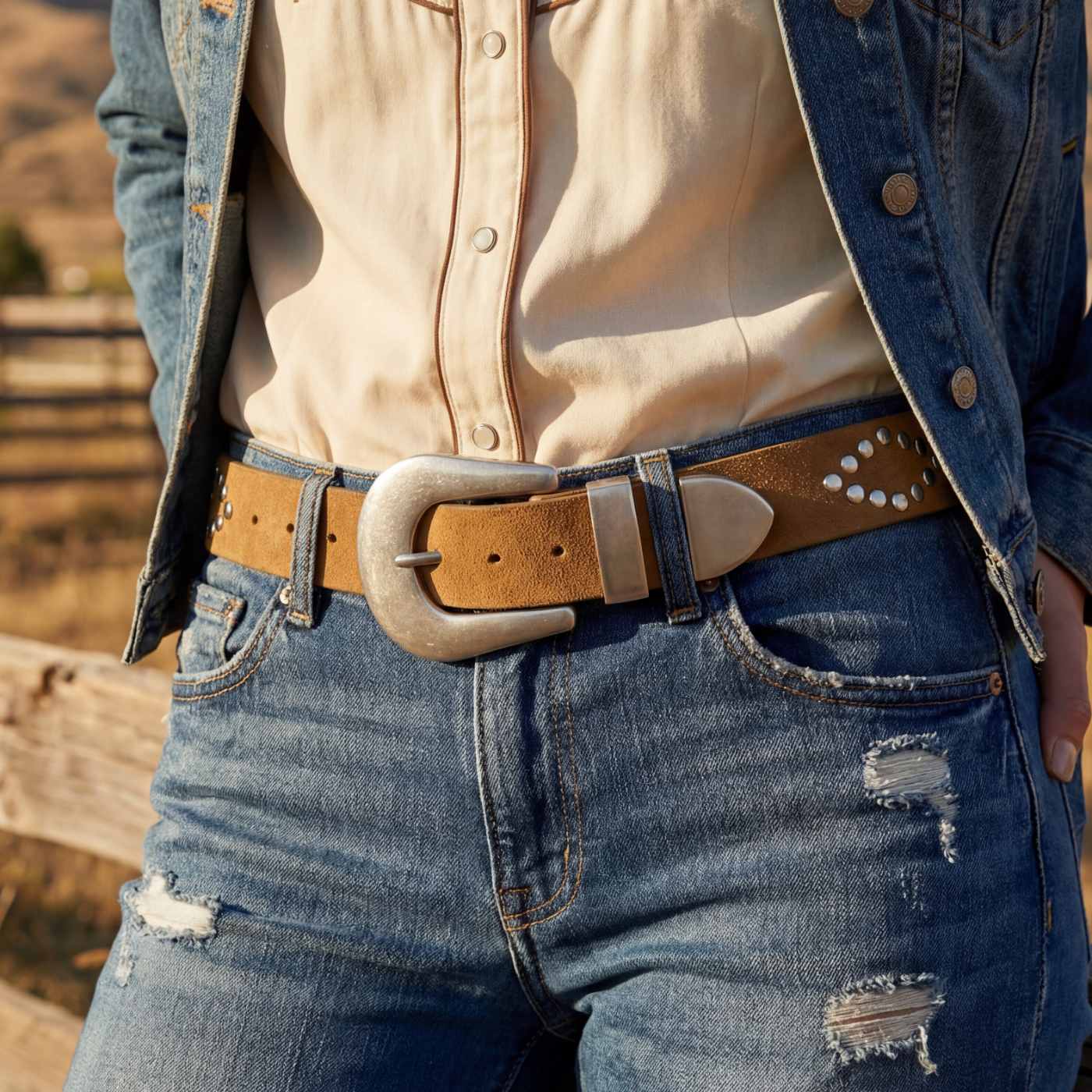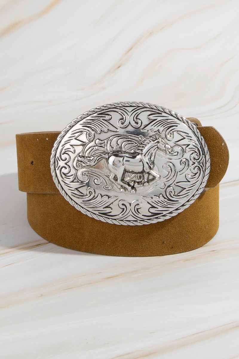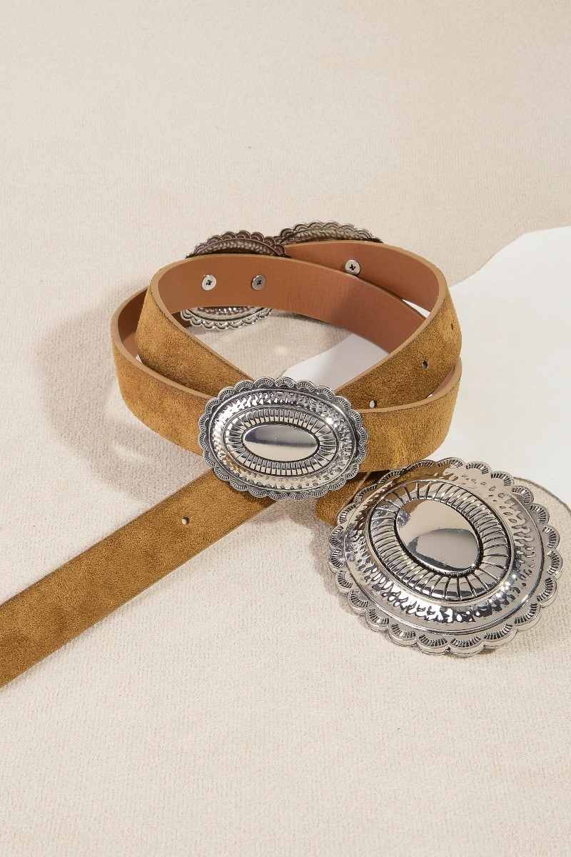 | Slim faux suede belts with ornate western-style alloy buckles. | |||