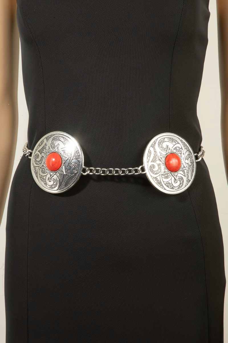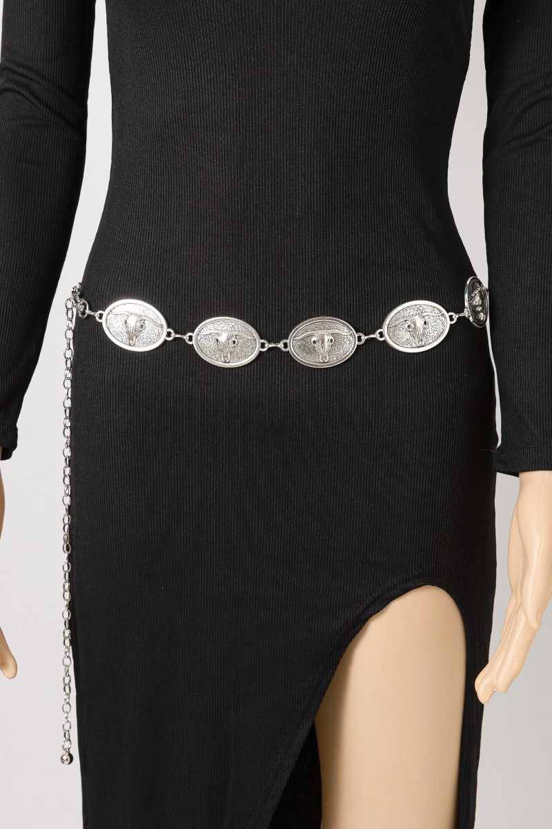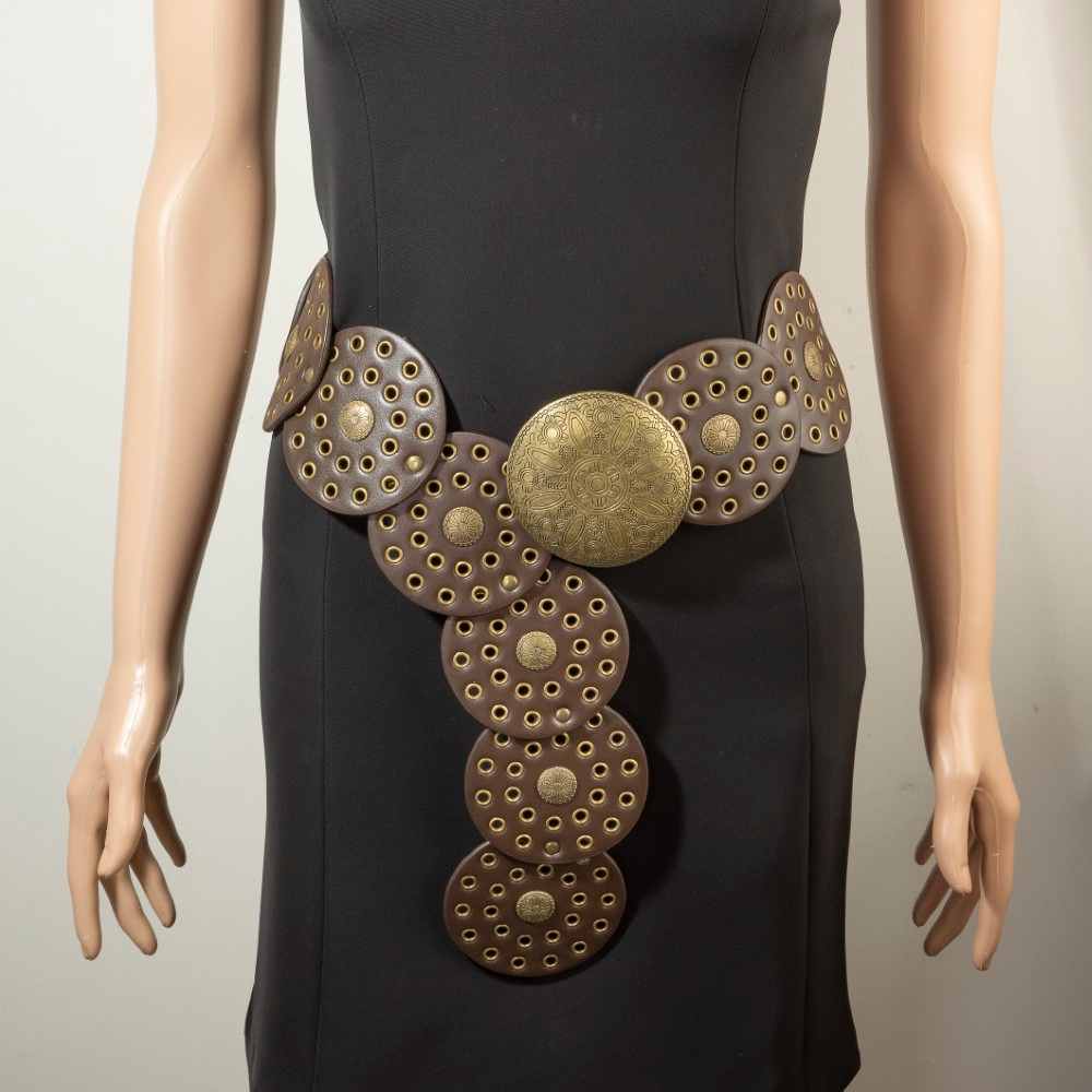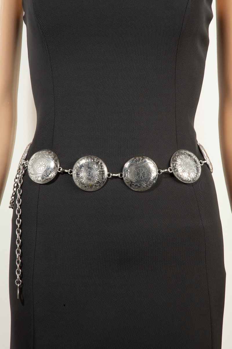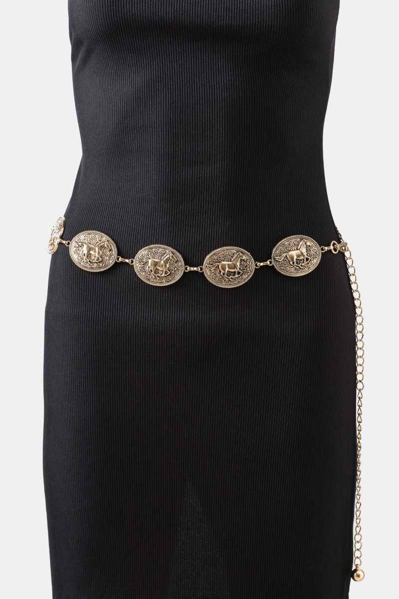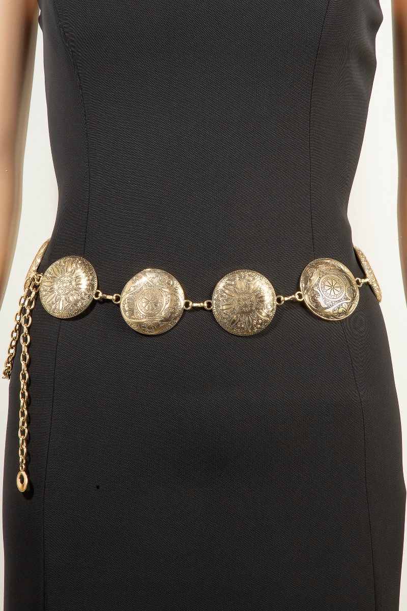 | Gold-tone alloy chain belt with oversized engraved medallion. | ||||