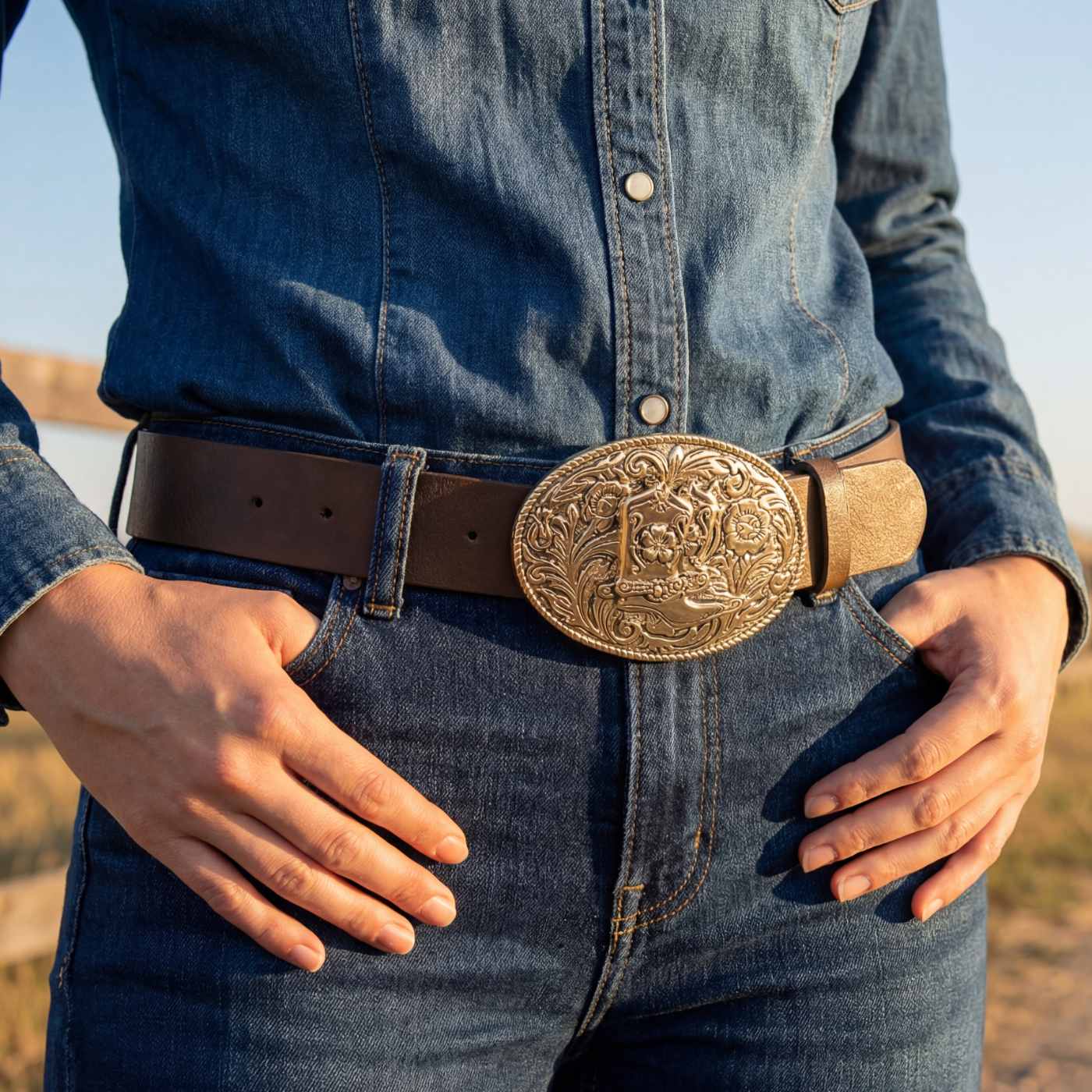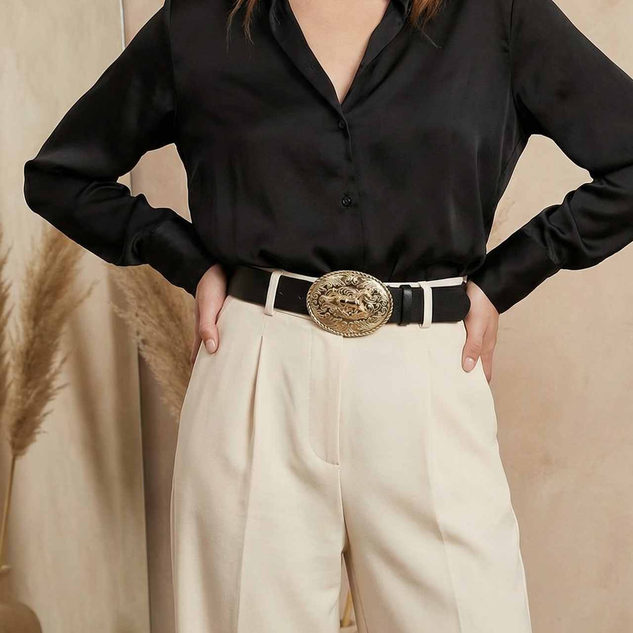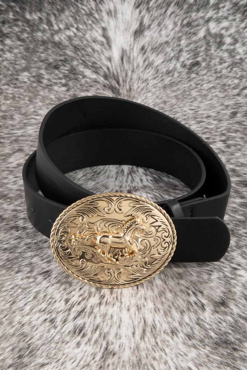 | Black bonded leather belt with large polished gold Western-style buckle. | |||||