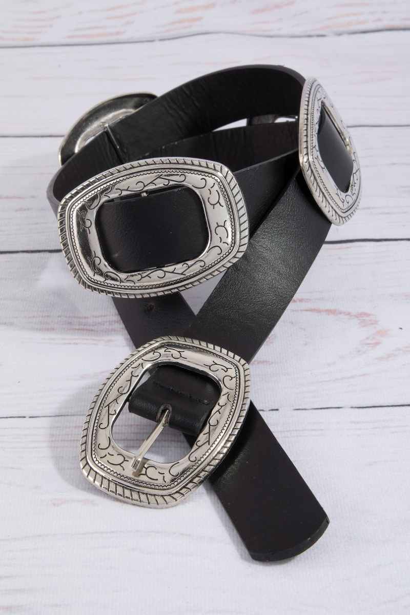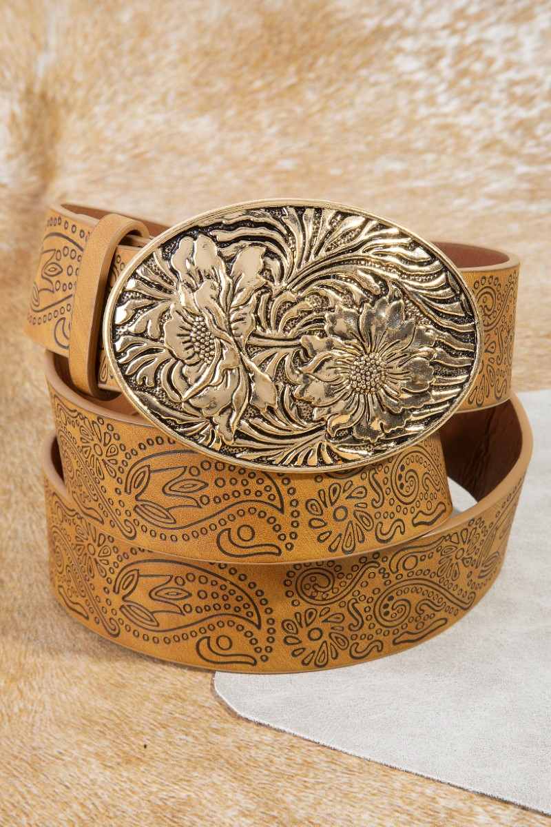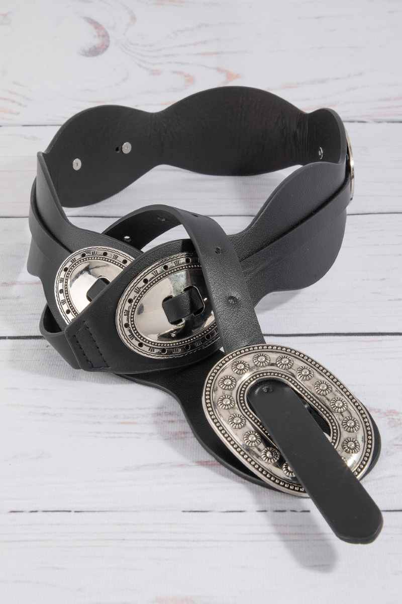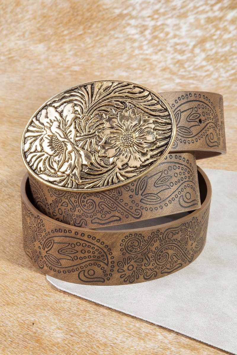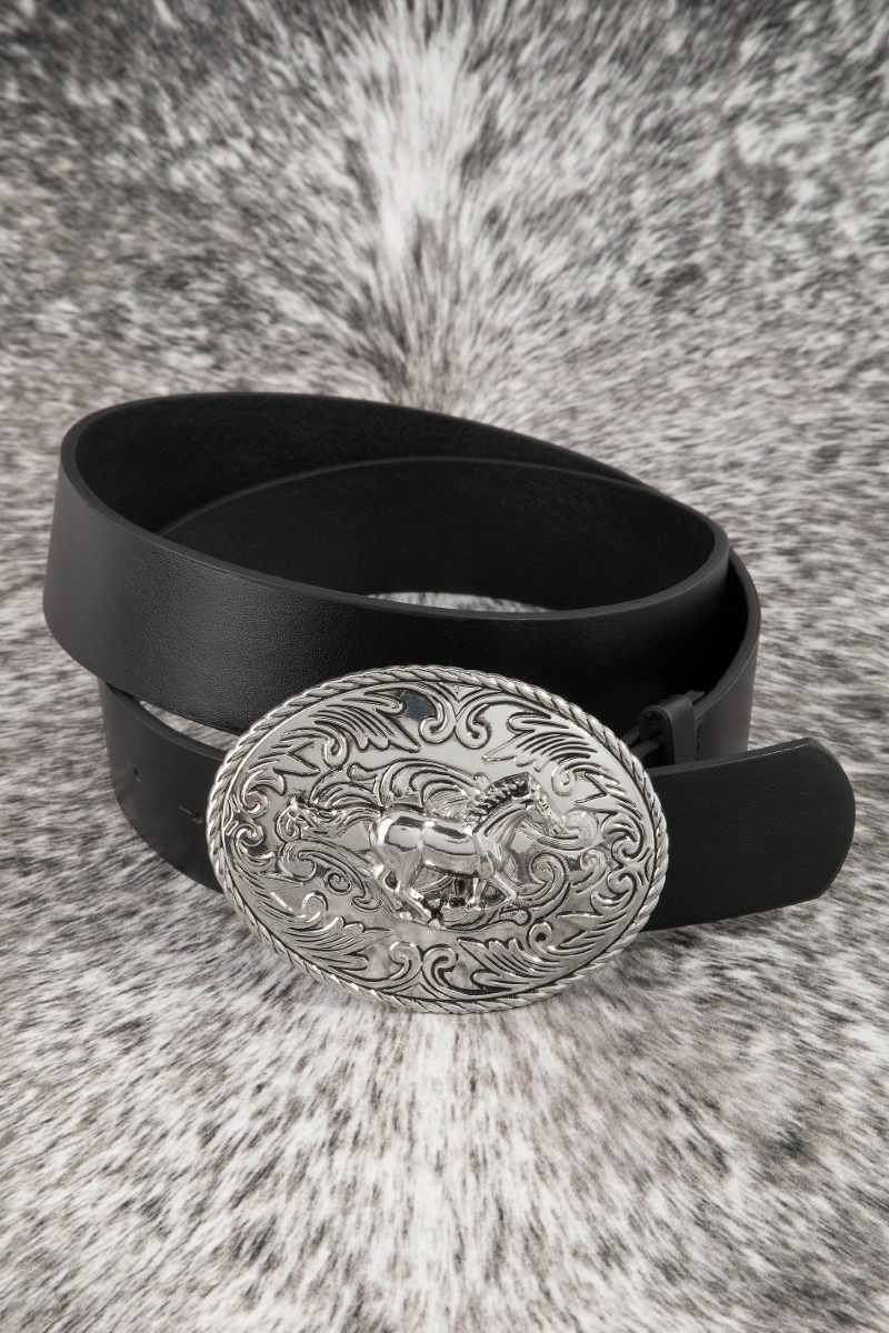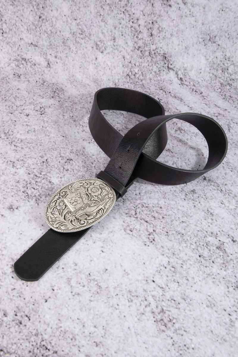 | Black PU belt with ornate antique brass-tone western. | |||||