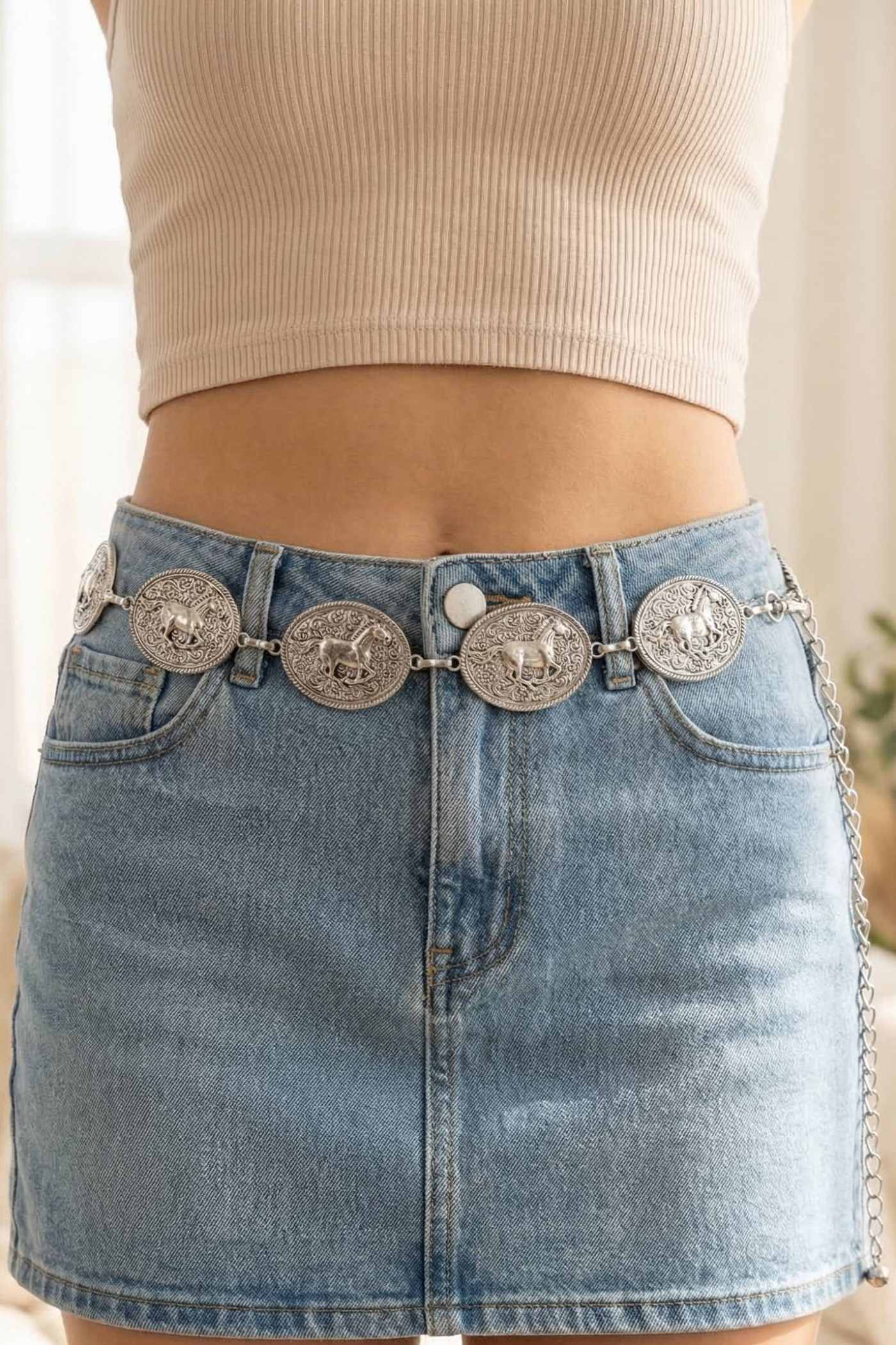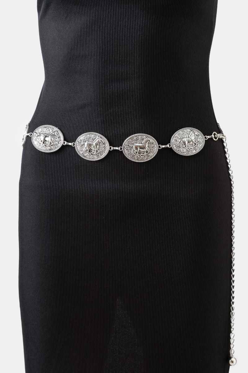 | ** Gold-tone alloy chain belt with engraved horse concho medallions. | |||