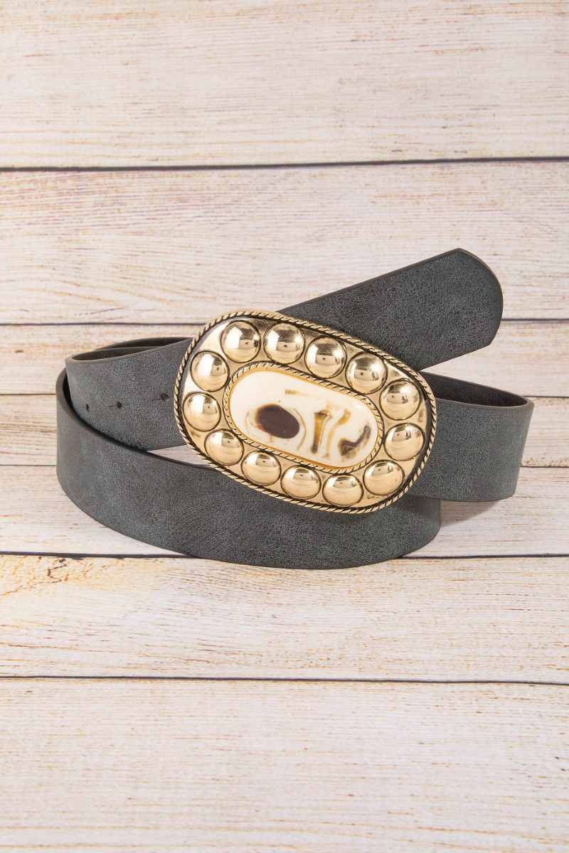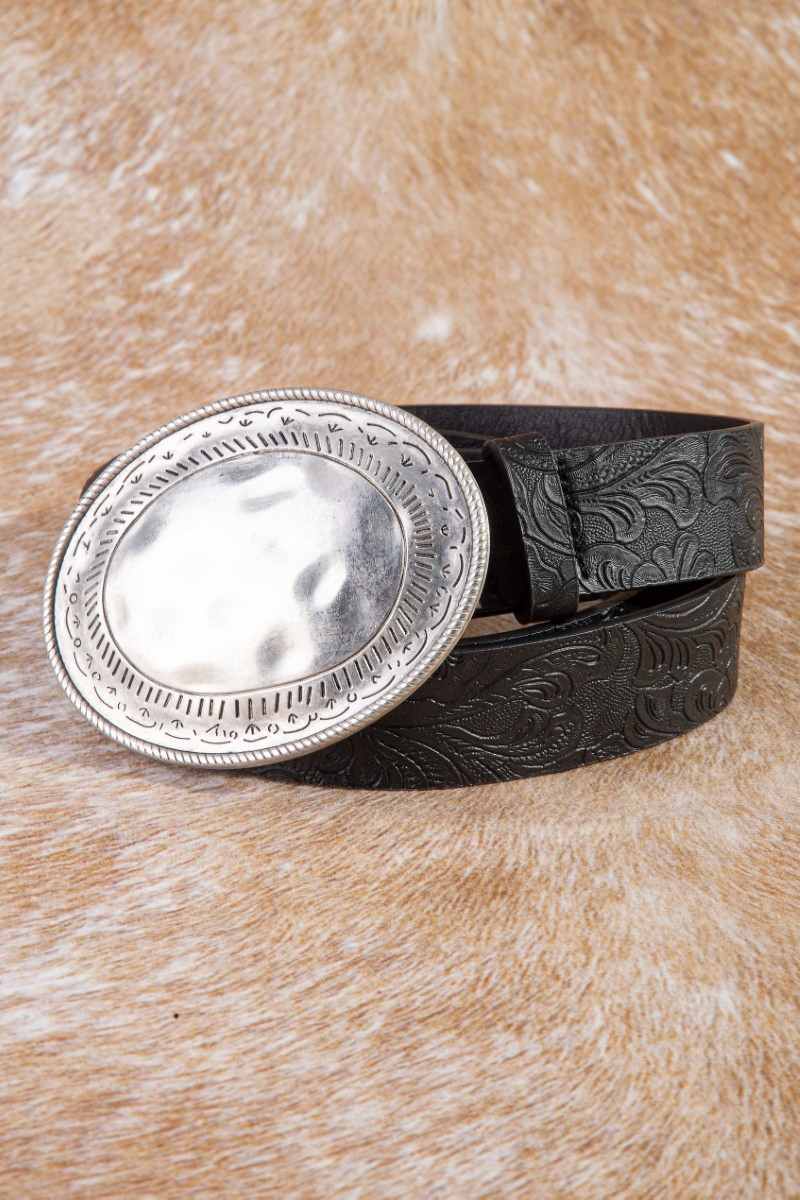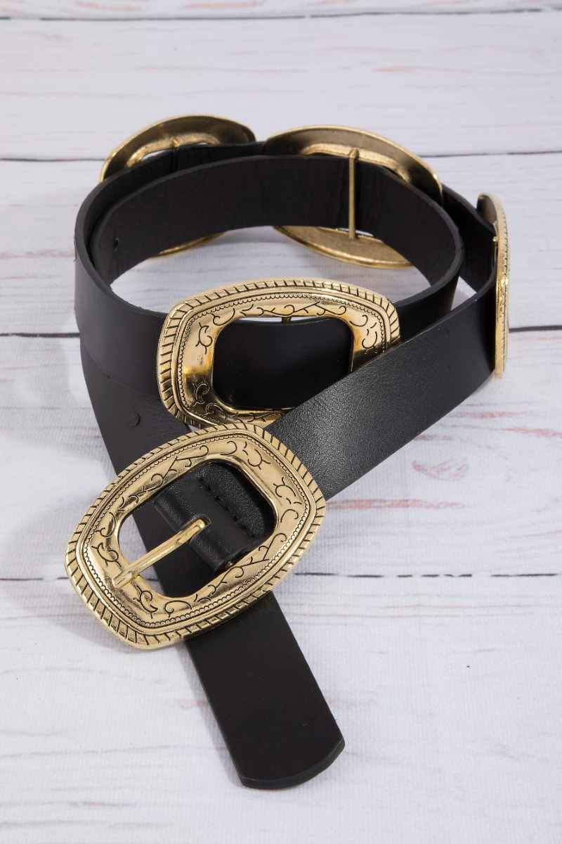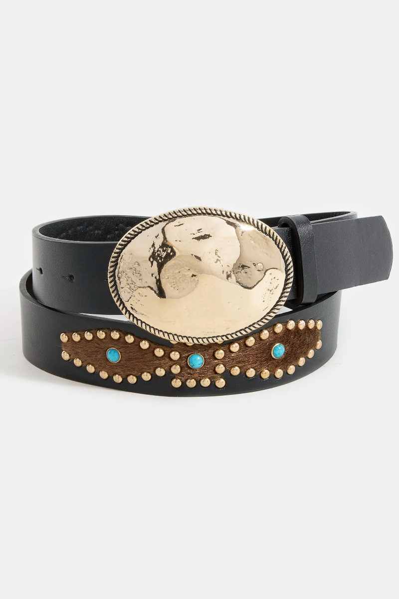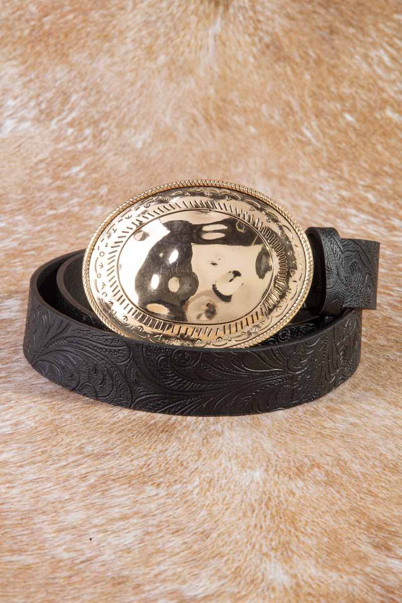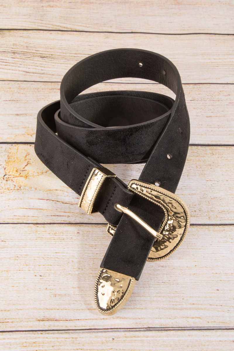 | Western black faux leather belt with hammered gold buckle. | ||||