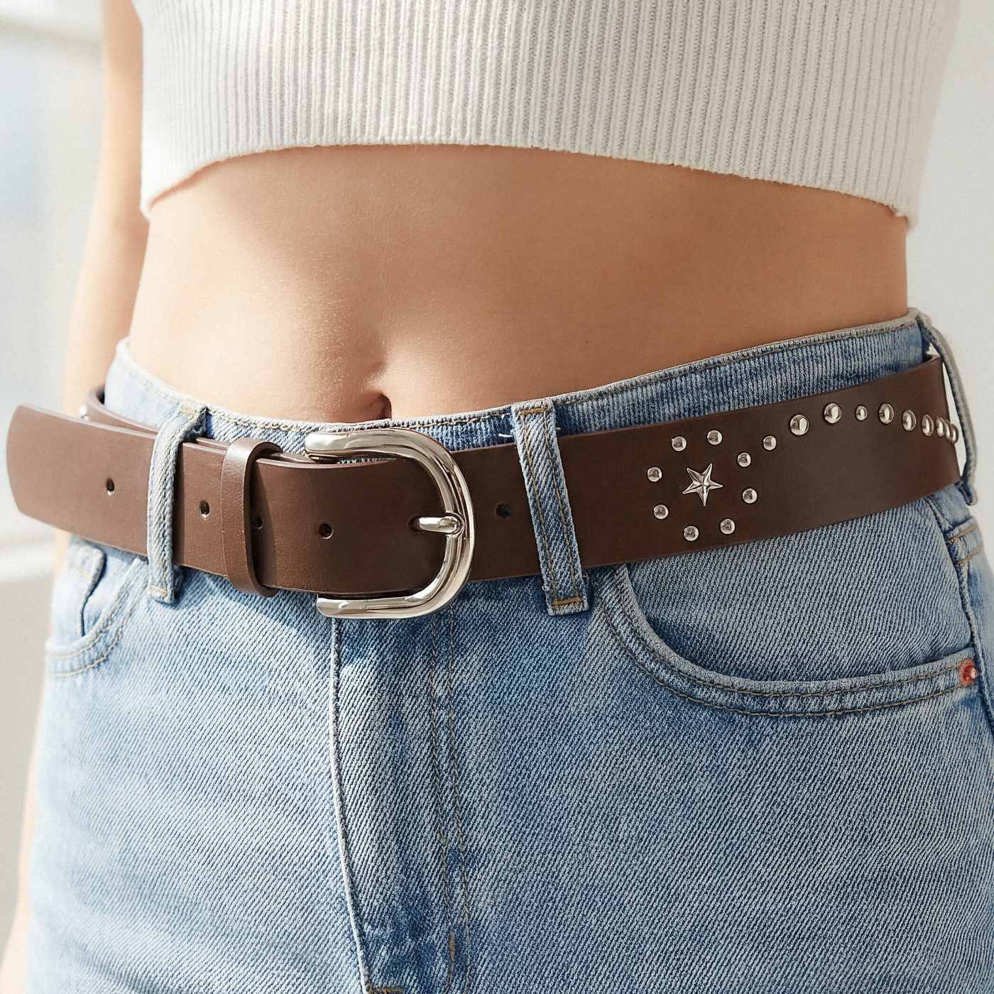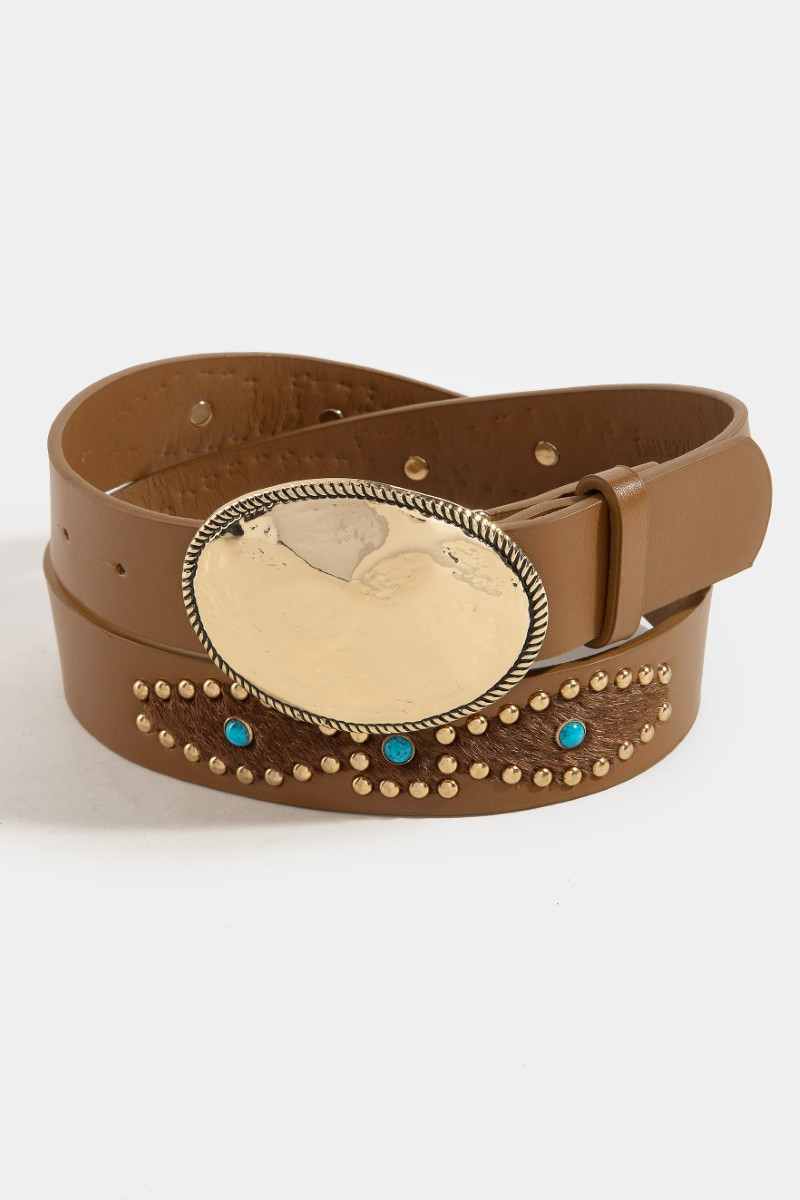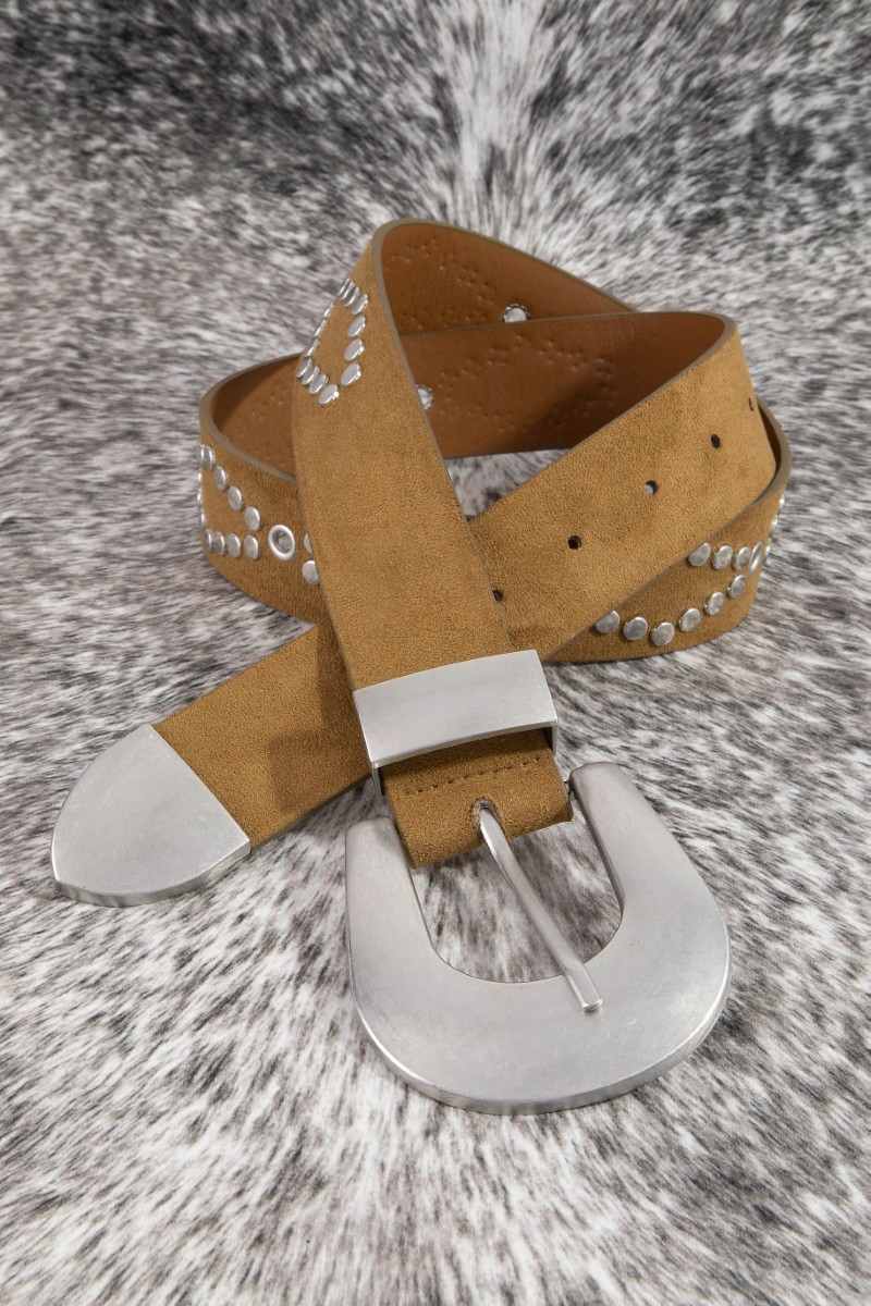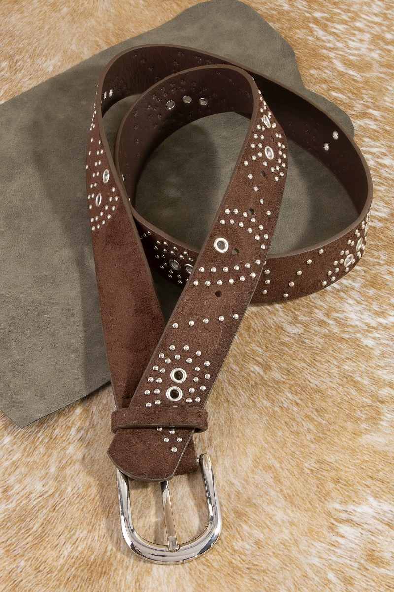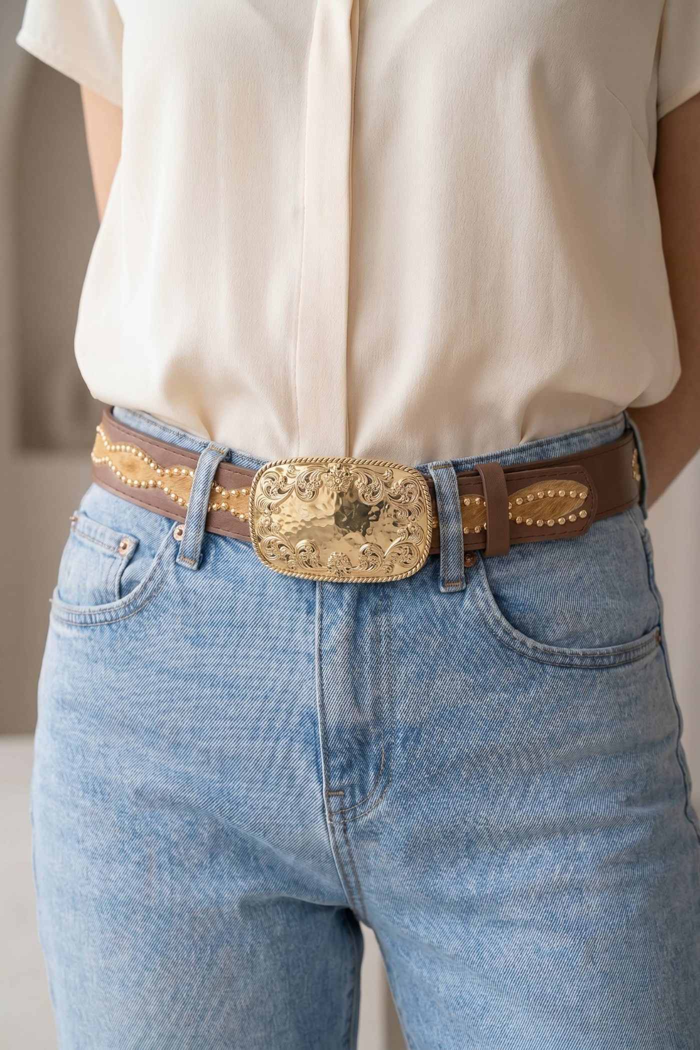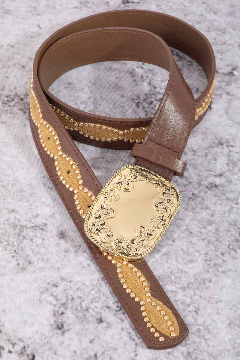 | Brown PU leather western belt with ornate antique gold buckle and studded. | |||||||||||