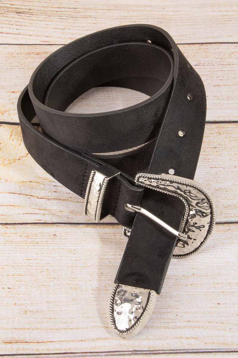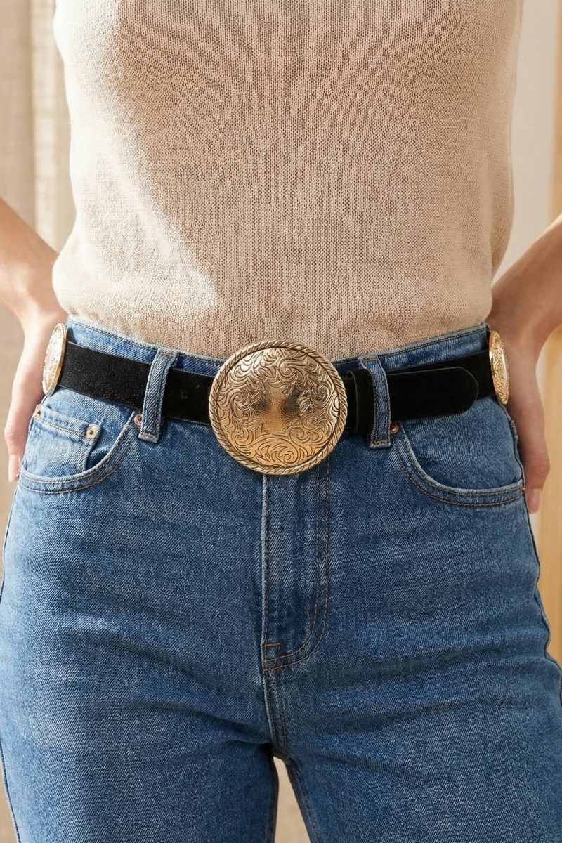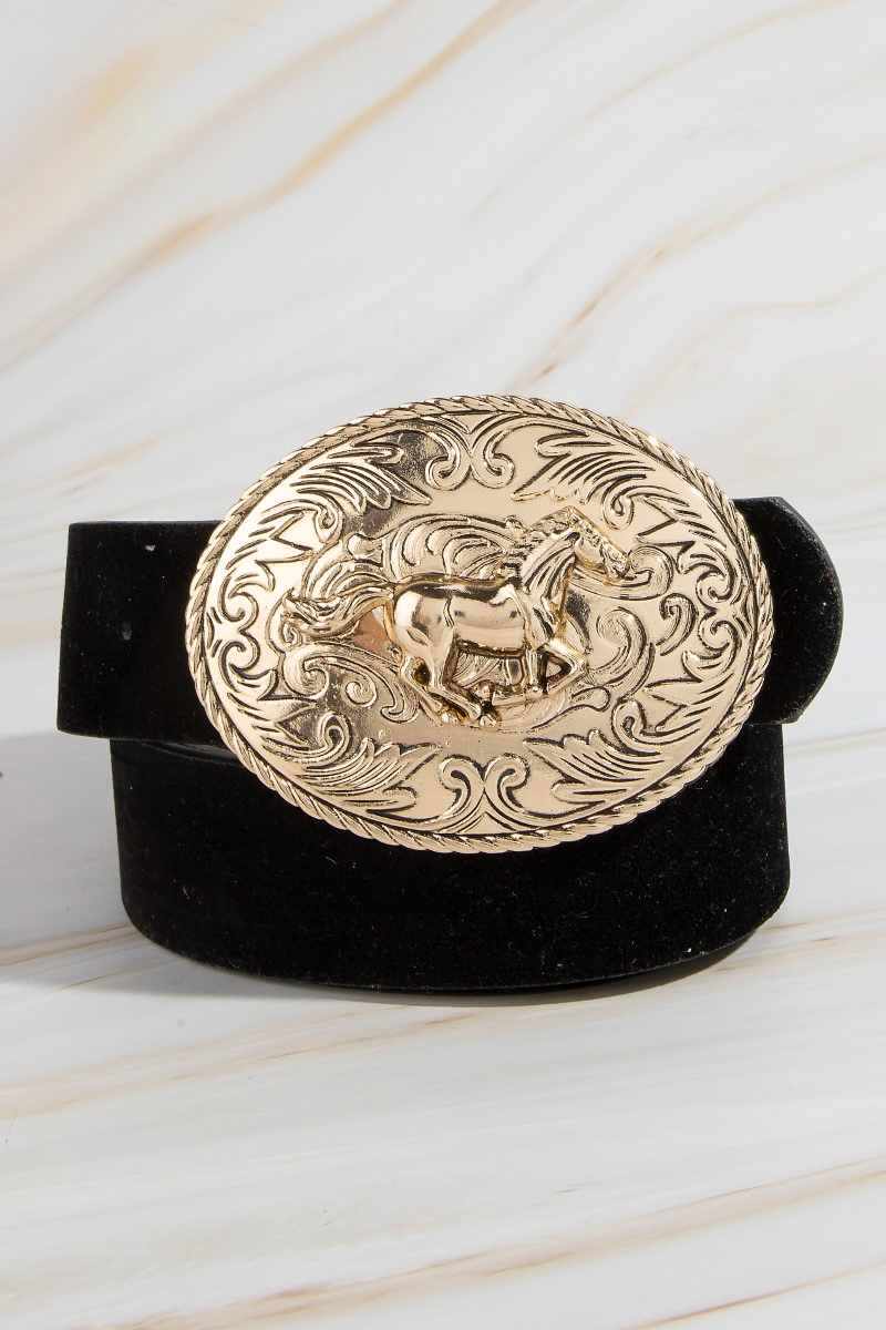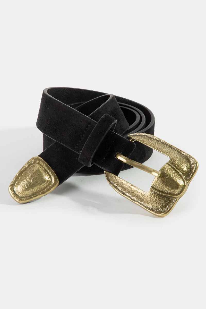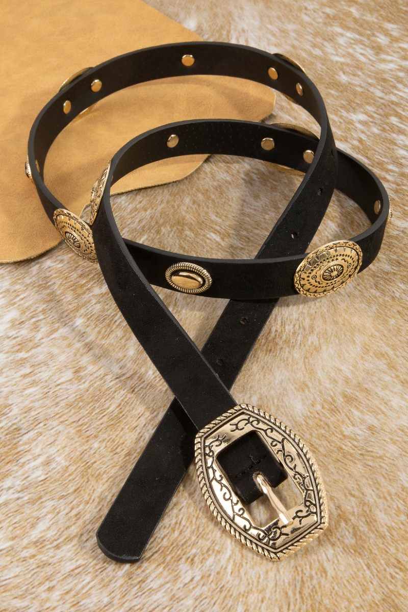 | Black faux suede Western belt with an engraved gold alloy. | |||||
