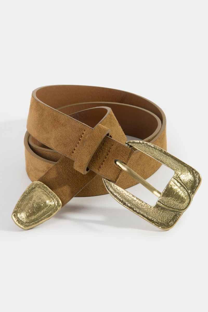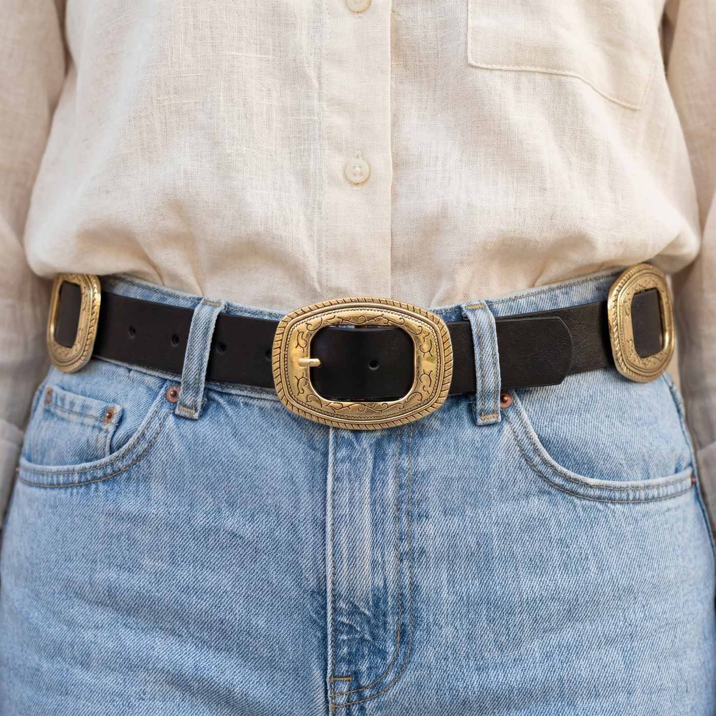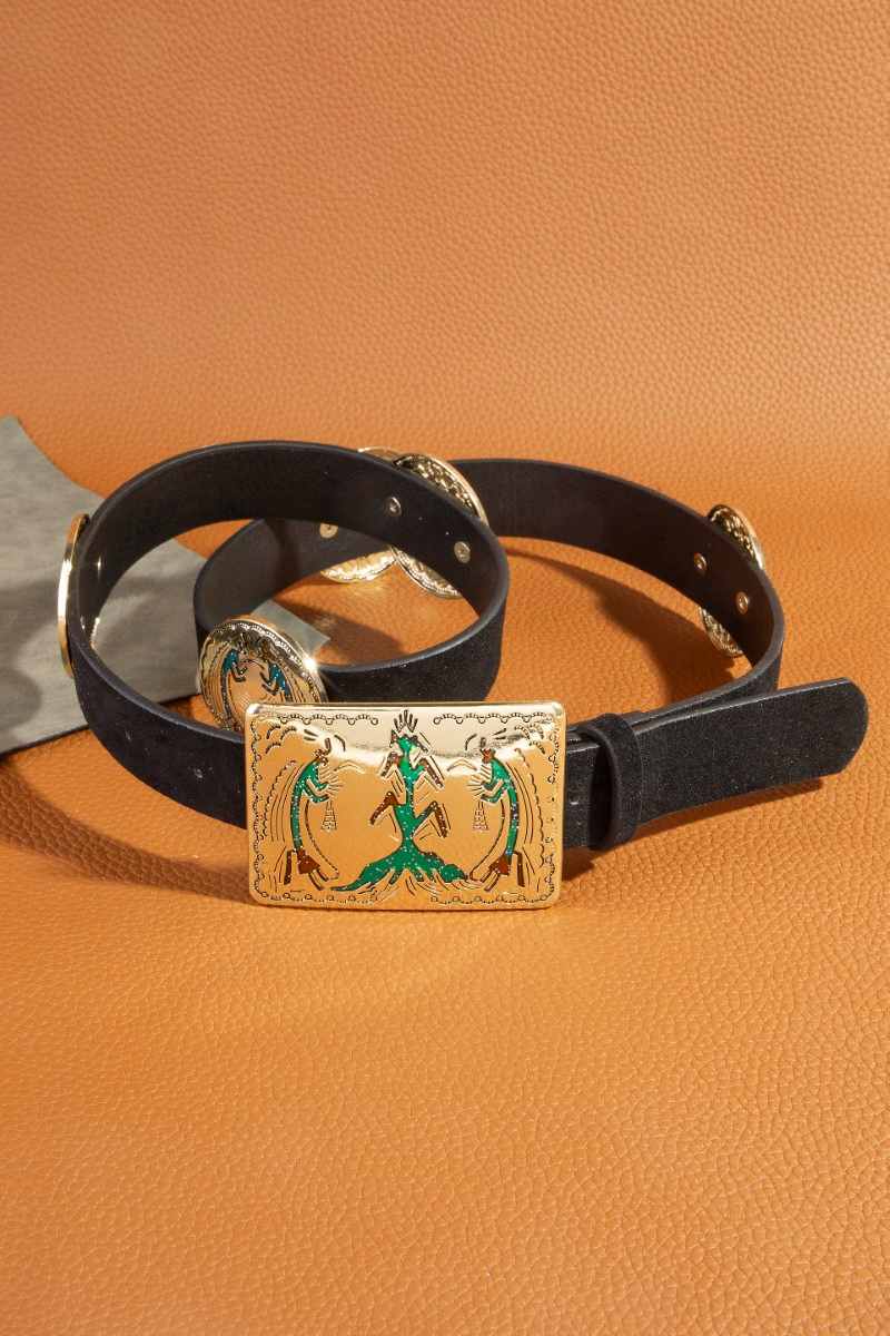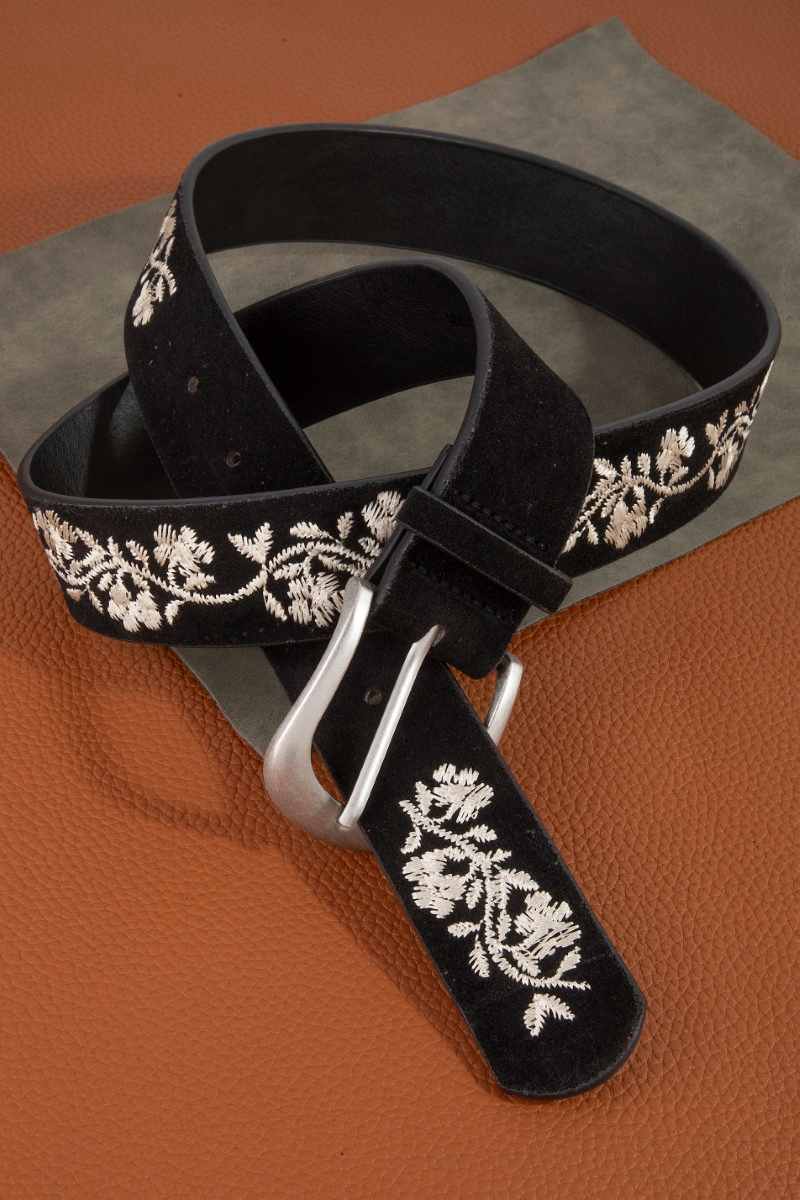 | Black faux suede Western belt with an engraved gold alloy. | |||||