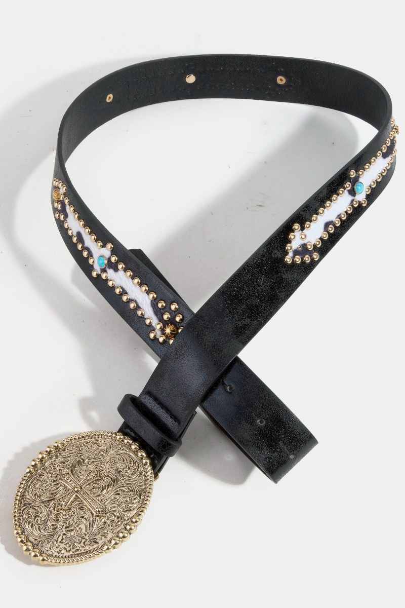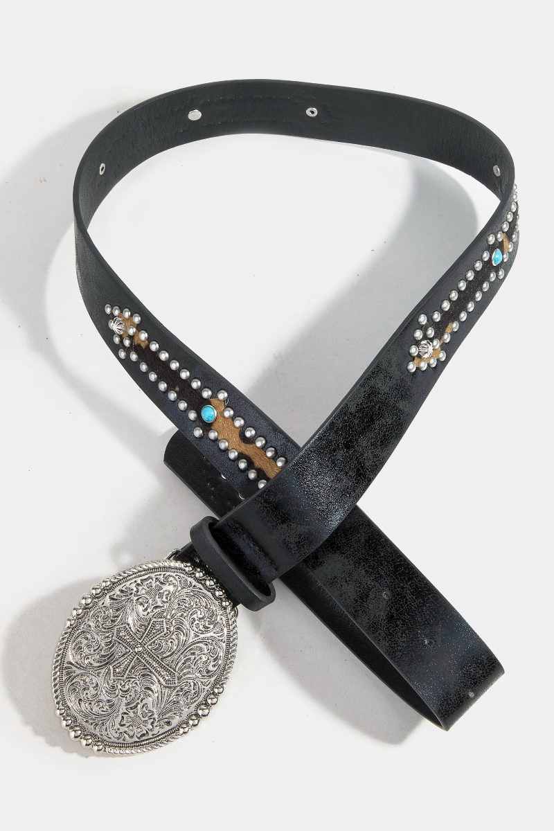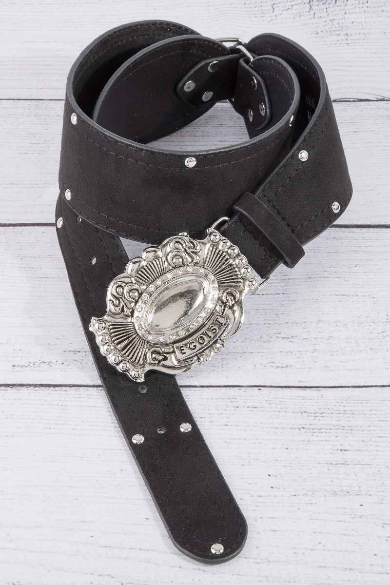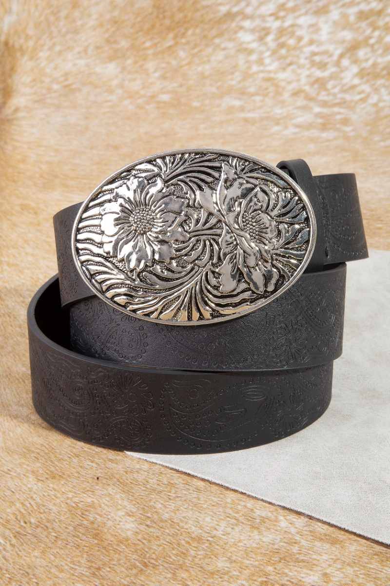| Black wide PU western belt with ornate floral buckle and gold studs. | ||||