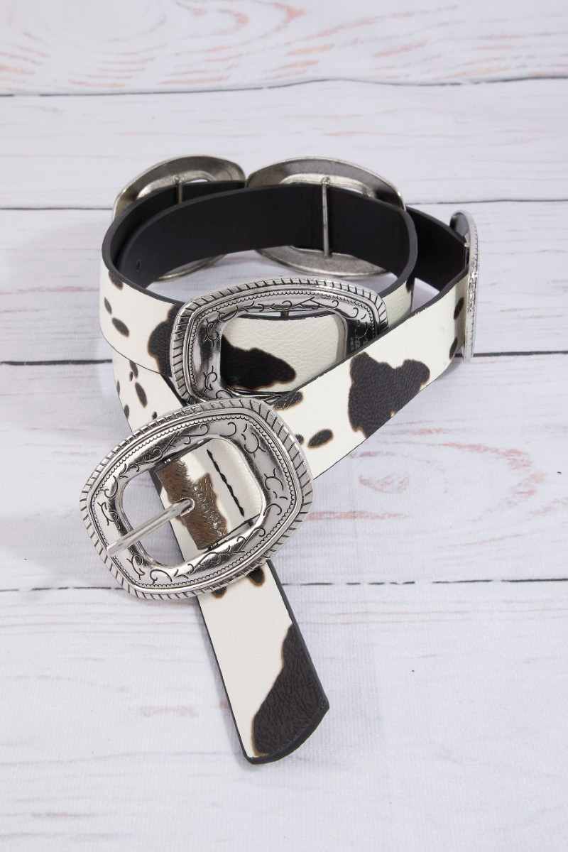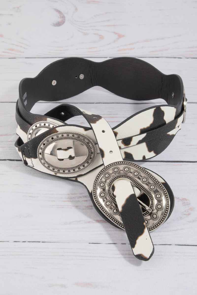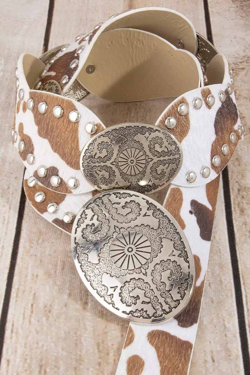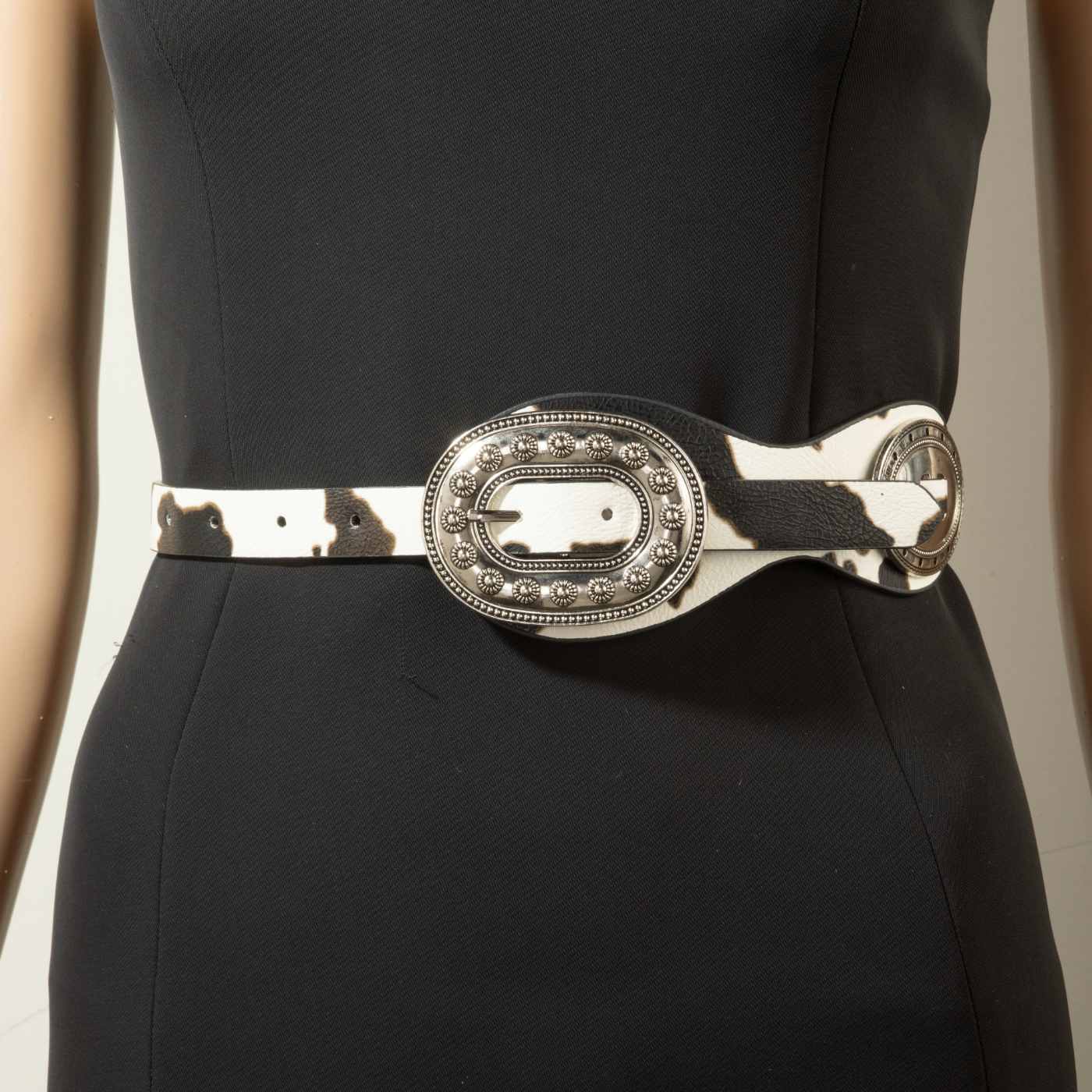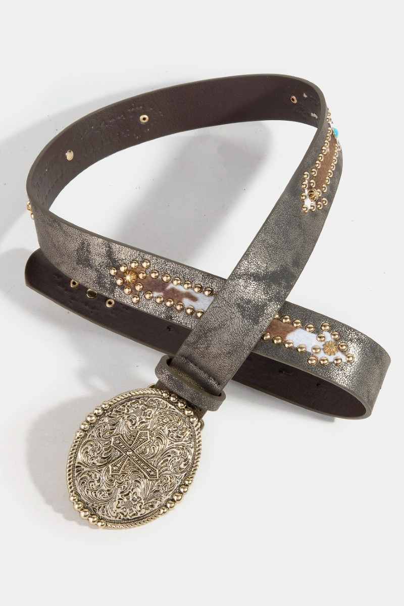 | Black PU western belt with ornate gold buckle, studded faux cow. | ||||