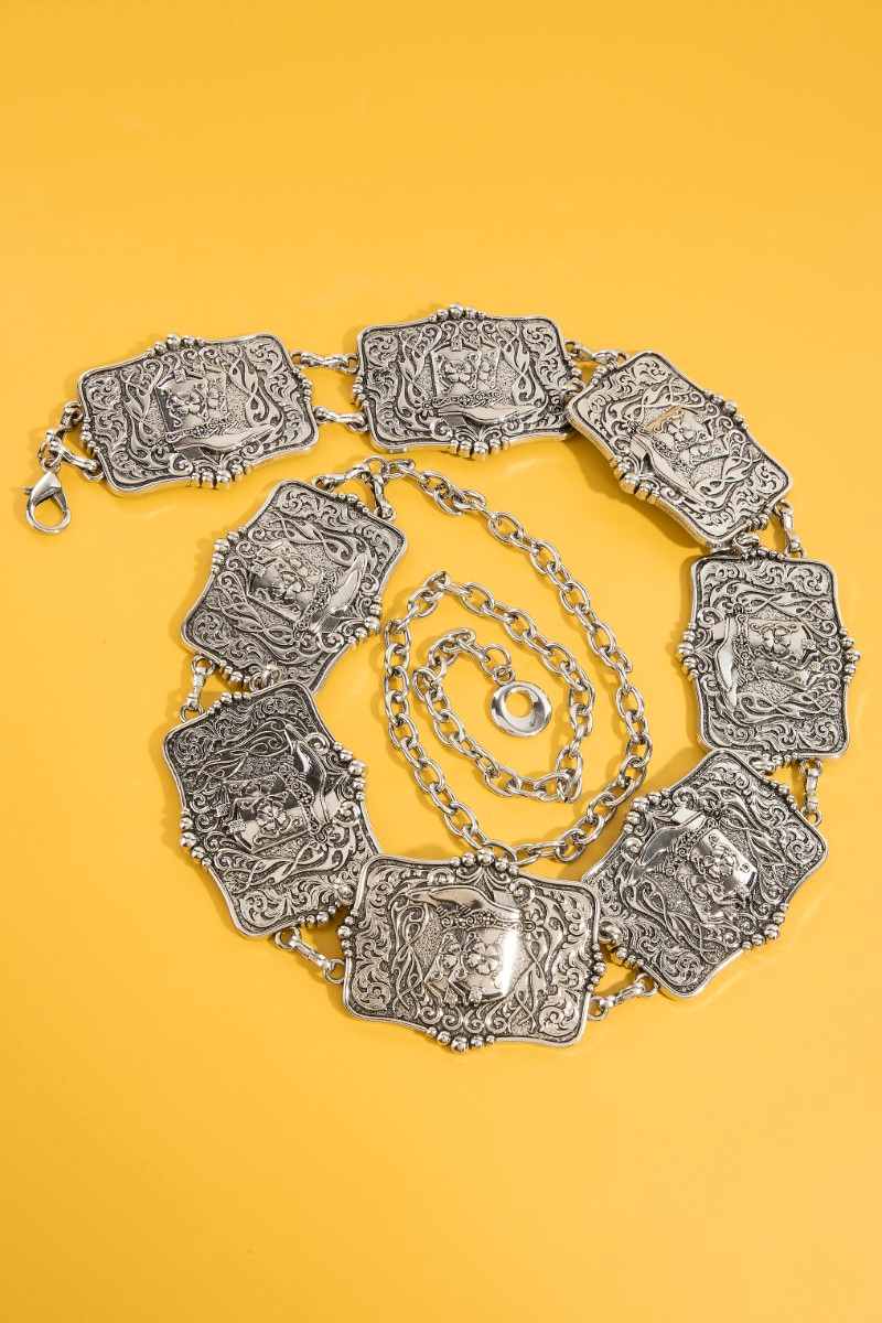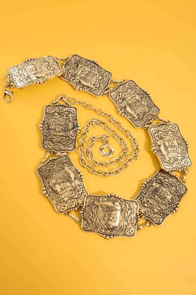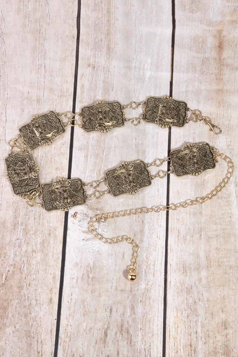 | Antique gold alloy chain belt featuring ornate rectangular embossed. | |||